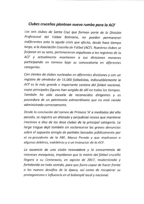 La dirigencia de los seis clubes profesionales se pronuncióÂ ante la complicada situación que vive la Asociación Cruceña de Fútbol desde hace algún tiempo. Piden reconducir el rumbo del ente asociacionista.