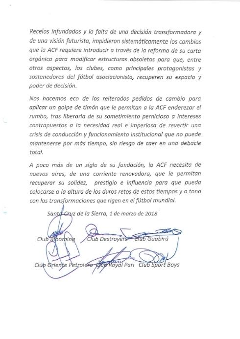 «Con cientos de clubes nucleados en diferentes divisiones y con un registro de alrededor de 15.000 futbolistas, indiscutiblemente la ACF es la más grande e importante cantera del fútbol nacional, cuyas principales figuras han surgido de allí en todos los tiempos. También ha sido escuela de reconocidos dirigentes y es poseedora de un patrimonio extraordinario que no está siendo administrado correctamente», dice parte del escrito, que lleva la firma de los representantes de los seis clubes profesionales.