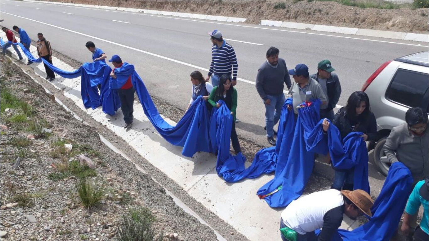 El despliegue de la bandera de reivindicación marítima comenzó en la doble vía que une a La Paz con Oruro. Soldados y algunos funcionarios de instituciones públicas extienden los grandes retazos de tela azul y los unen para tener todo listo para mañana.