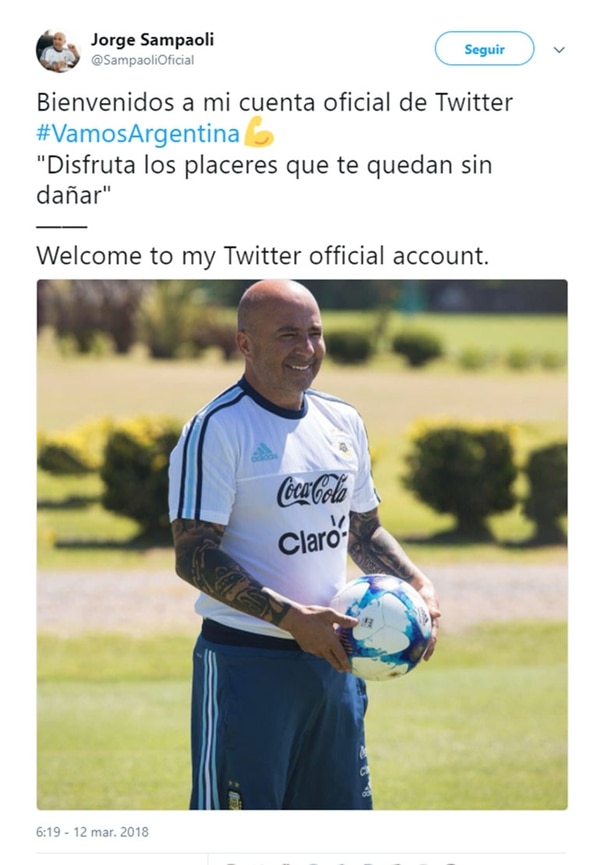 «Bienvenidos a mi cuenta oficial de Twitter #VamosArgentina», escribió Sampaoli y agregó la frase «Disfruta los placeres que te quedan sin dañar». Esta última oración es una línea de la canción «Porco Rex», perteneciente al disco del mismo nombre que el Indio Solari lanzó en el 2007 junto a Los Fundamentalistas del Aire Acondicionado.