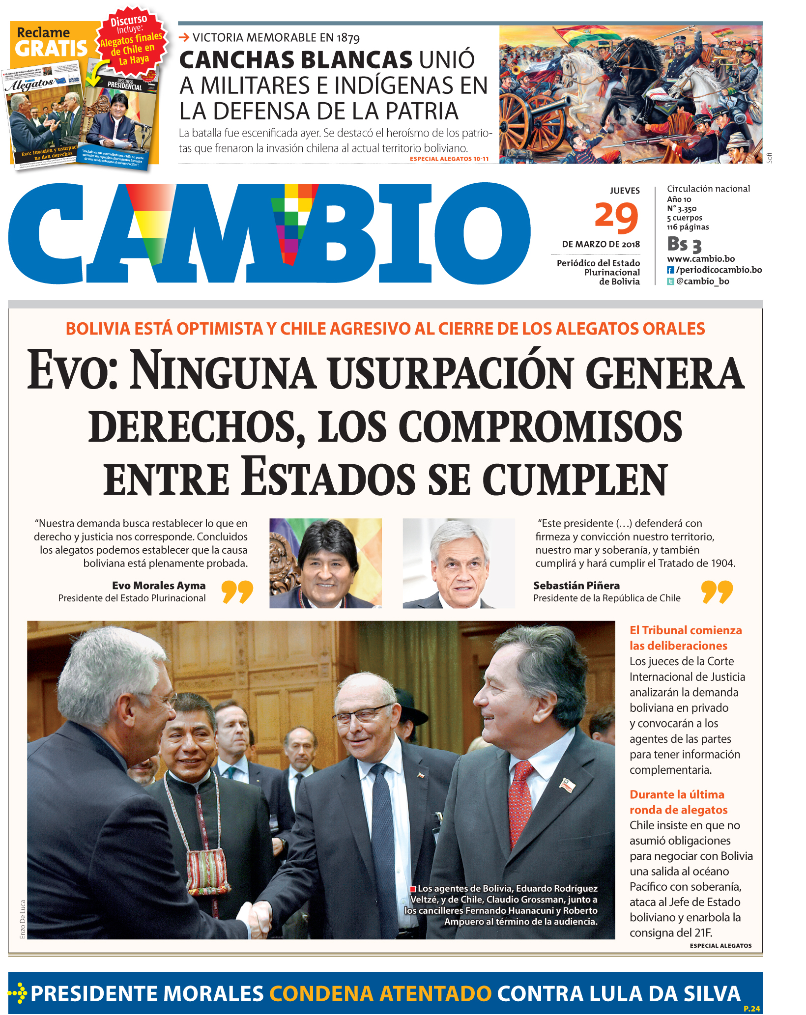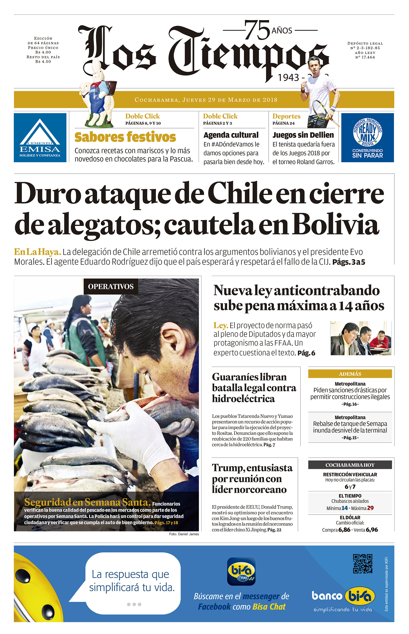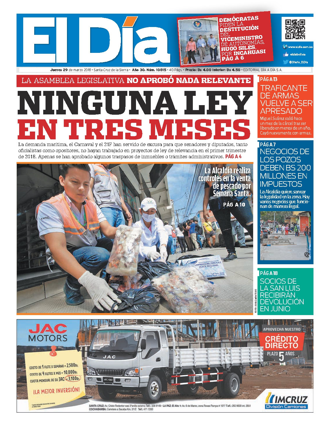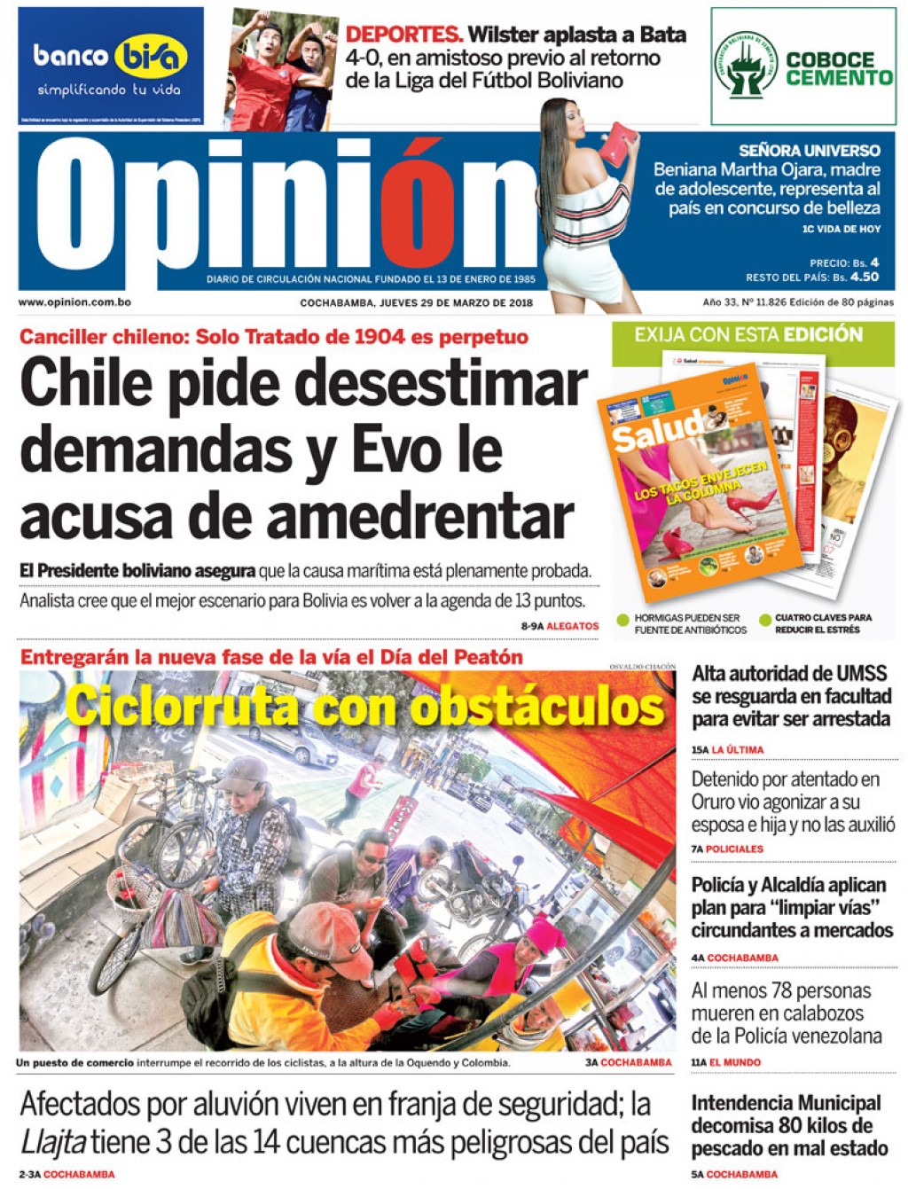 Portadas de periódicos de Bolivia del jueves 29 de marzo de 2018Categorías MonitoreoEtiquetas , Portadas de periódicos 29/03/2018 El Deber – Los Tiempos – El Día – La Razón – Cambio – El Diario – Página Siete – Opinión