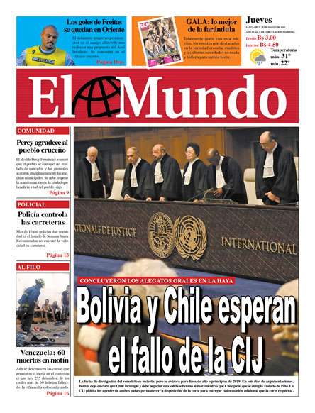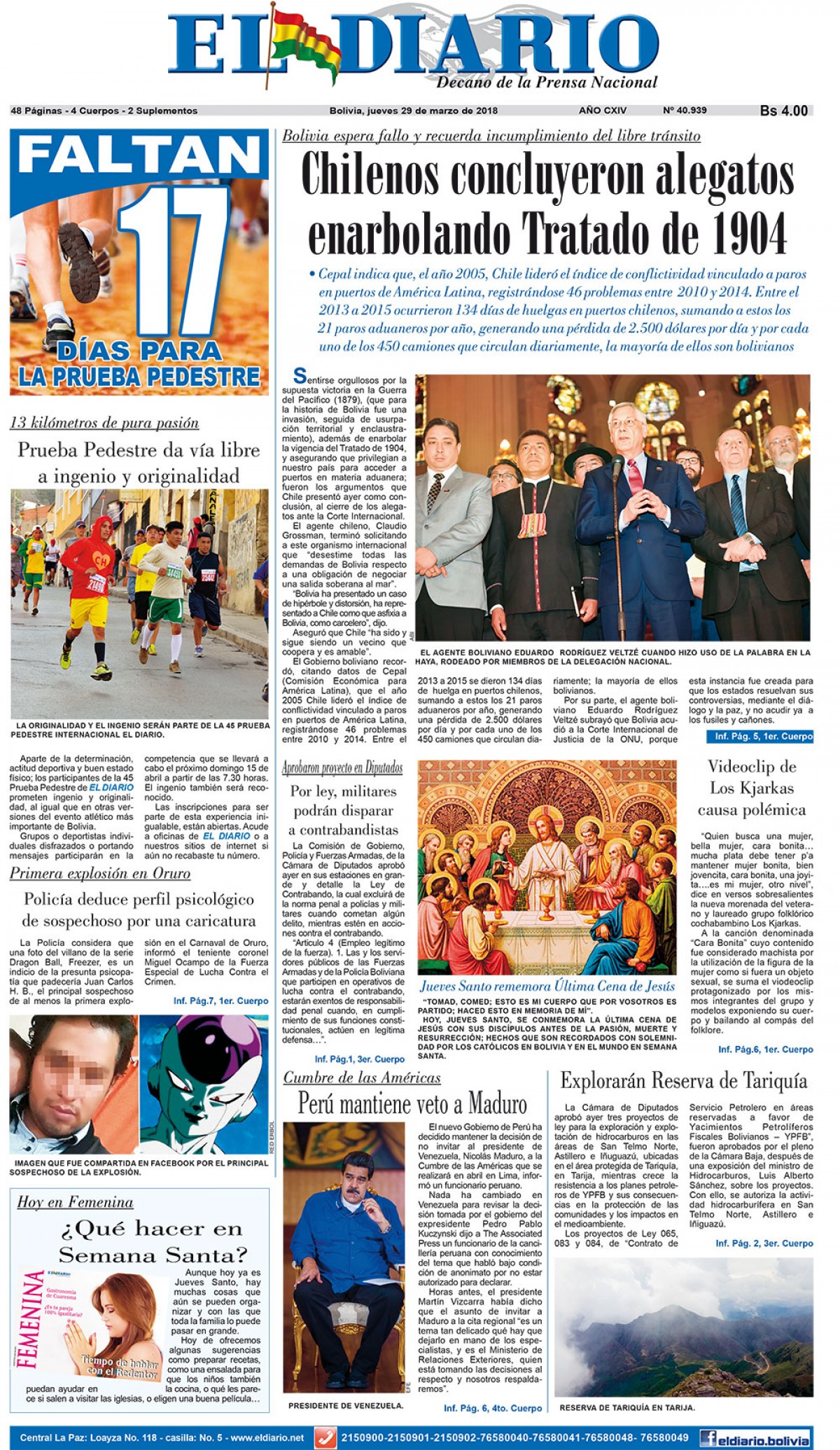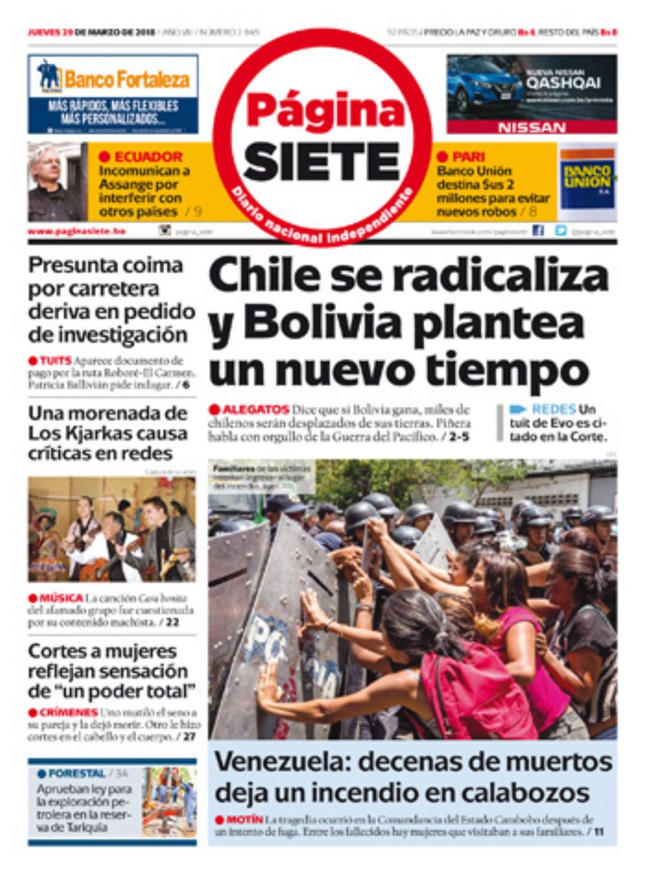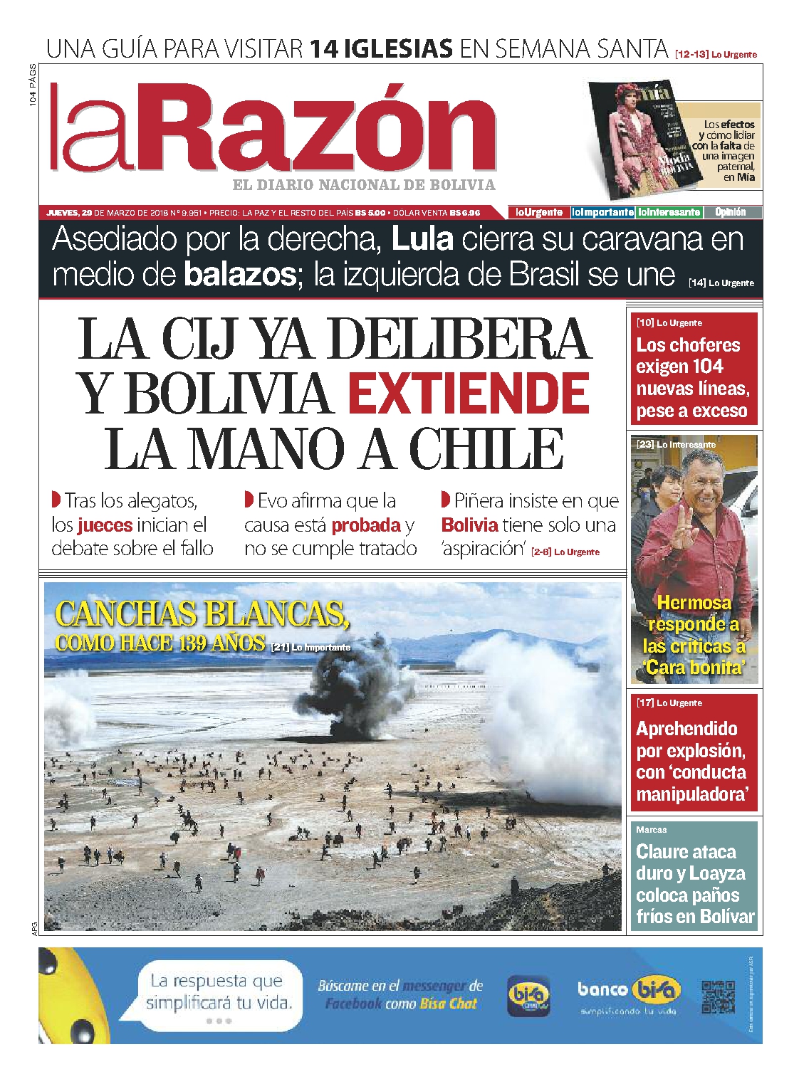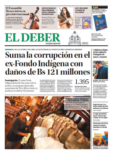 Portadas de periódicos de Bolivia del jueves 29 de marzo de 2018Categorías MonitoreoEtiquetas , Portadas de periódicos 29/03/2018 El Deber – Los Tiempos – El Día – La Razón – Cambio – El Diario – Página Siete – Opinión