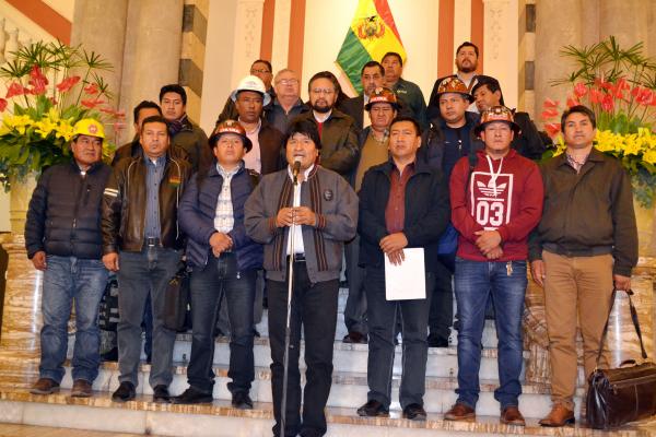 El presidente Evo Morales, junto a la dirigencia de la COB en el Palacio de Gobierno, tras el acuerdo salarial. Foto: ABI.