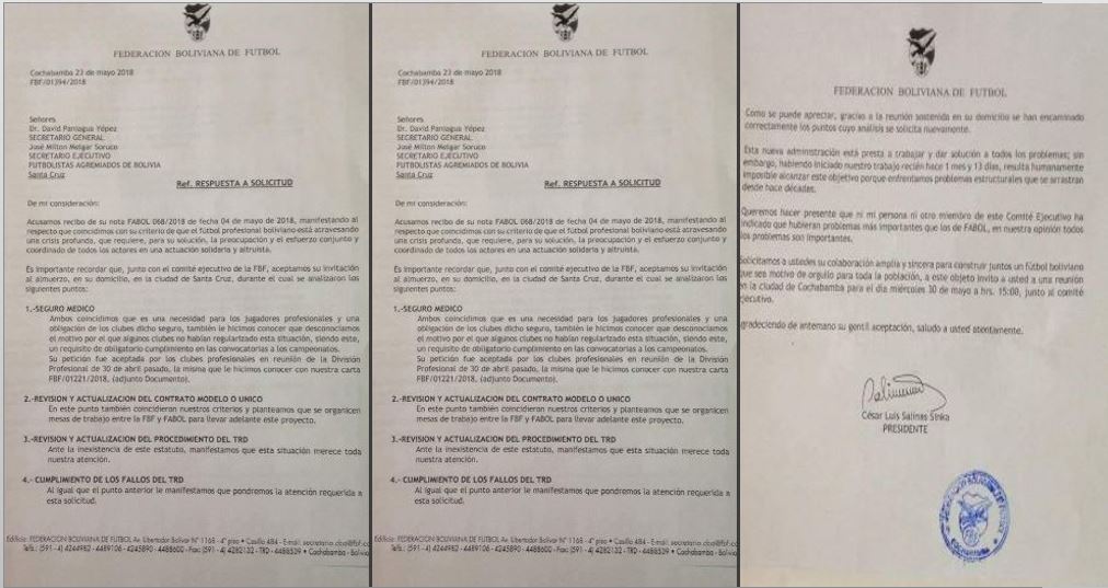 La FBF envió en las últimas horas una nota a Fabol que fue publicada en redes sociales en la que acepta debatir los temas en conflicto y solicita que esta agremiación autorice a los jugadores de los clubes profesionales presentarse en los partidos programados.