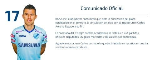 «Baisa y el Club Bolívar comunican que ante la finalización del plazo establecido en el contrato, del club con el jugador Juan Carlos Arce ha llegado a su fin. Las campañas del Conejo en filas académicas se reflejan en 244 partidos oficiales disputados, 76 goles marcados y 88 asistencias concedidas. Agradecemos a Juan Carlos por todo lo que ha brindado en los años en que ha vestido la camiseta celeste», informó el club celeste en su sitio oficial.