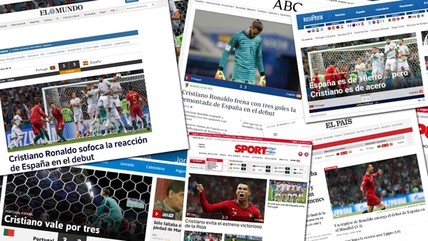 Otros portales que abracan otros temas además de los deportivos fueron El país, que graficó con «Un triplete de Ronaldo amarga el debut de España en el Mundial (3-3)» y ABC: «Cristiano Ronaldo frena con tres goles la remontada de España en el debut«.