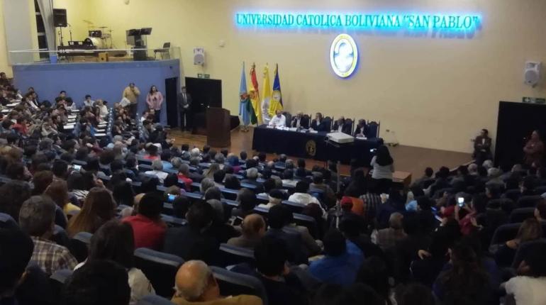 Tras concluir su exposición, el auditorio coreó: «Bolivia dijo no», entre aplausos al expresidente de la República.