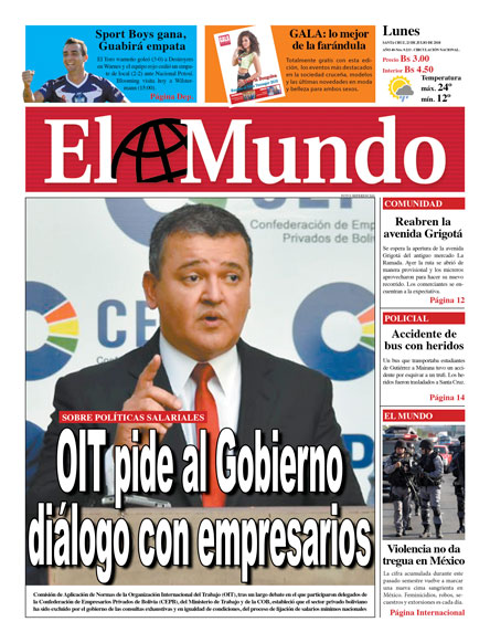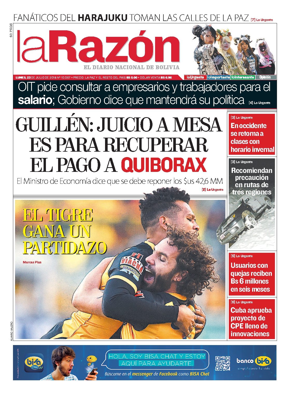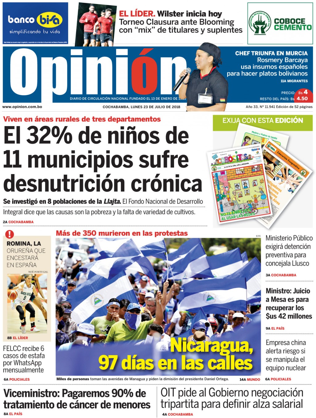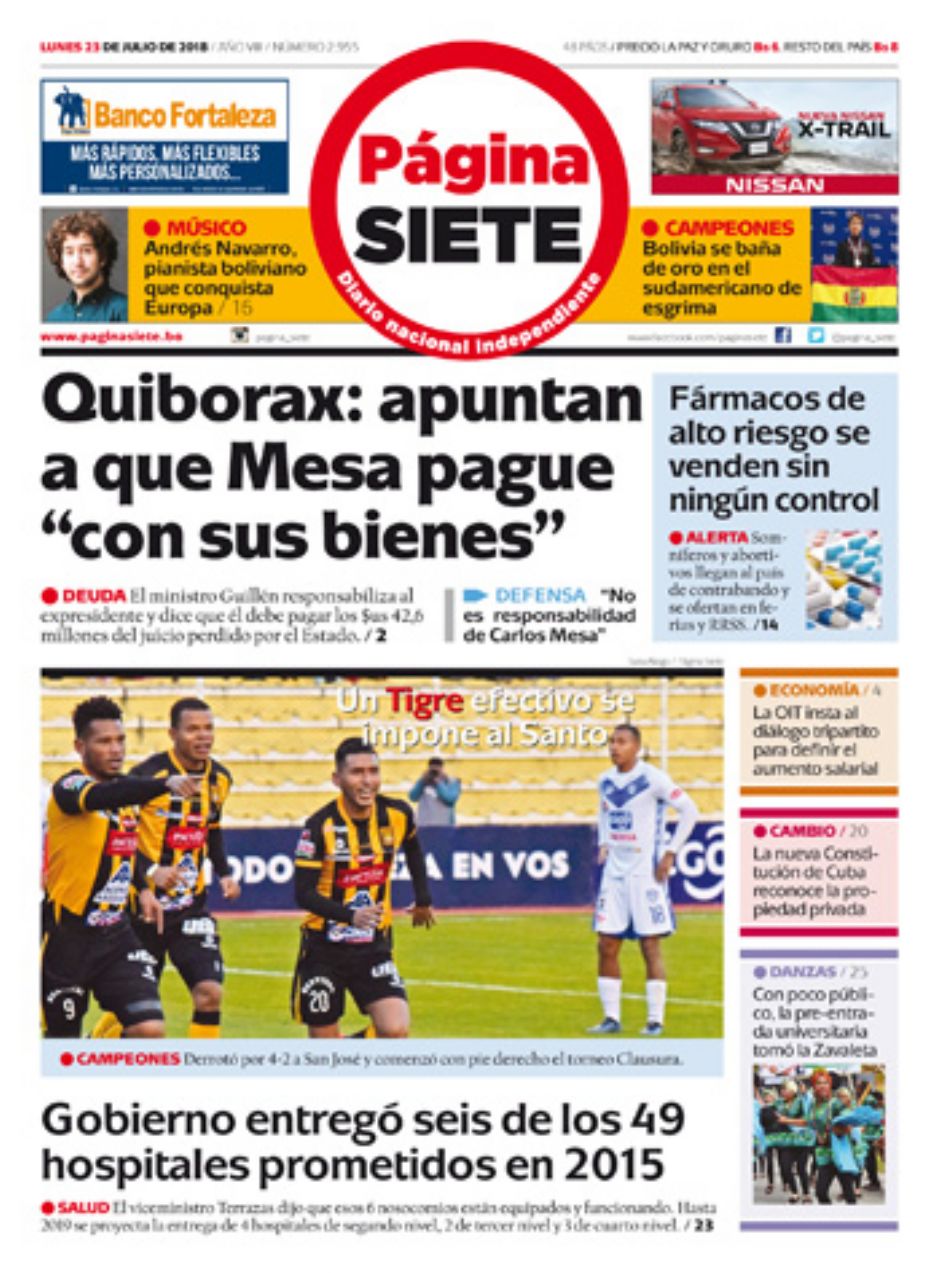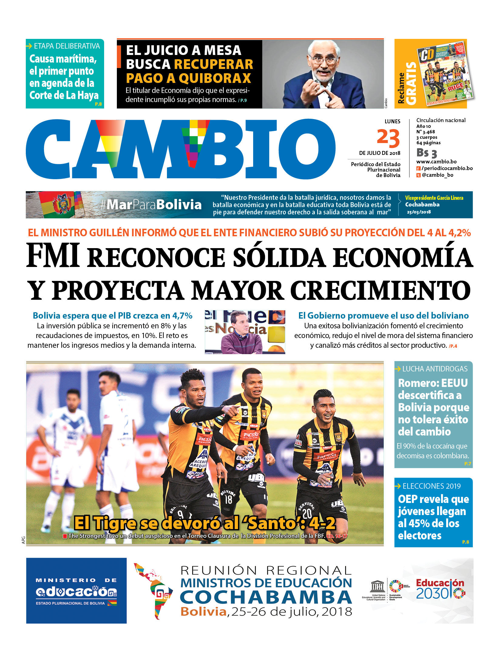 Portadas de periódicos de Bolivia del lunes 23 de julio de 2018Categorías MonitoreoEtiquetas , Portadas de periódicos 23/07/2018 El Deber – Los Tiempos – El Día – La Razón – Cambio – El Diario – Página Siete – Opinión