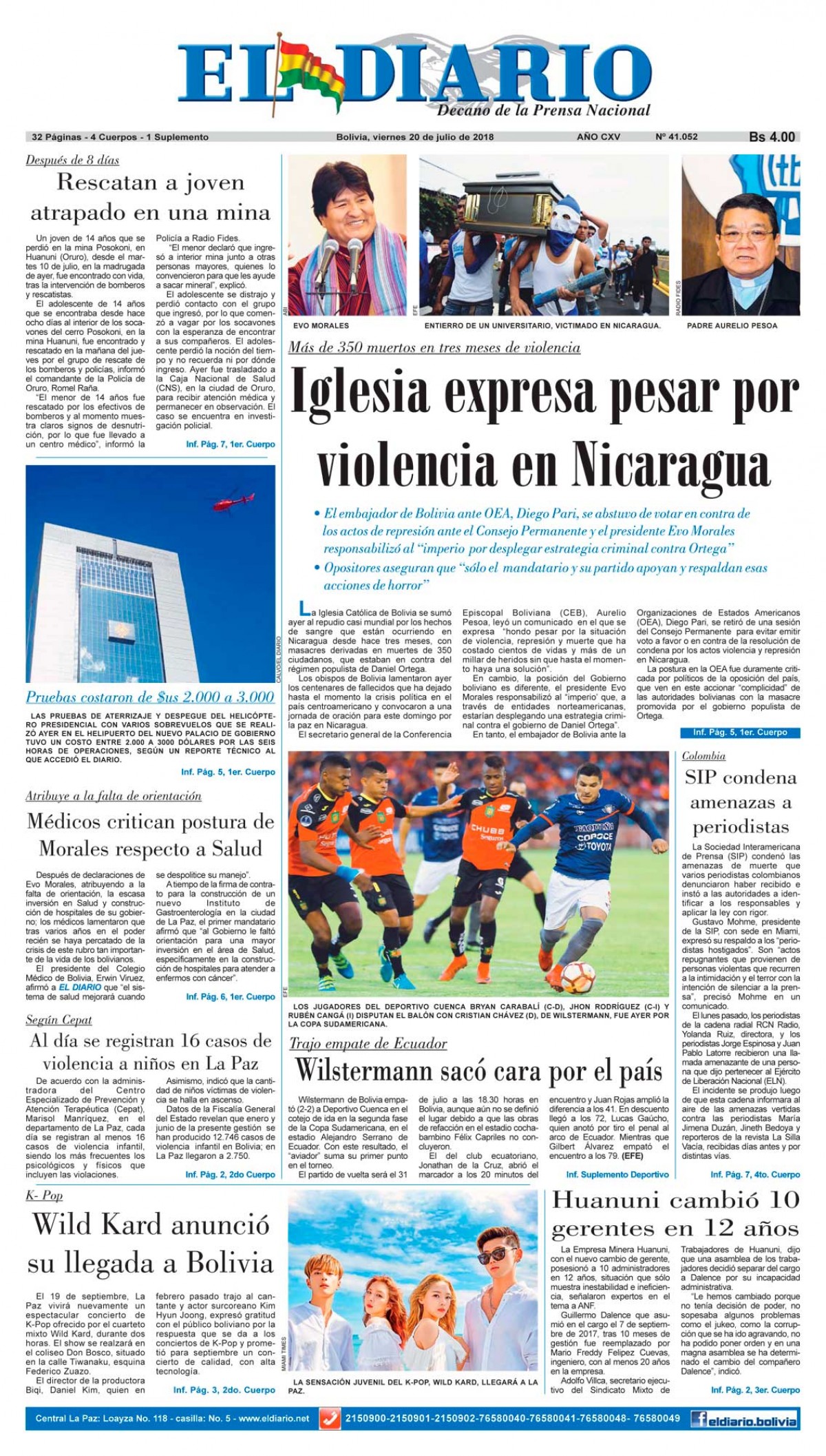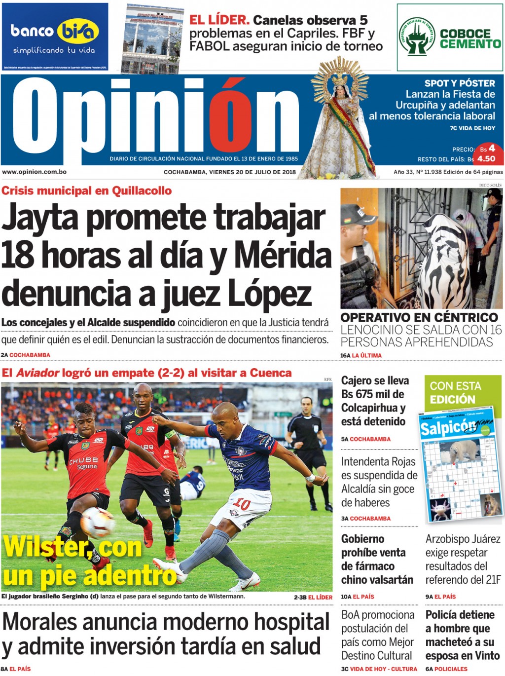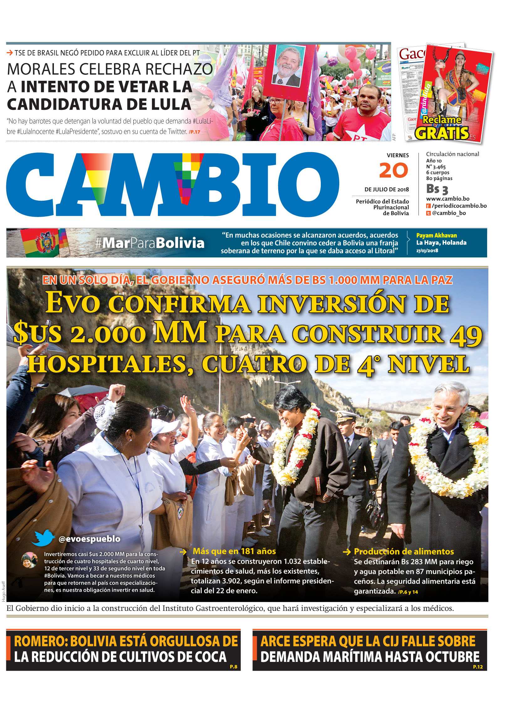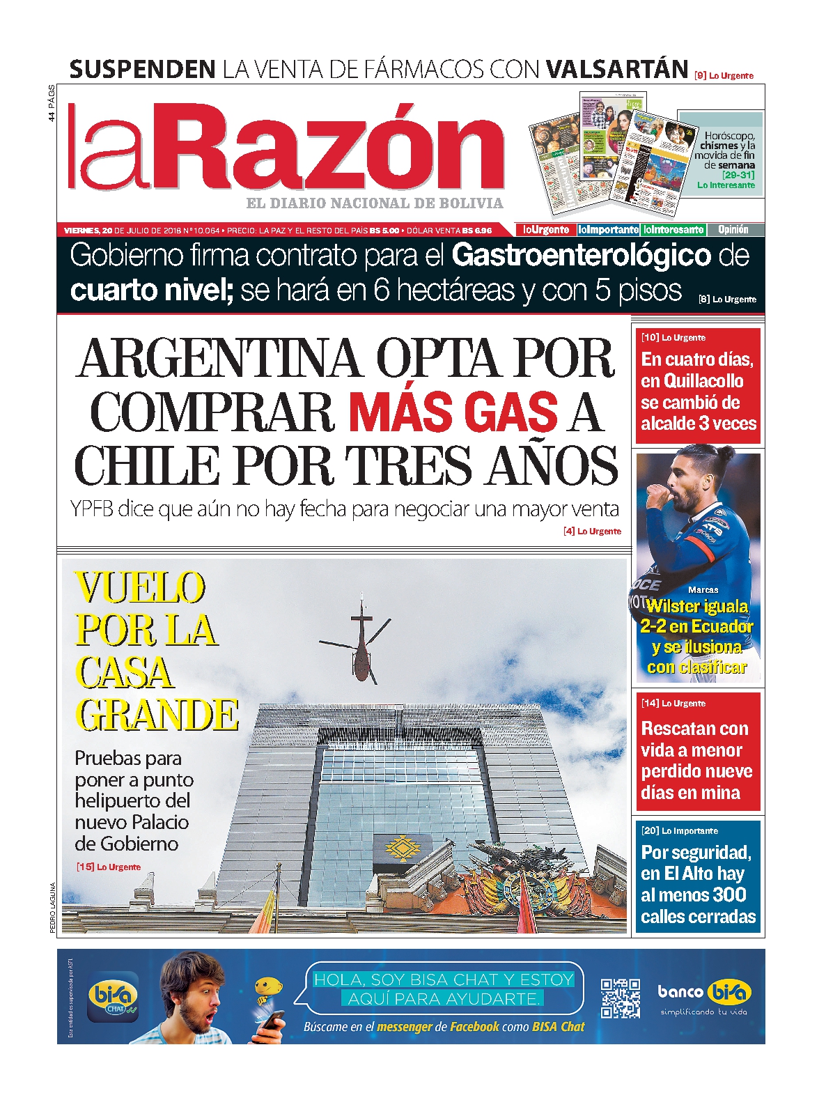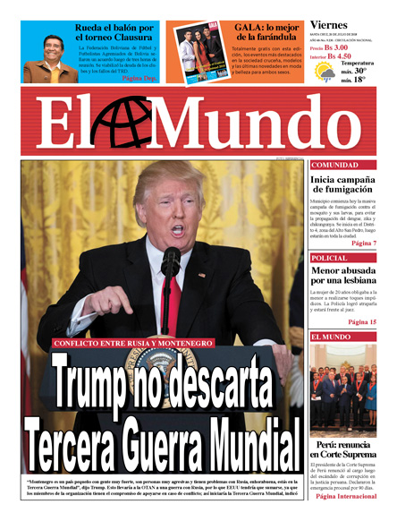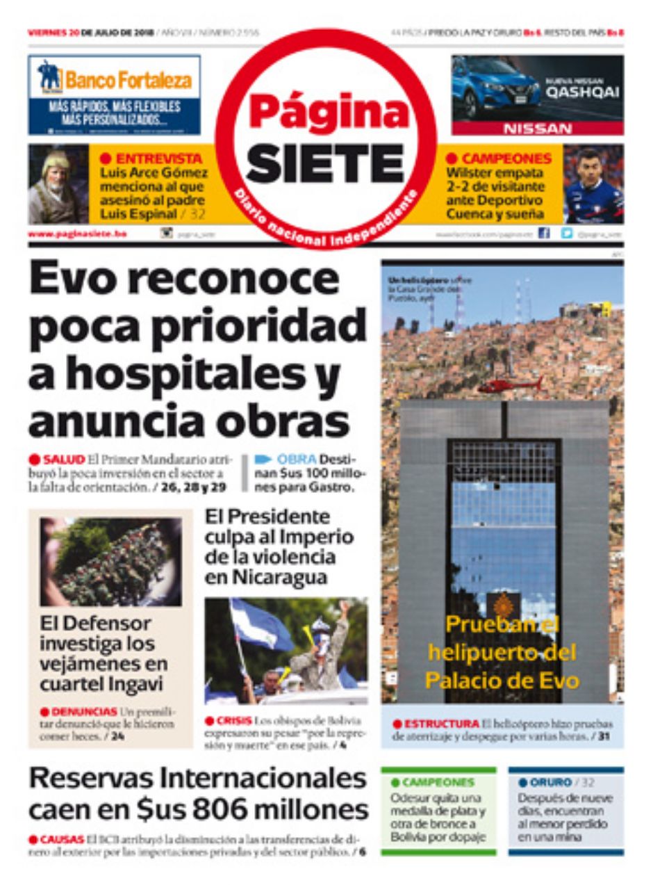 Portadas de periódicos de Bolivia del viernes 20 de julio de 2018