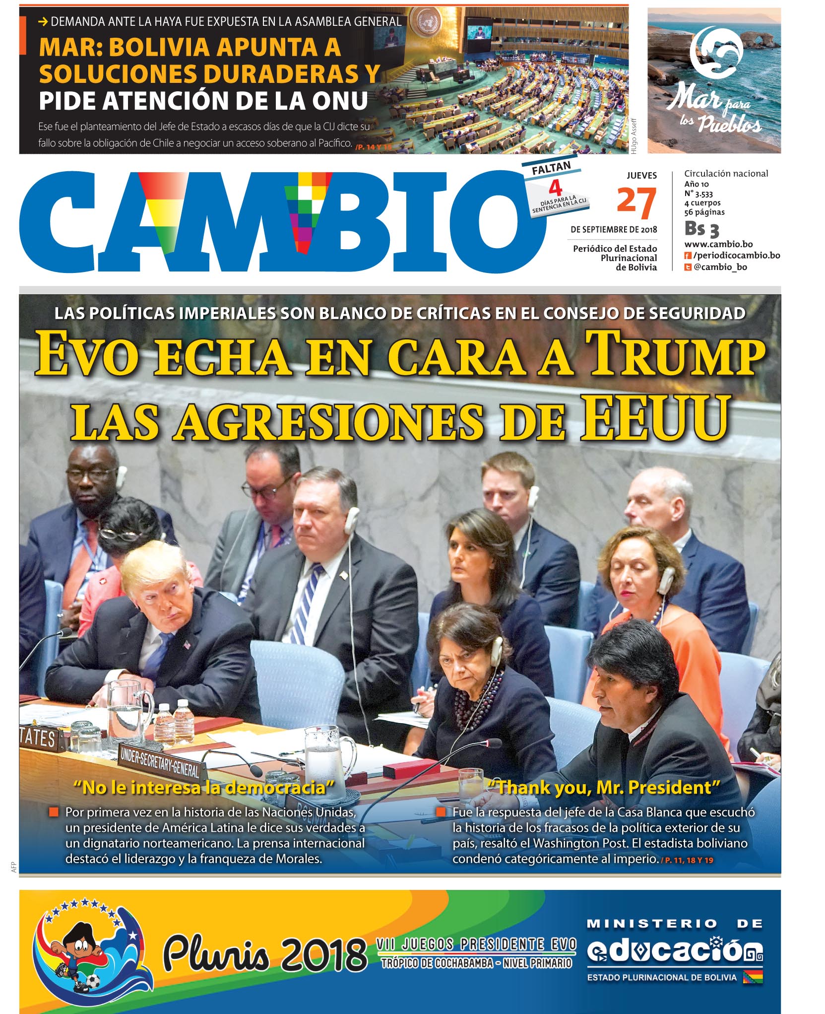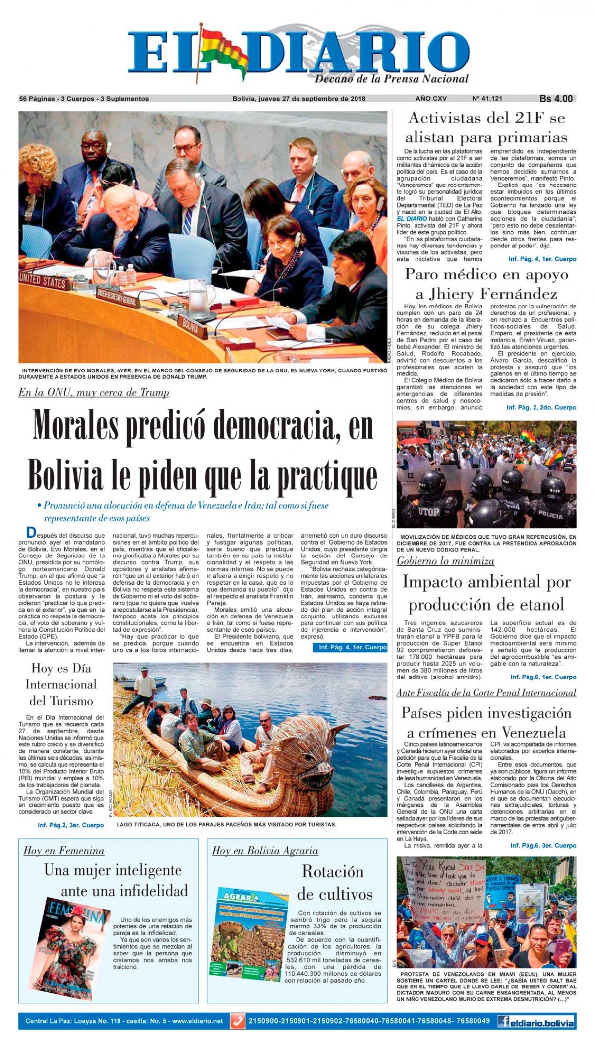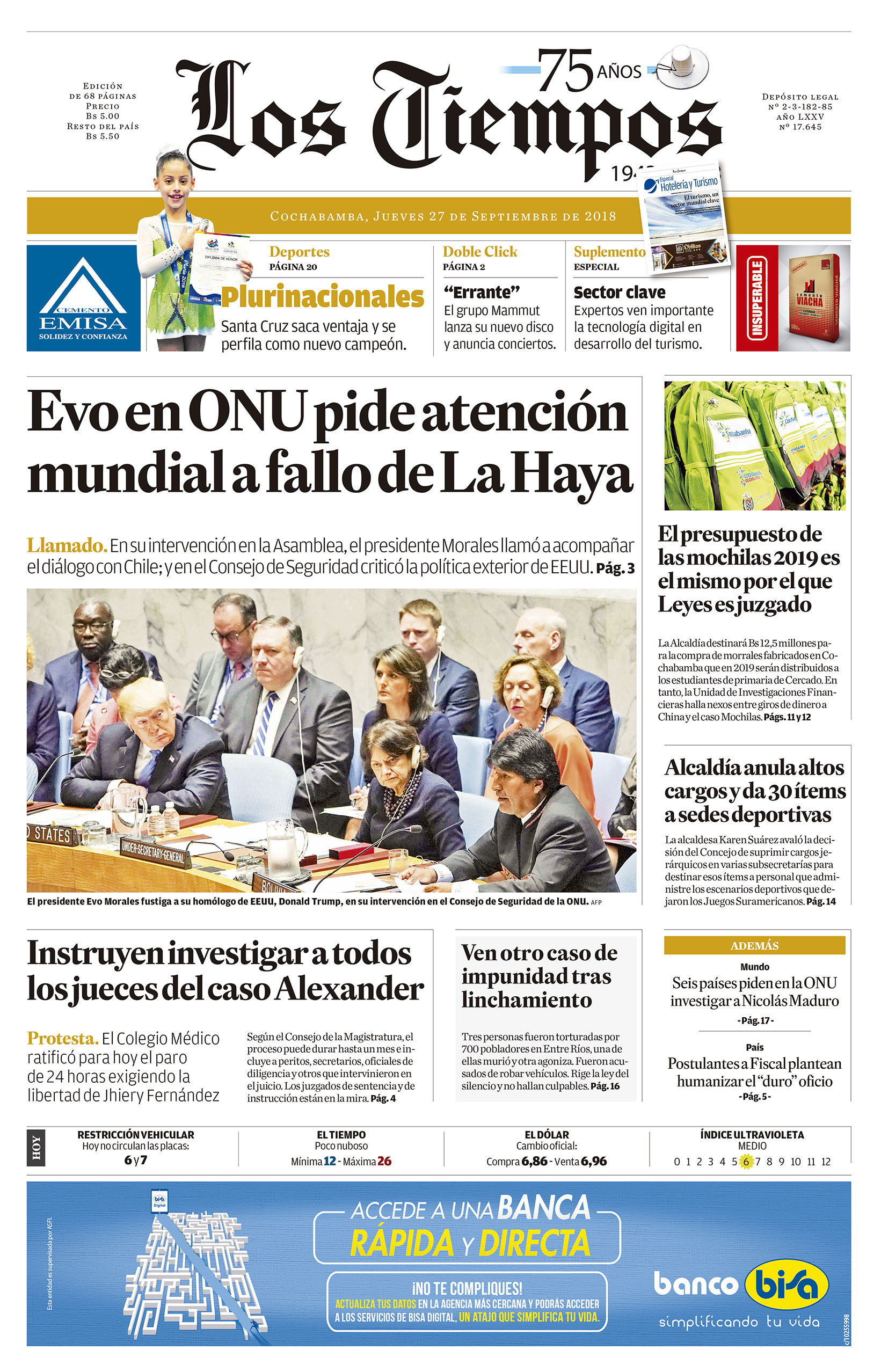 Portadas de periódicos de Bolivia del jueves 27 de septiembre de 2018Categorías MonitoreoEtiquetas , Portadas de periódicos 27/09/2018 El Deber – Los Tiempos – El Día – La Razón – Cambio – El Diario – Página Siete – Opinión