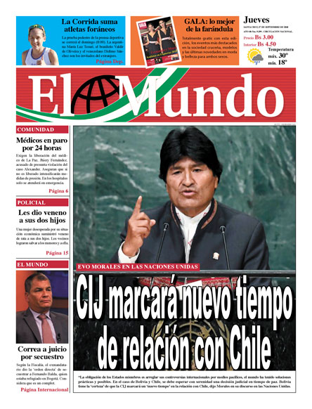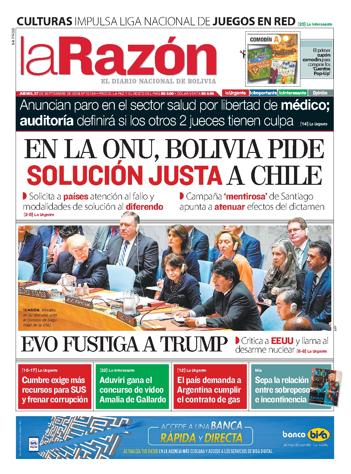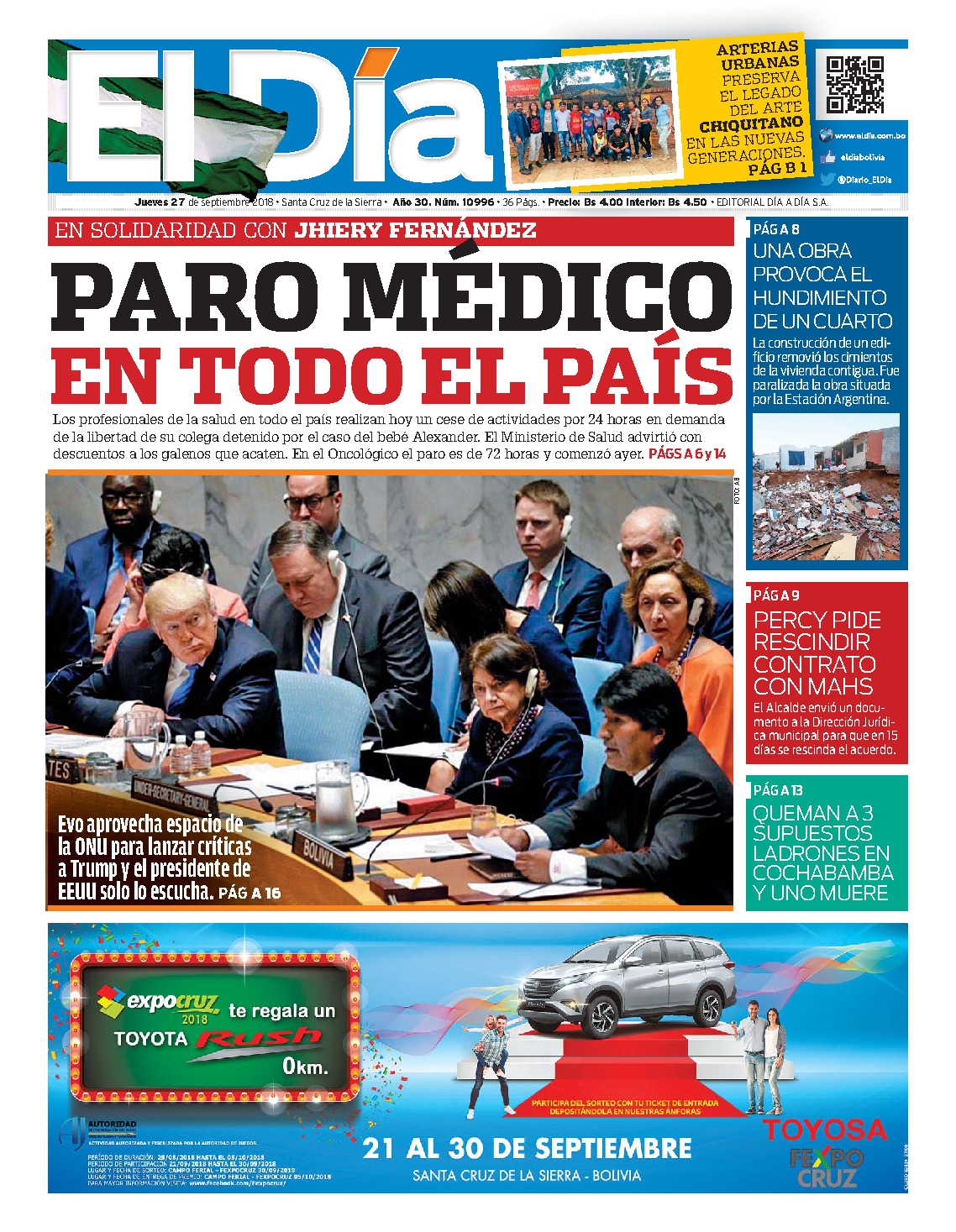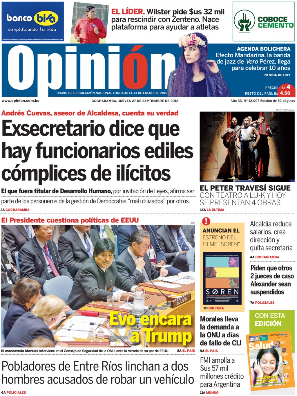 Portadas de periódicos de Bolivia del jueves 27 de septiembre de 2018Categorías MonitoreoEtiquetas , Portadas de periódicos 27/09/2018 El Deber – Los Tiempos – El Día – La Razón – Cambio – El Diario – Página Siete – Opinión