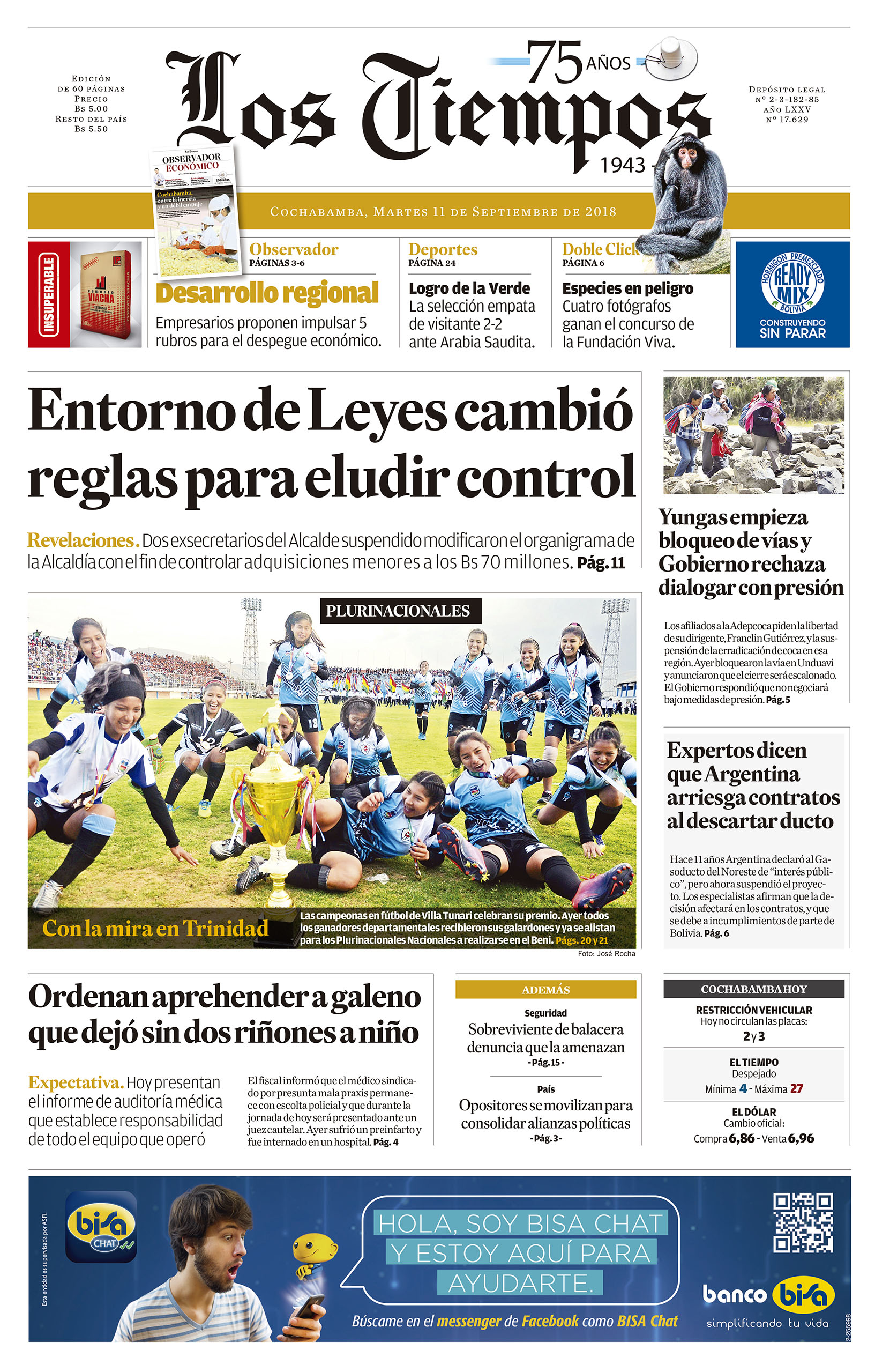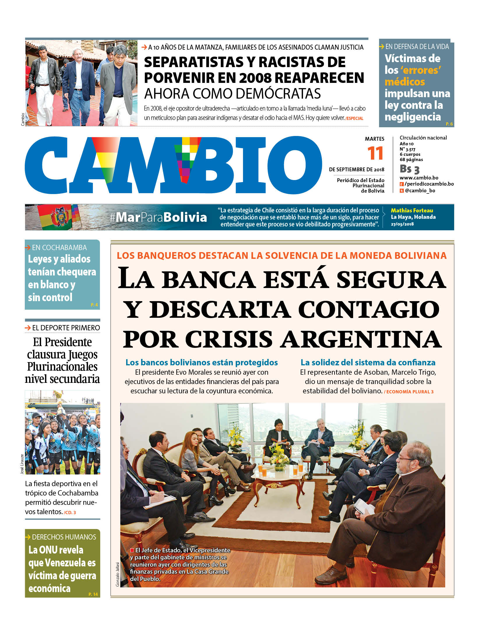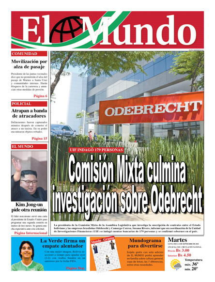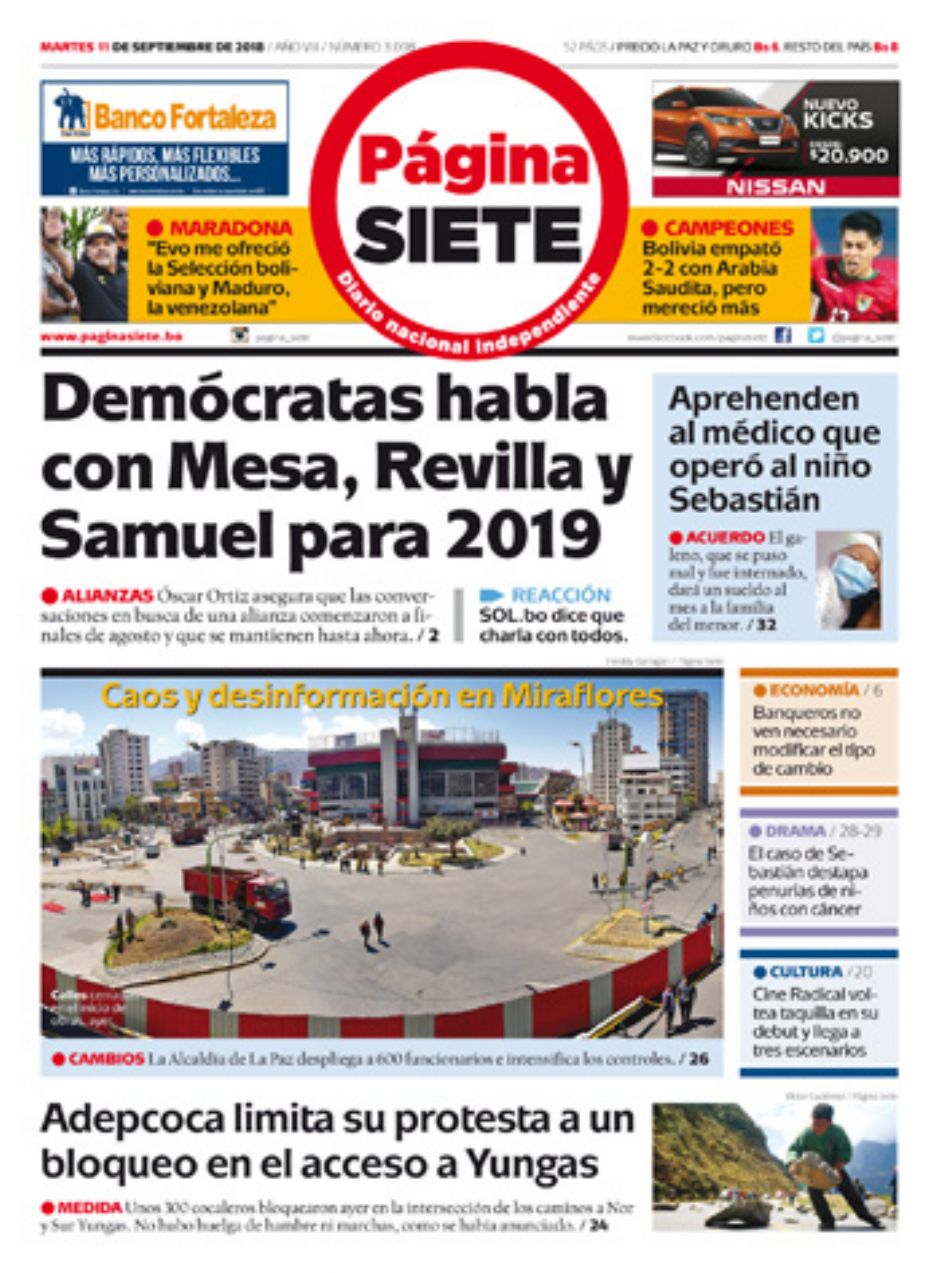 Portadas de periódicos de Bolivia del martes 11 de septiembre de 2018Categorías MonitoreoEtiquetas , Portadas de periódicos 11/09/2018 El Deber – Los Tiempos – El Día – La Razón – Cambio – El Diario – Página Siete – Opinión
