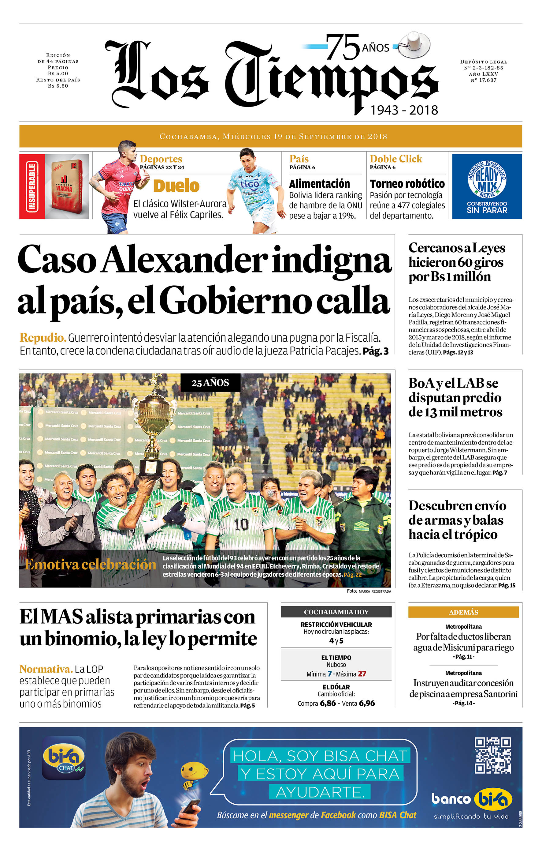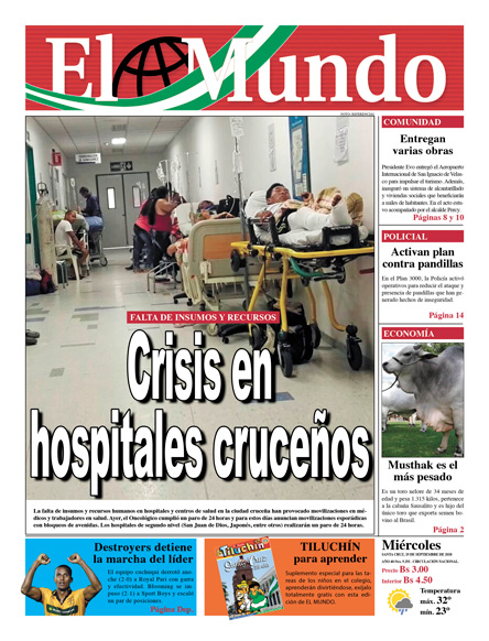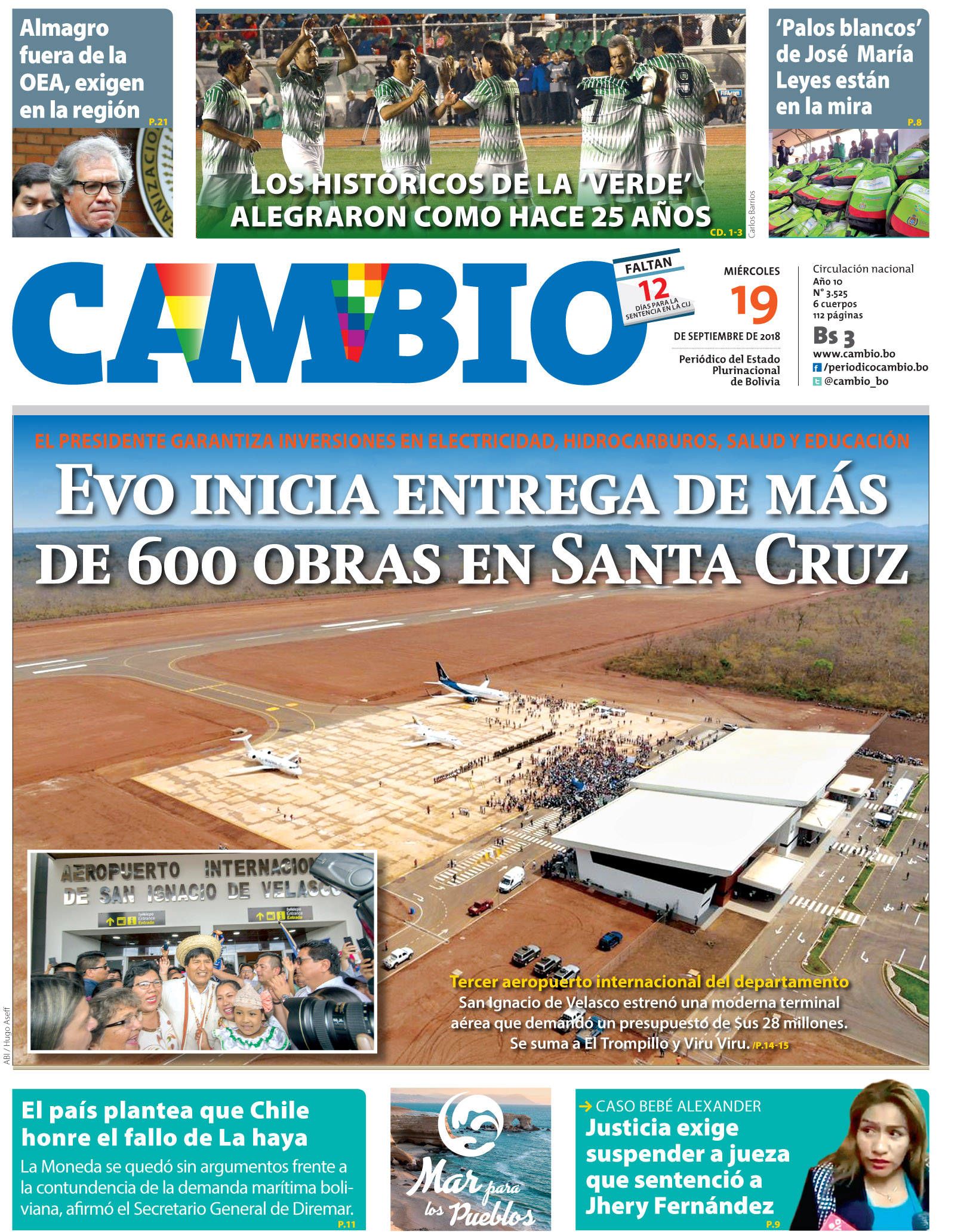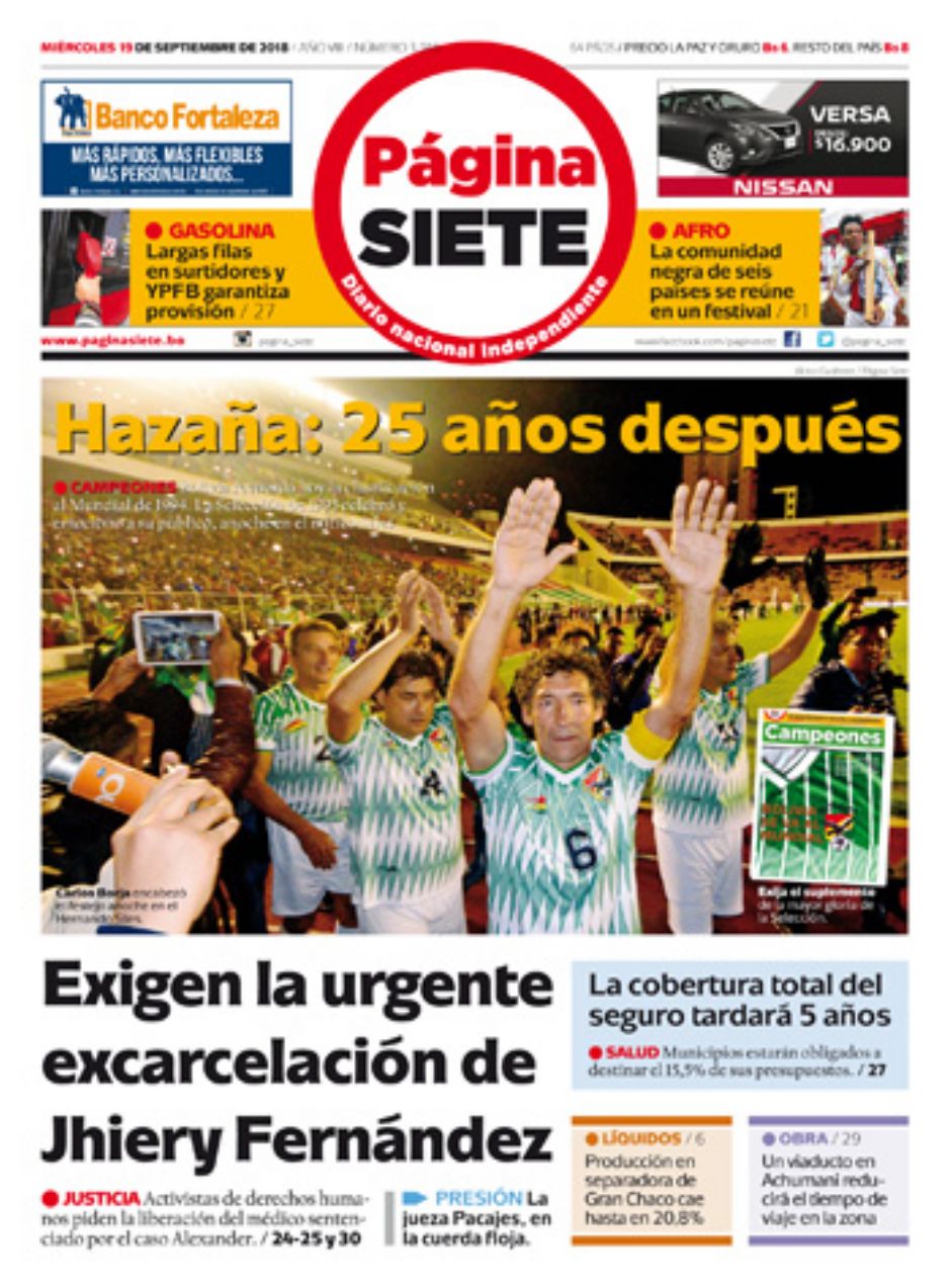 Portadas de periódicos de Bolivia del miércoles 19 de septiembre de 2018Categorías MonitoreoEtiquetas , Portadas de periódicos 19/09/2018 El Deber – Los Tiempos – El Día – La Razón – Cambio – El Diario – Página Siete – Opinión