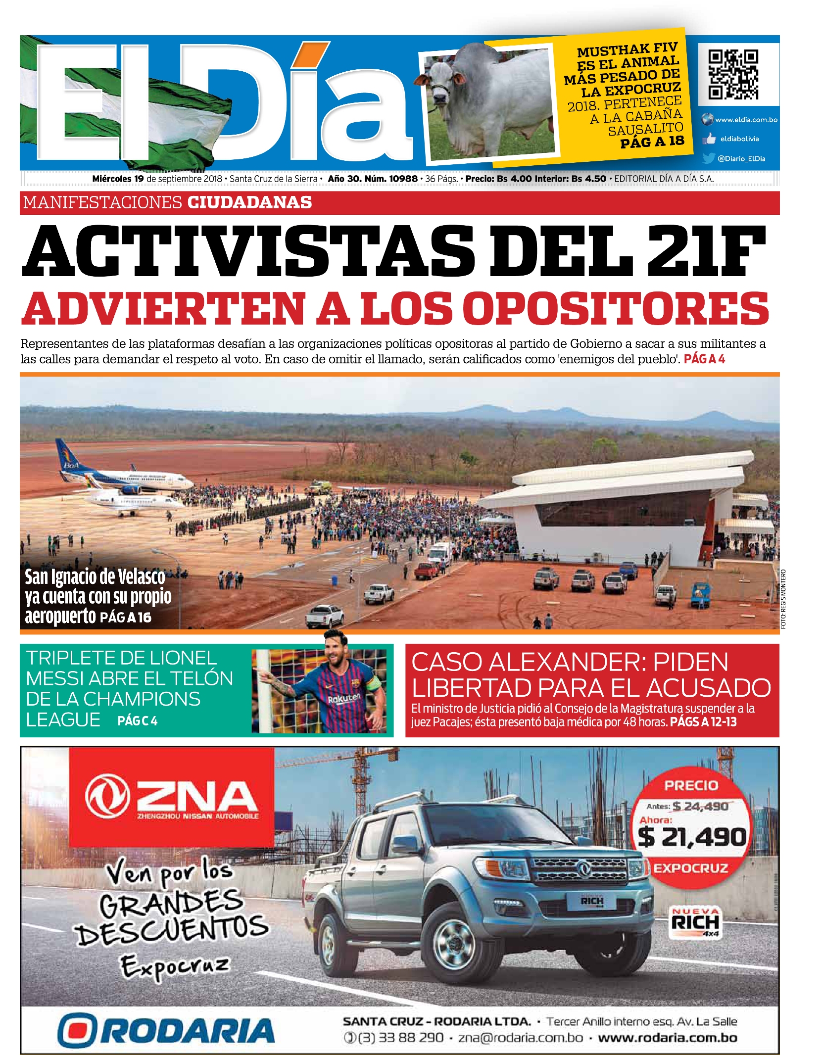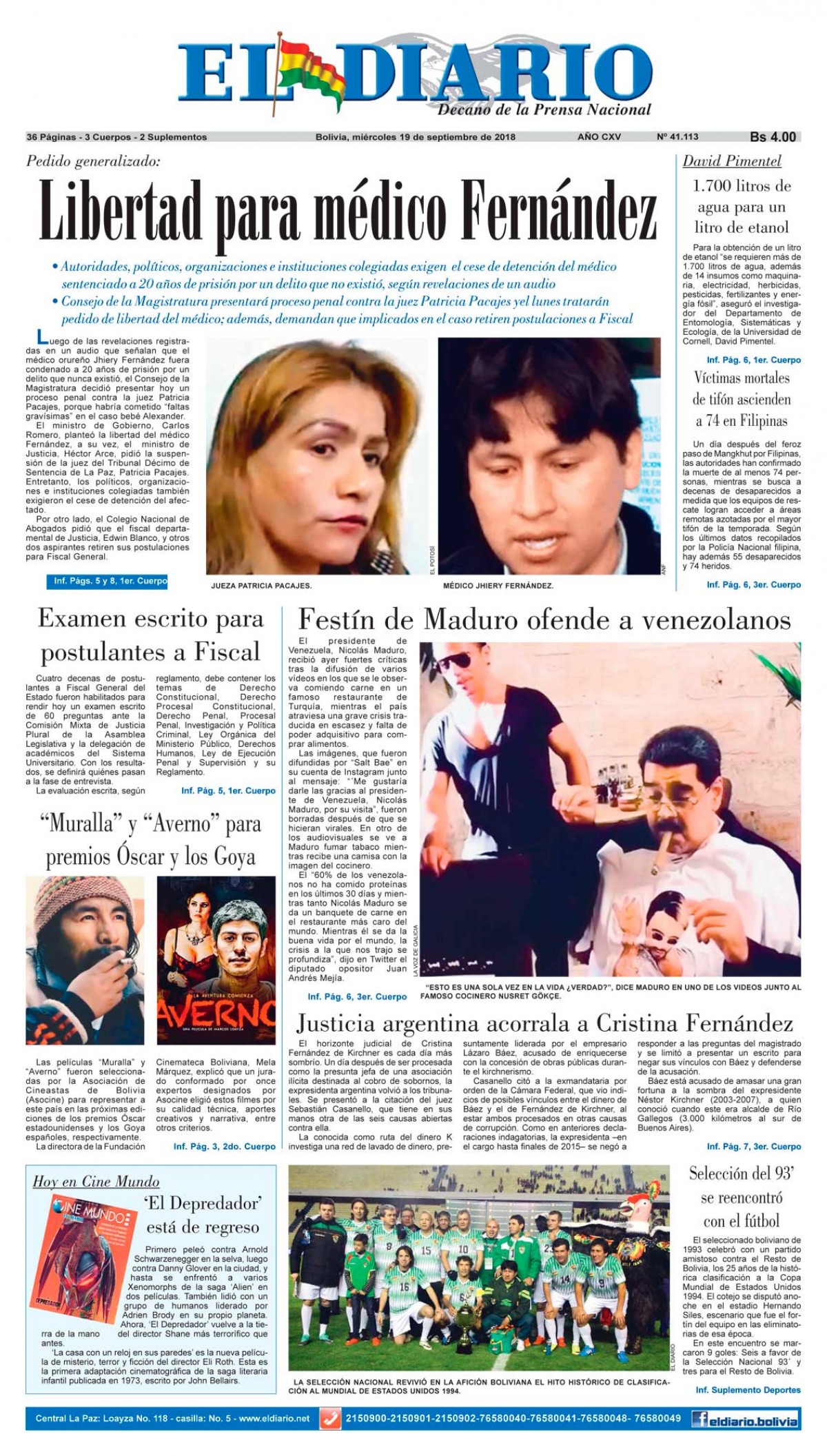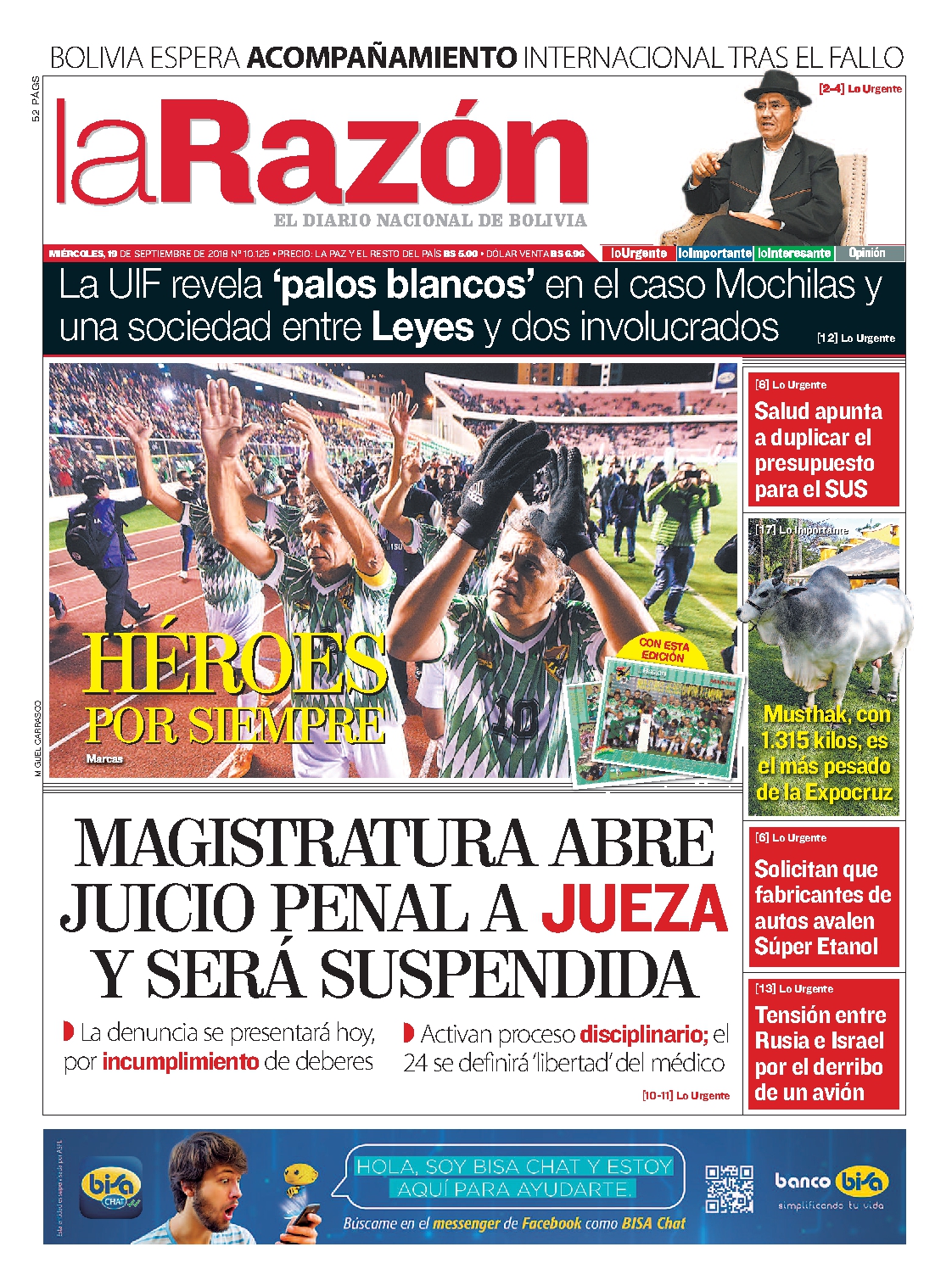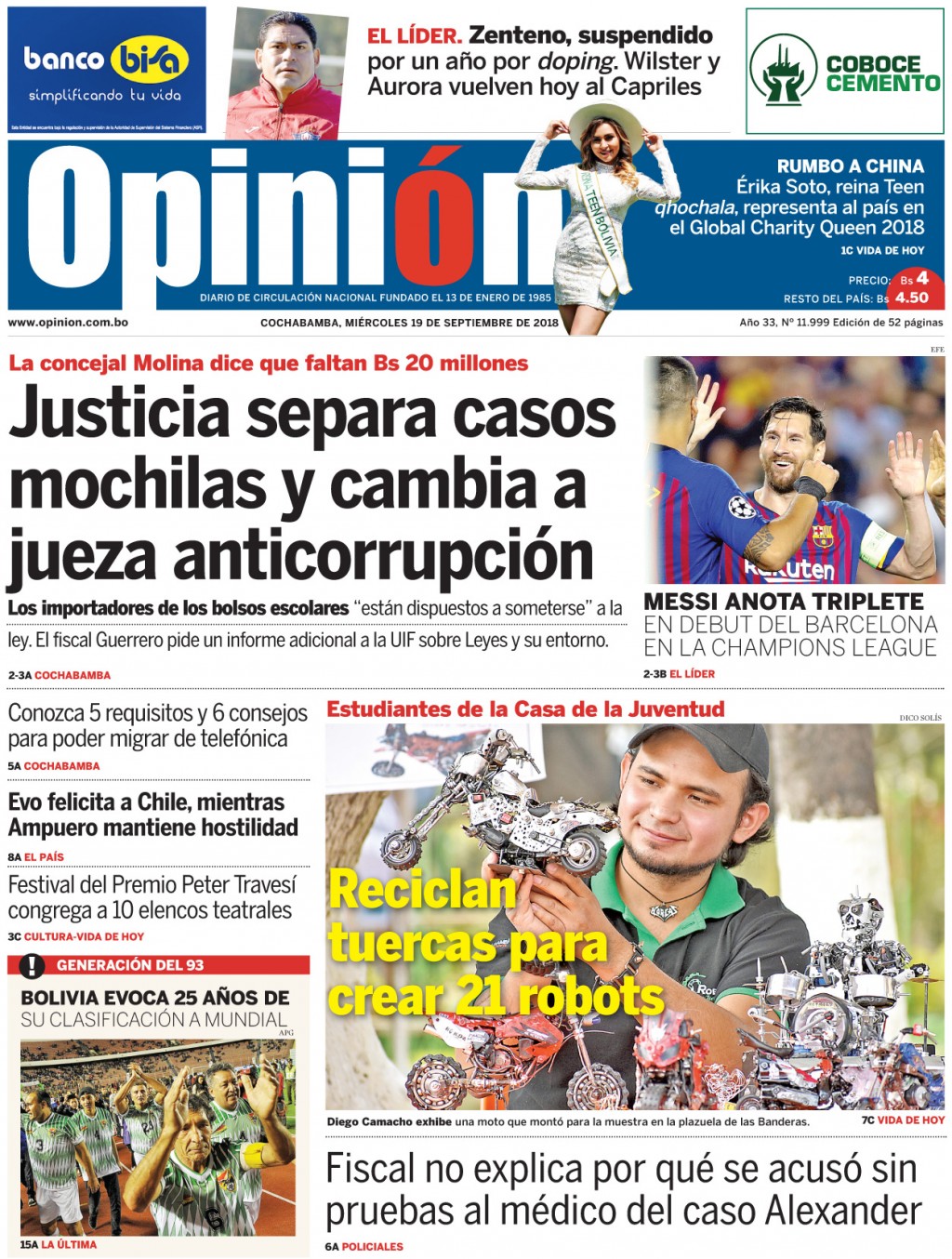 Portadas de periódicos de Bolivia del miércoles 19 de septiembre de 2018Categorías MonitoreoEtiquetas , Portadas de periódicos 19/09/2018 El Deber – Los Tiempos – El Día – La Razón – Cambio – El Diario – Página Siete – Opinión