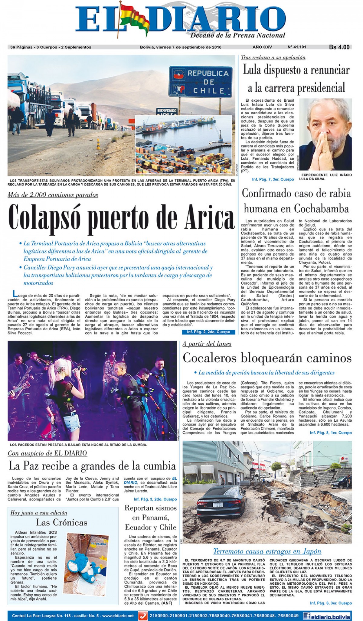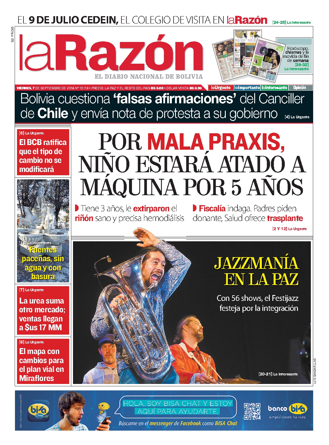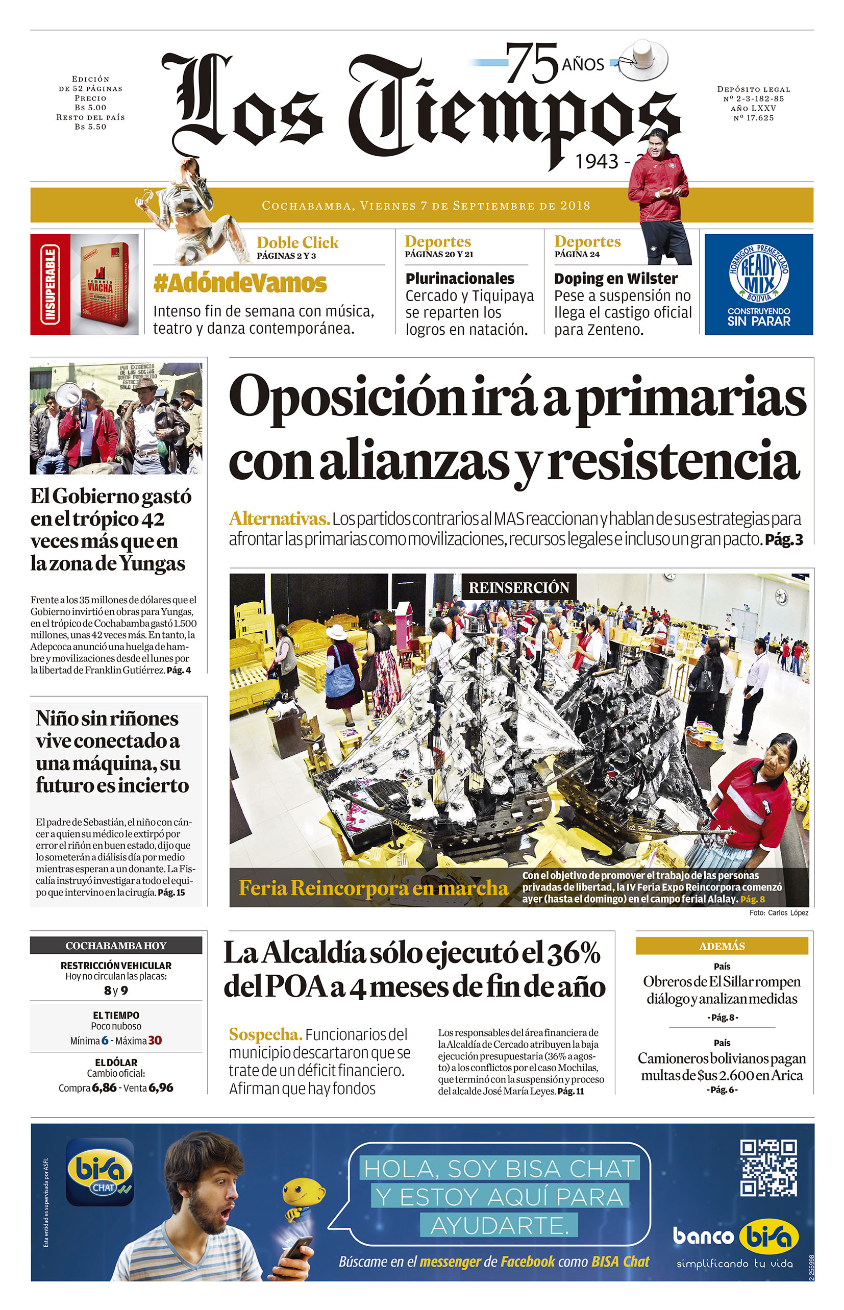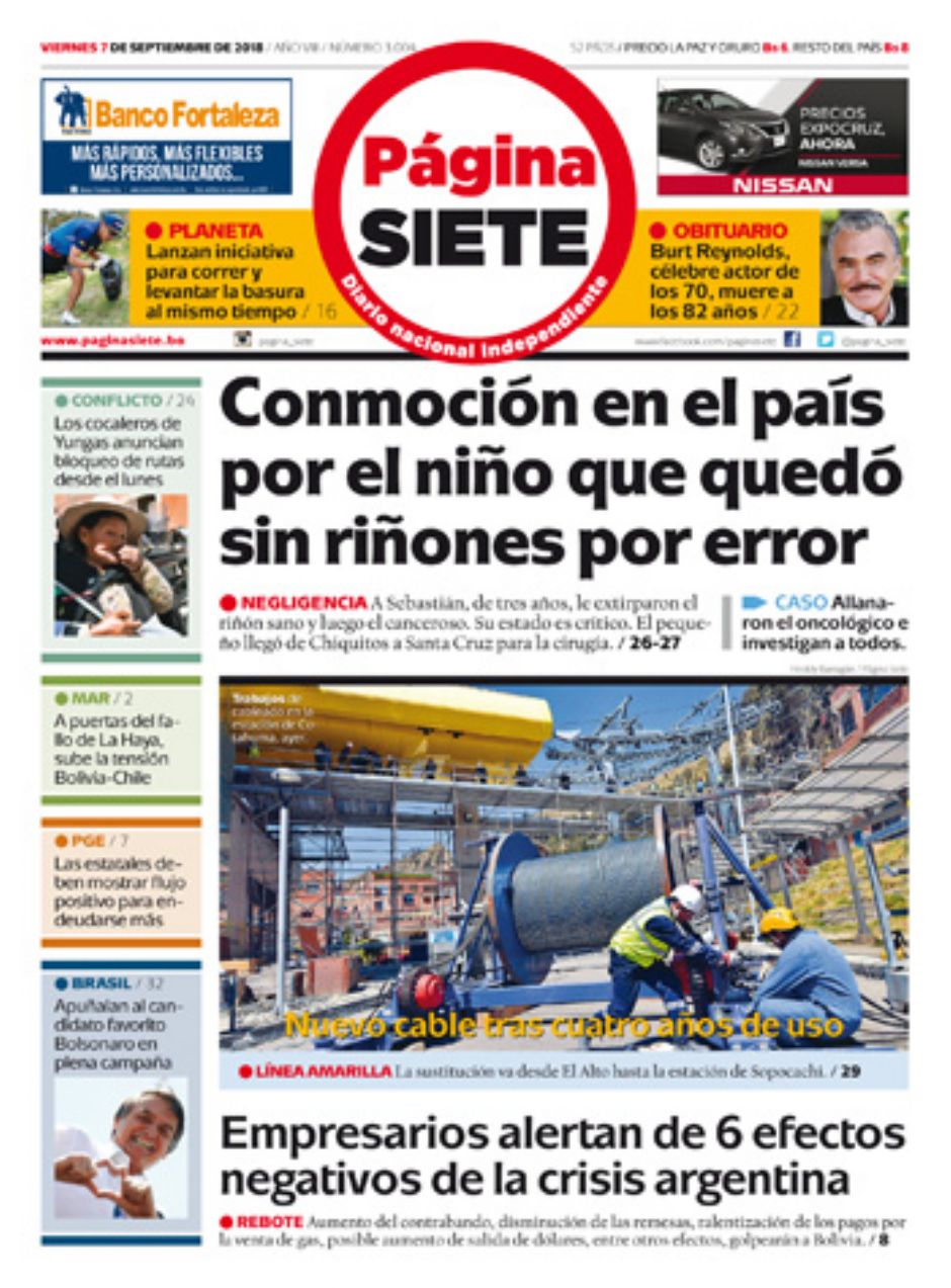 Portadas de periódicos de Bolivia del viernes 7 de septiembre de 2018Categorías MonitoreoEtiquetas , Portadas de periódicos 07/09/2018 El Deber – Los Tiempos – El Día – La Razón – Cambio – El Diario – Página Siete – Opinión