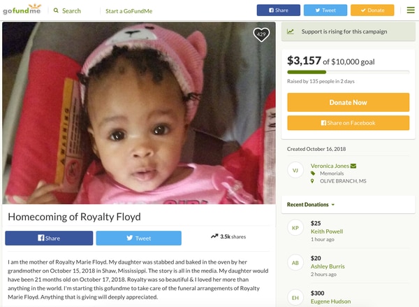 «Mi hija fue apuñalada y quemada en el horno por su abuela el 15 de octubre de 2018 en Shaw, Mississippi. […] Mi hija habría cumplido 21 meses el 17 de octubre. Royalty era tan hermosa y yo la amaba más que a nada en el mundo».