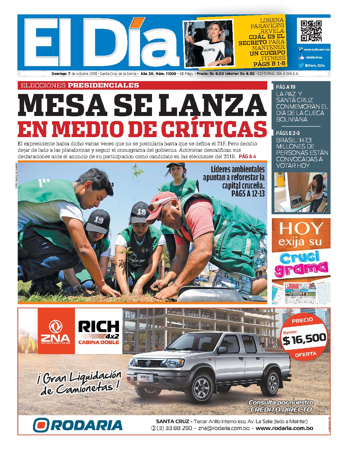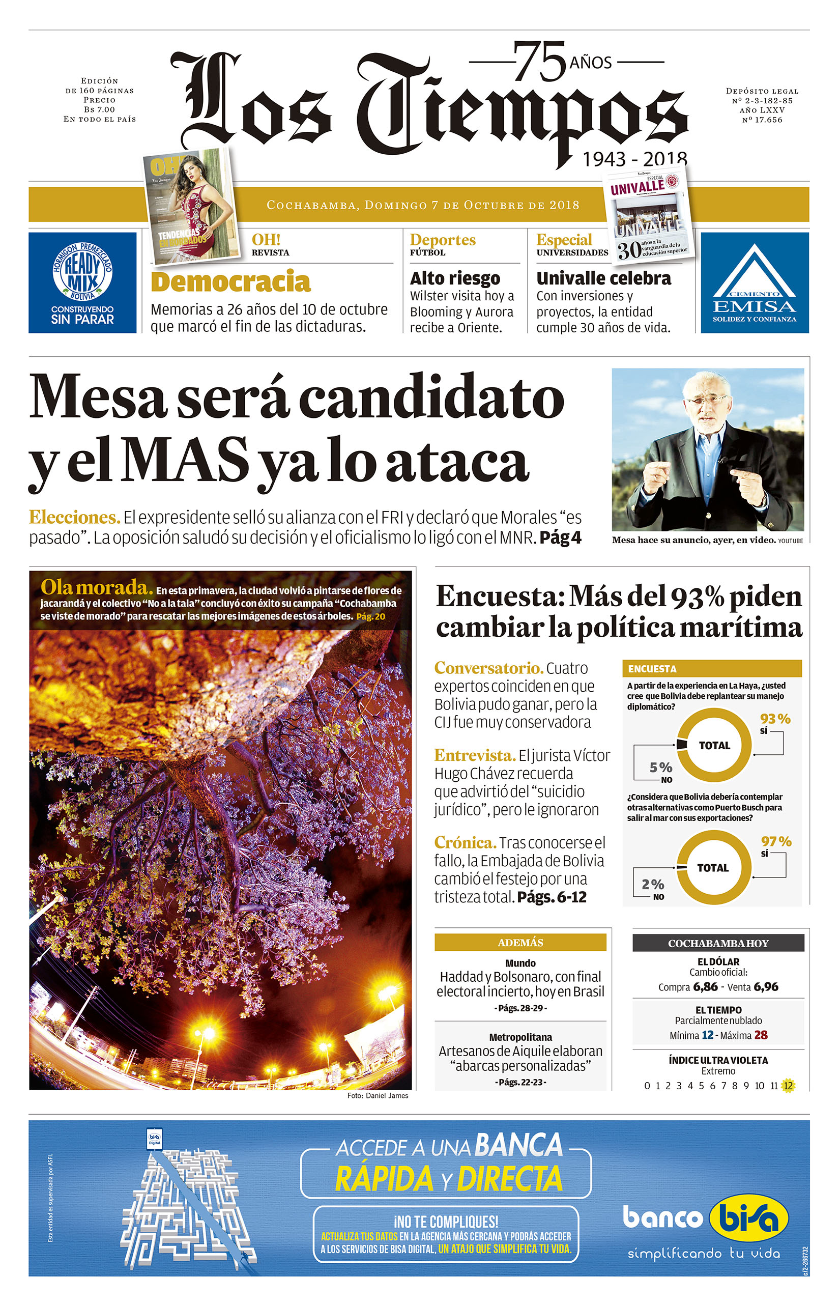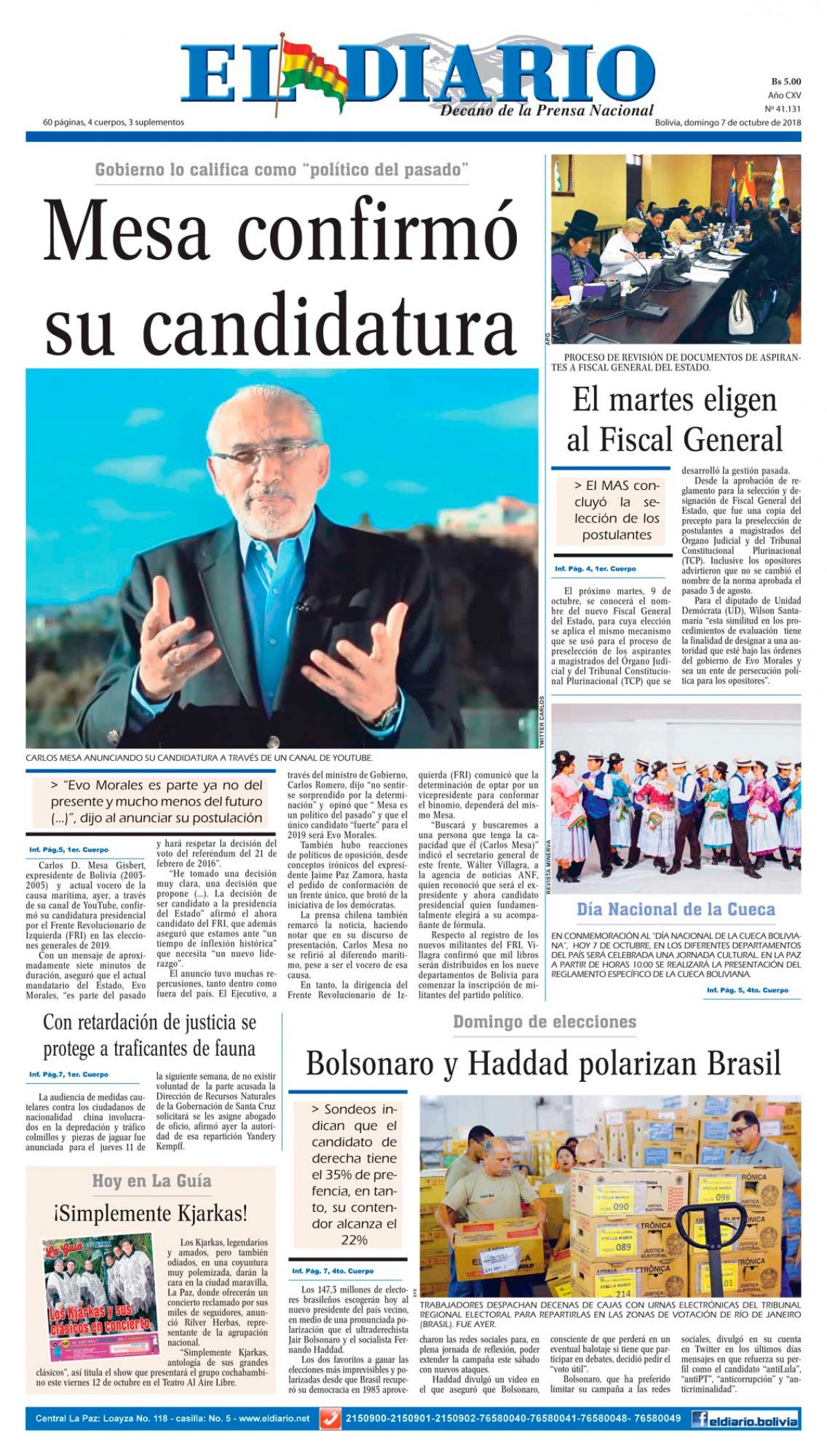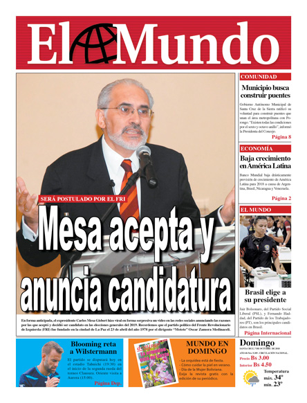 Portadas de periódicos de Bolivia del domingo 7 de octubre de 2018