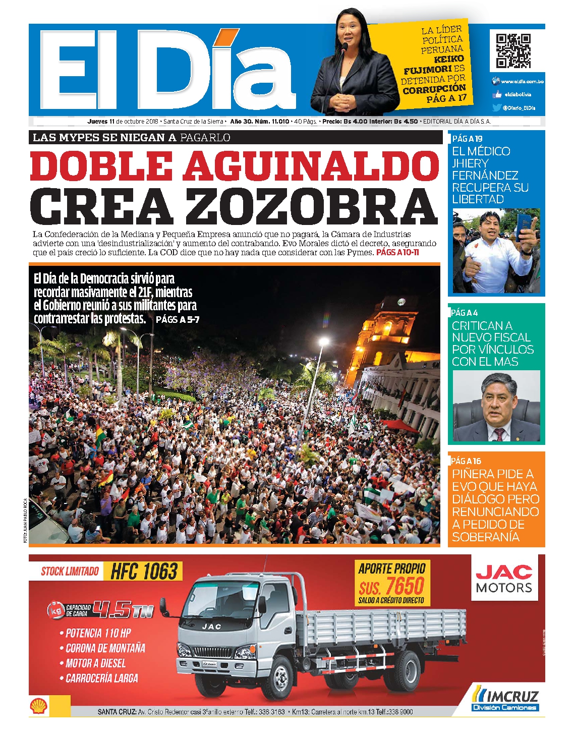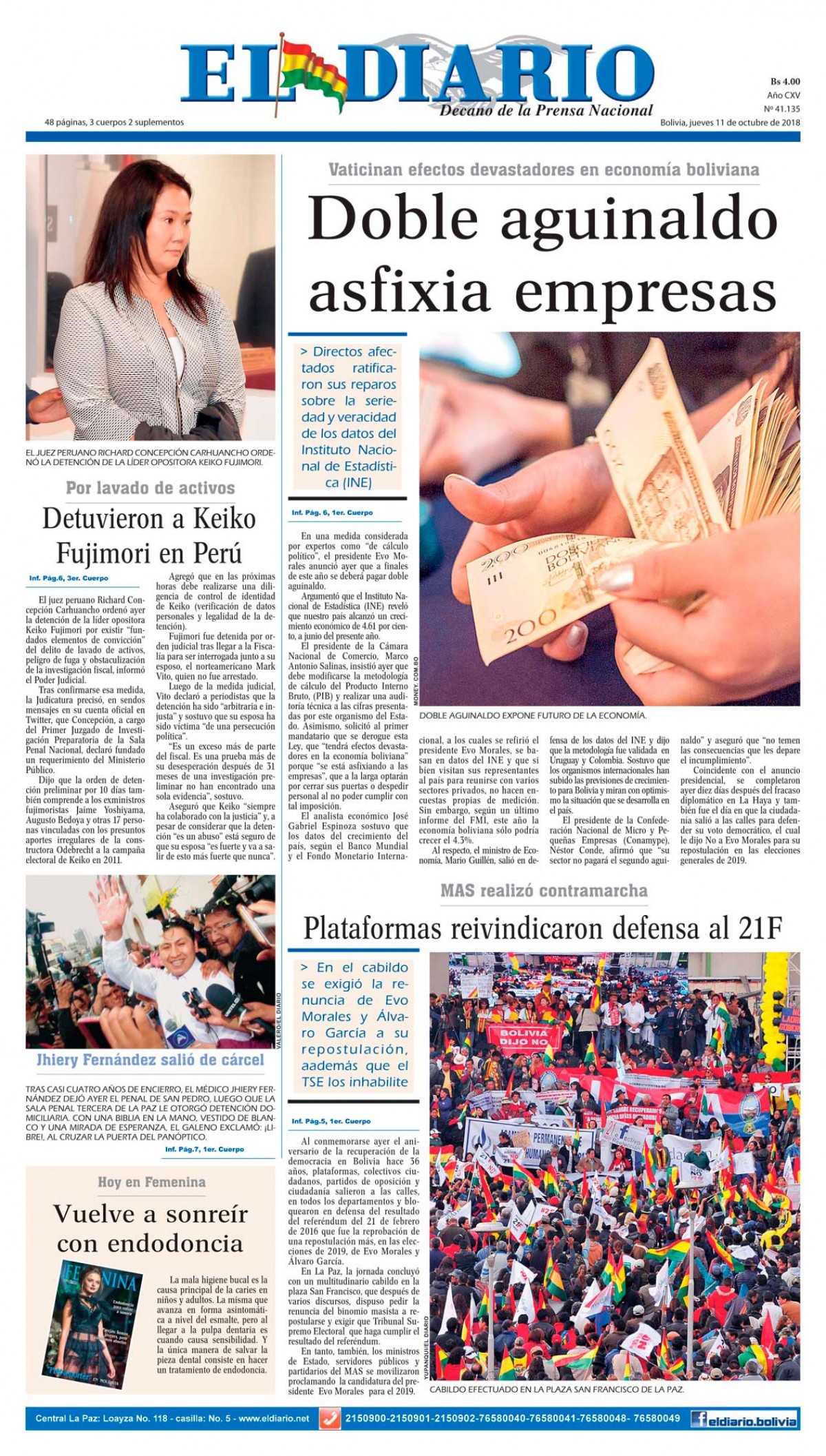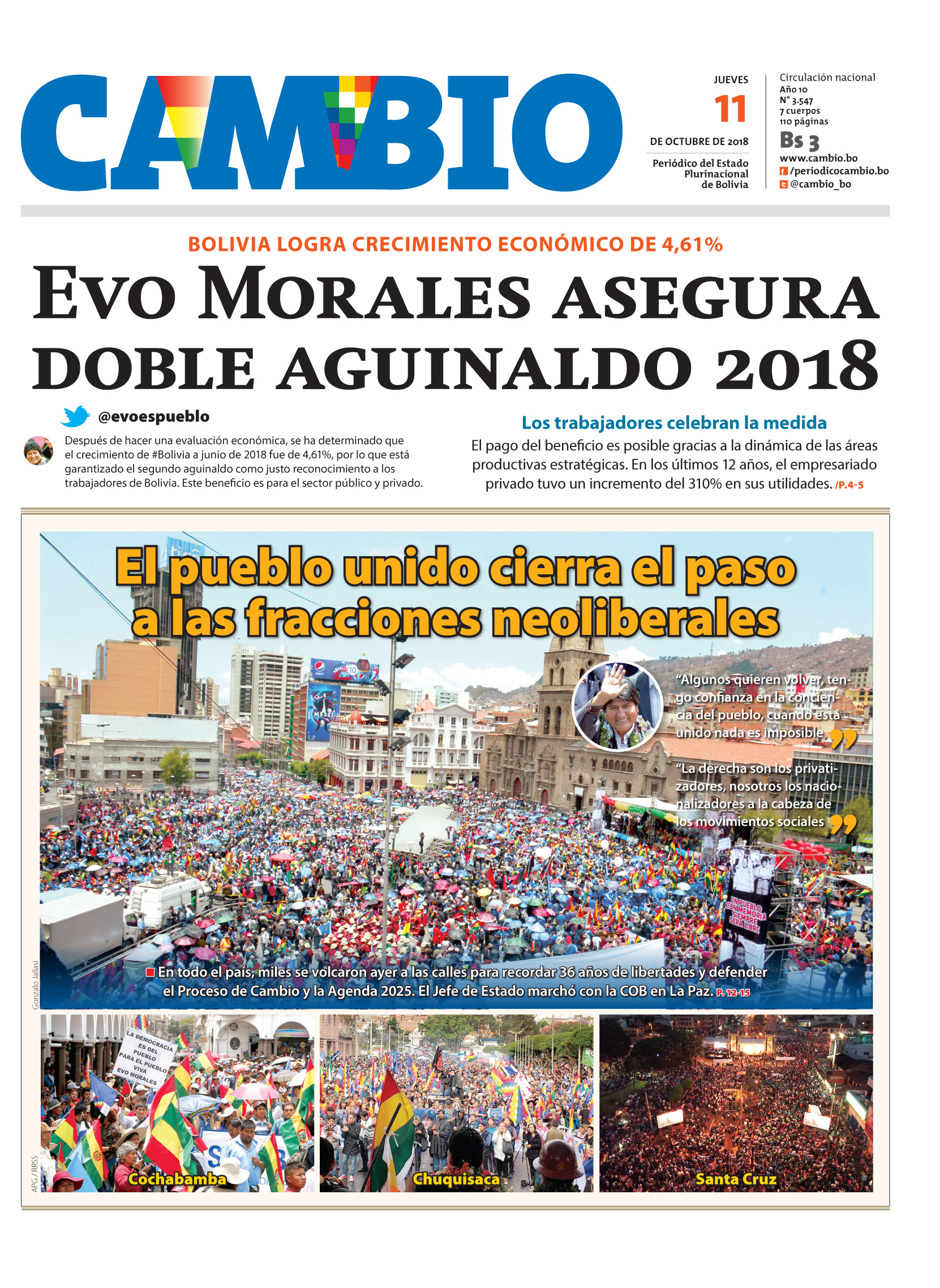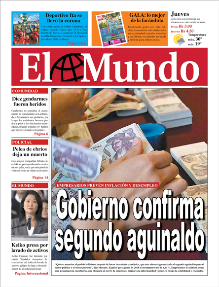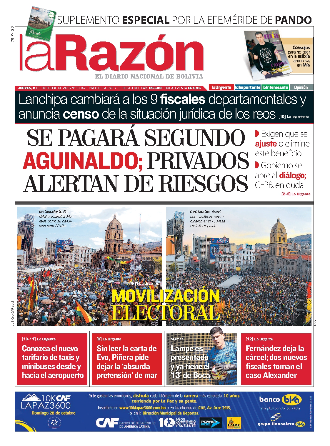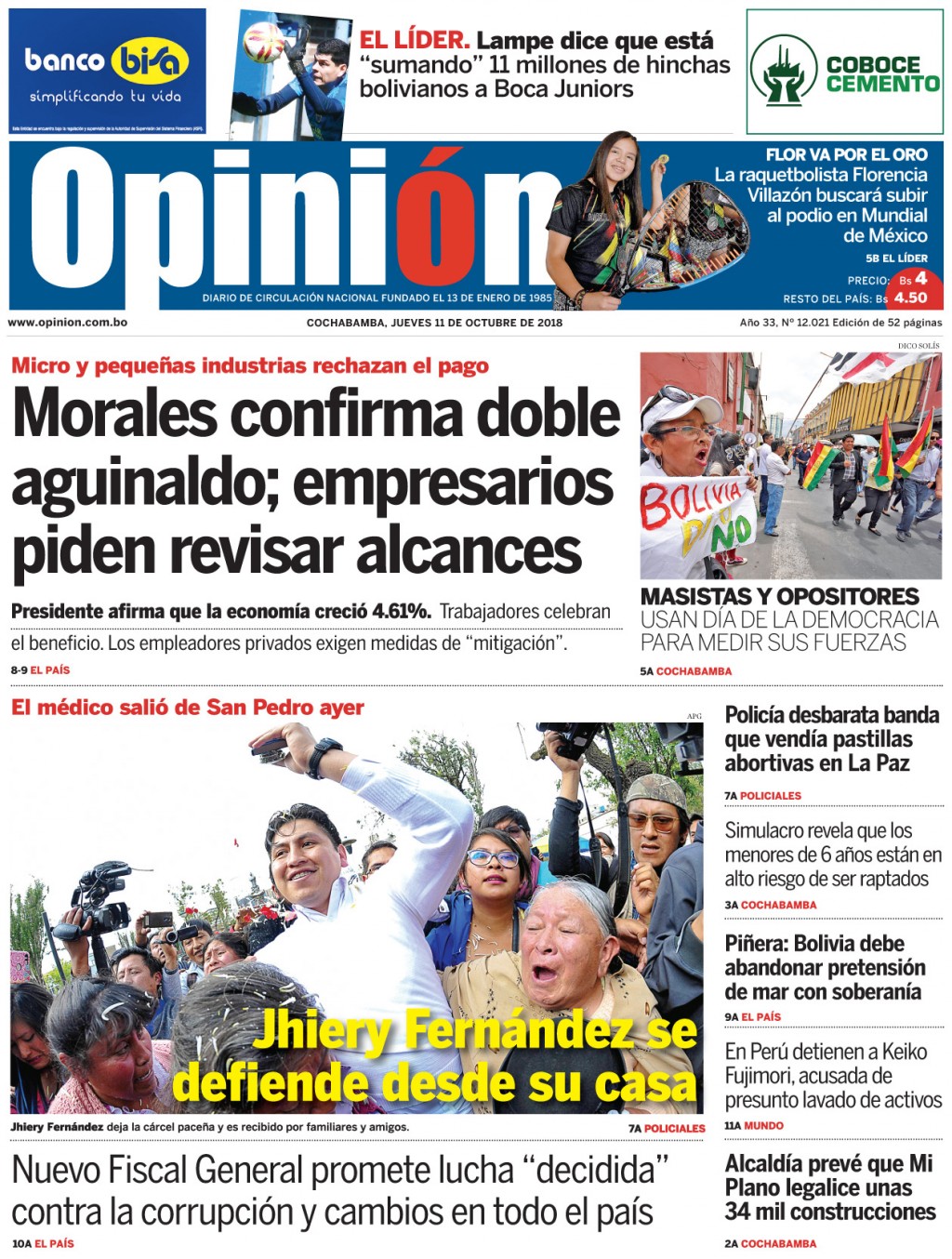 Portadas de periódicos de Bolivia del jueves 11 de octubre de 2018