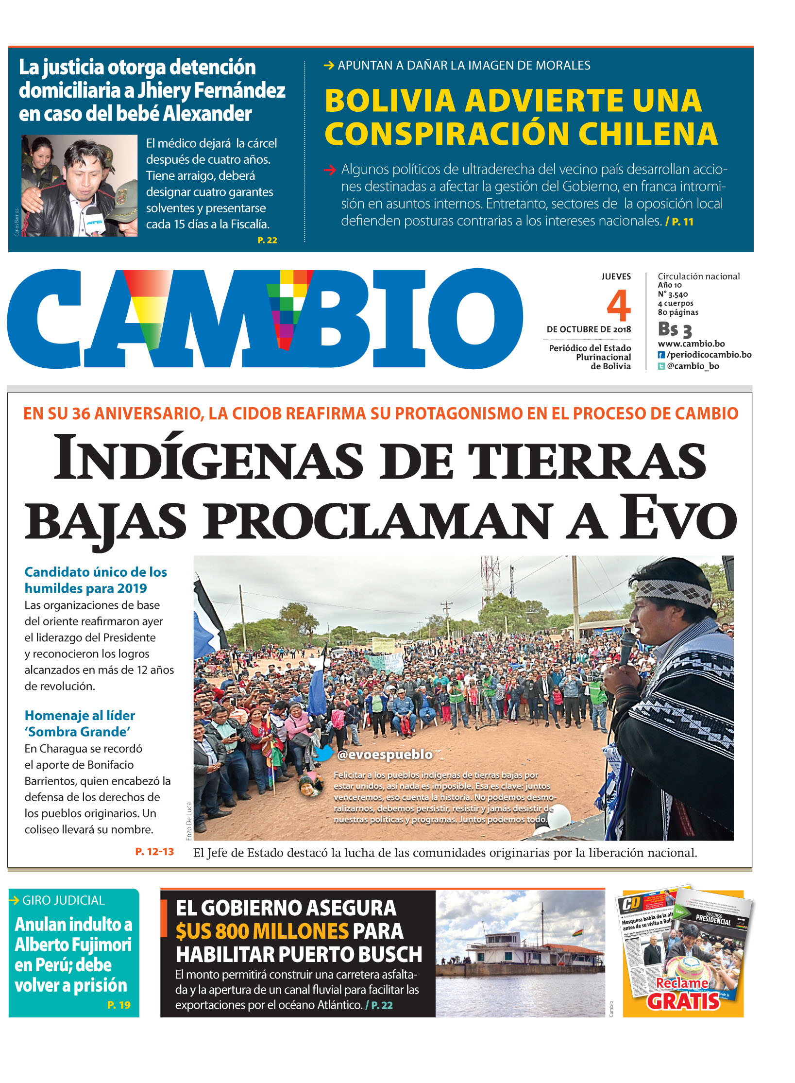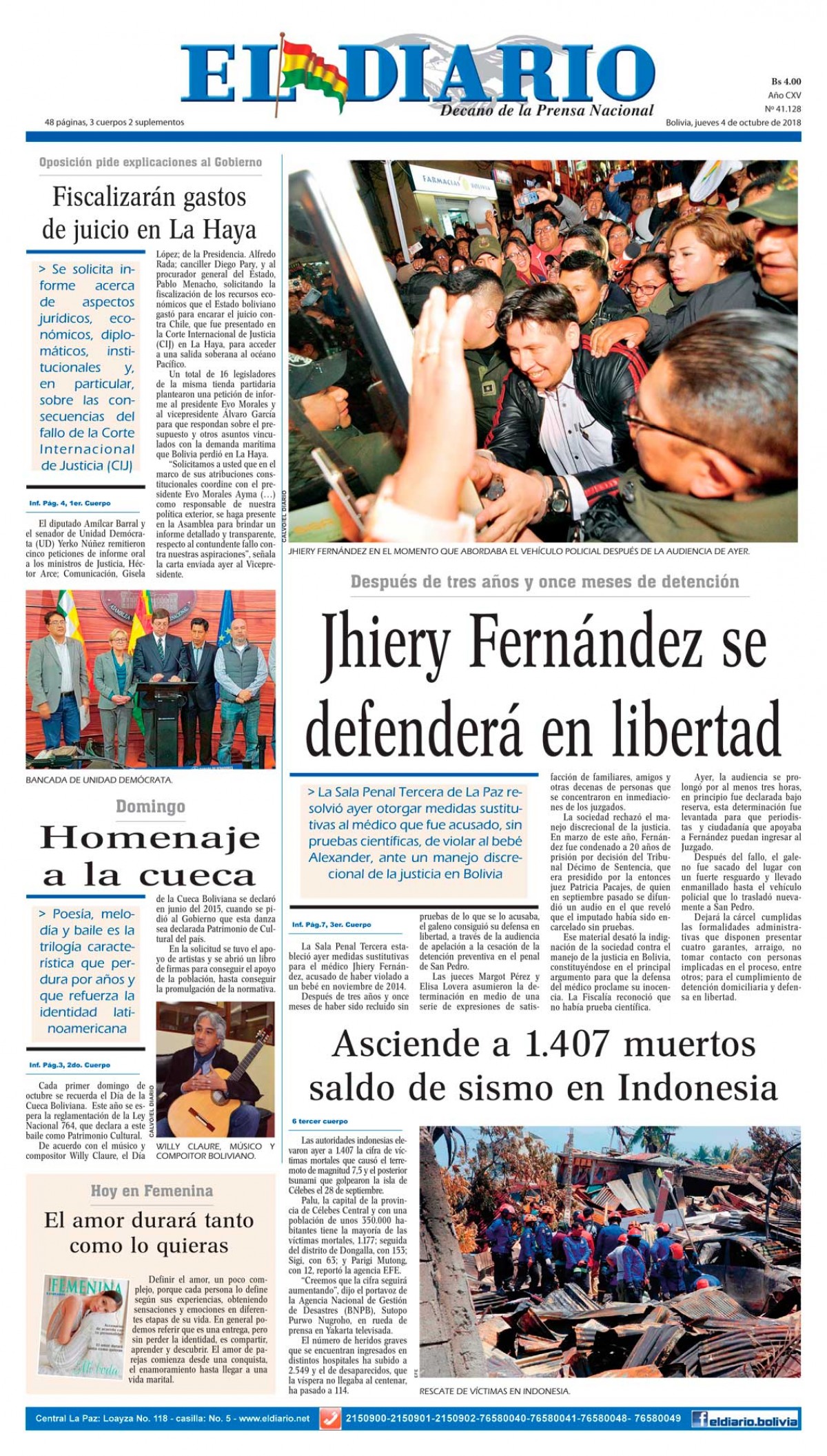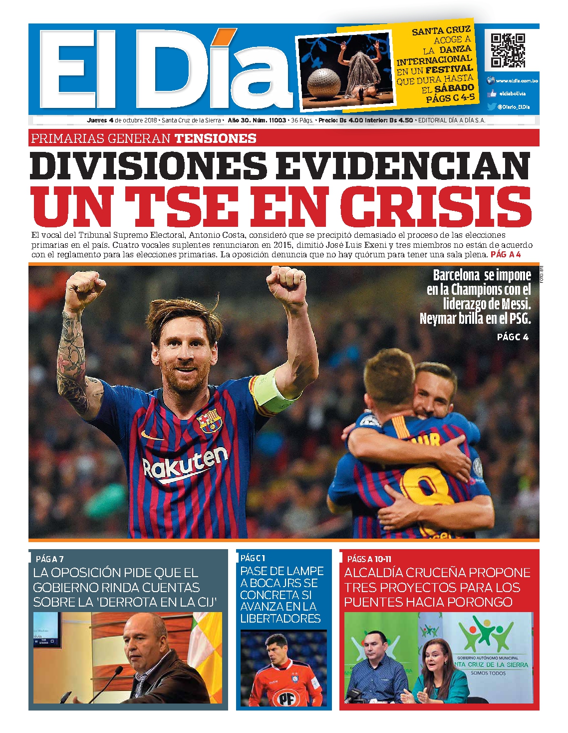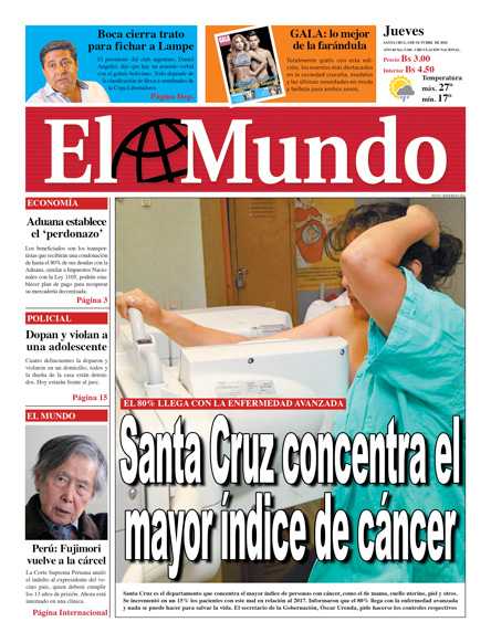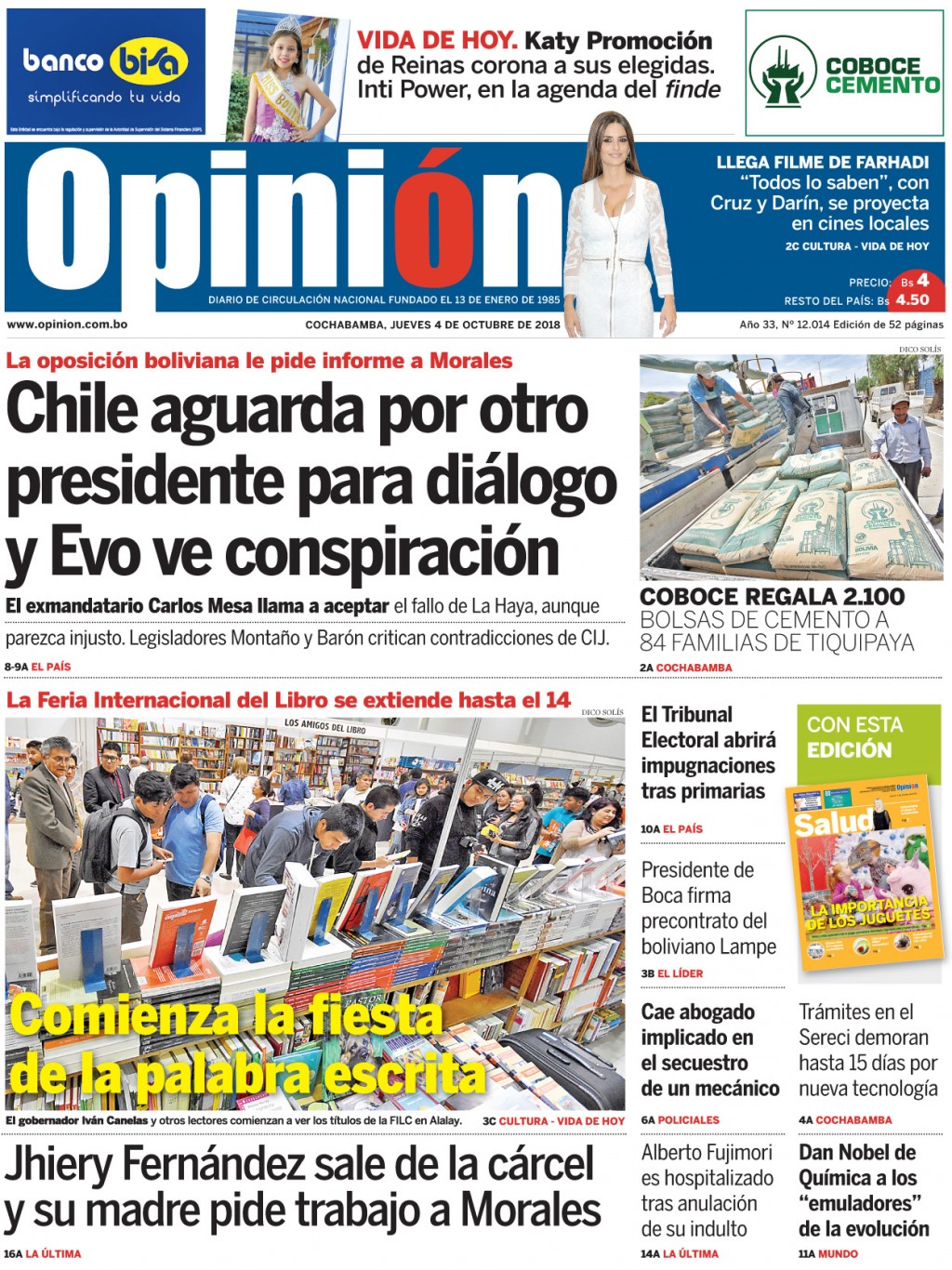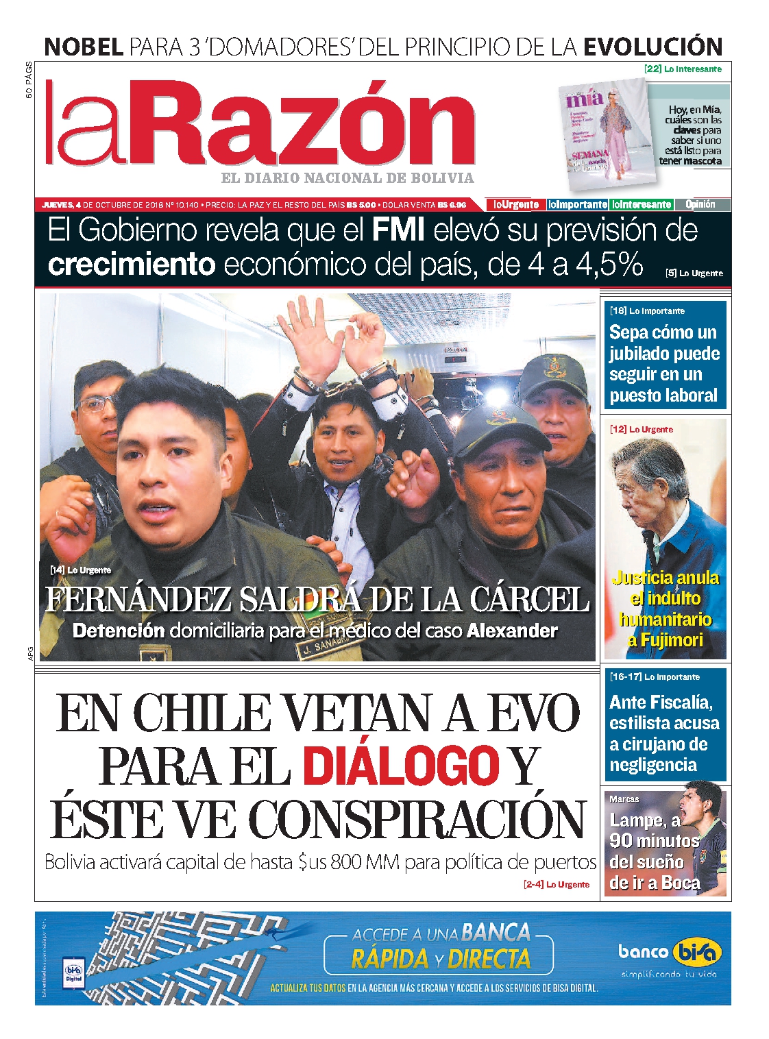 Portadas de periódicos de Bolivia del jueves 4 de octubre de 2018