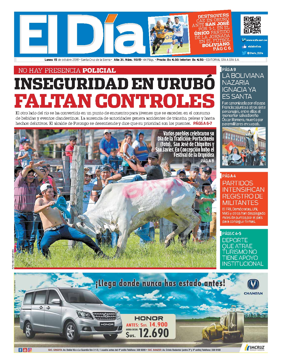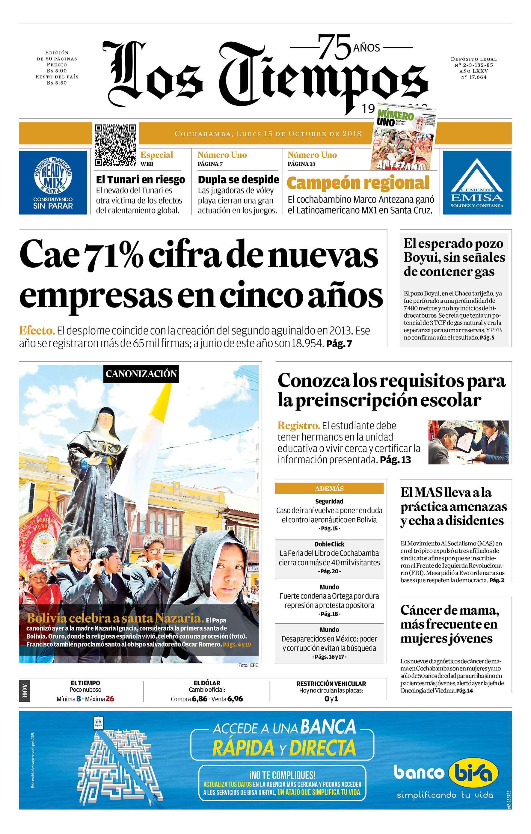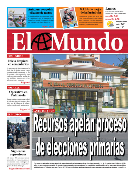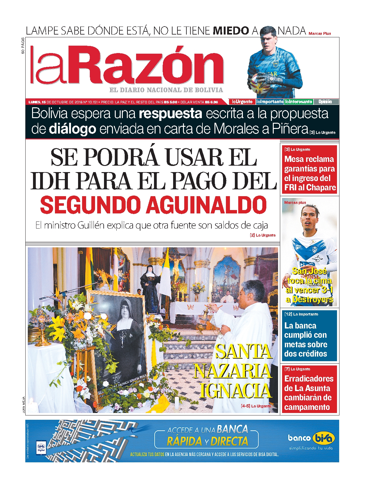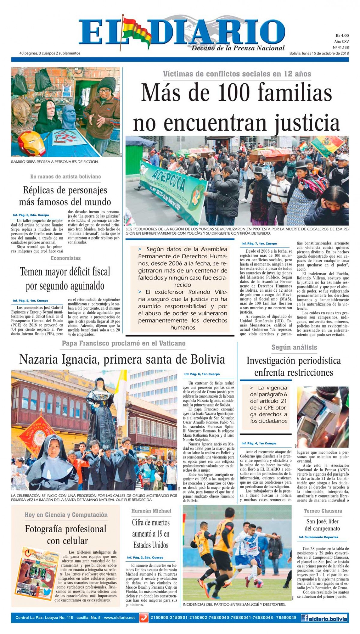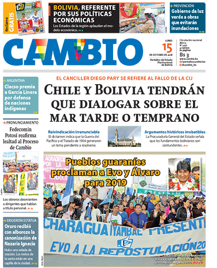 Portadas de periódicos de Bolivia del lunes 15 de octubre de 2018