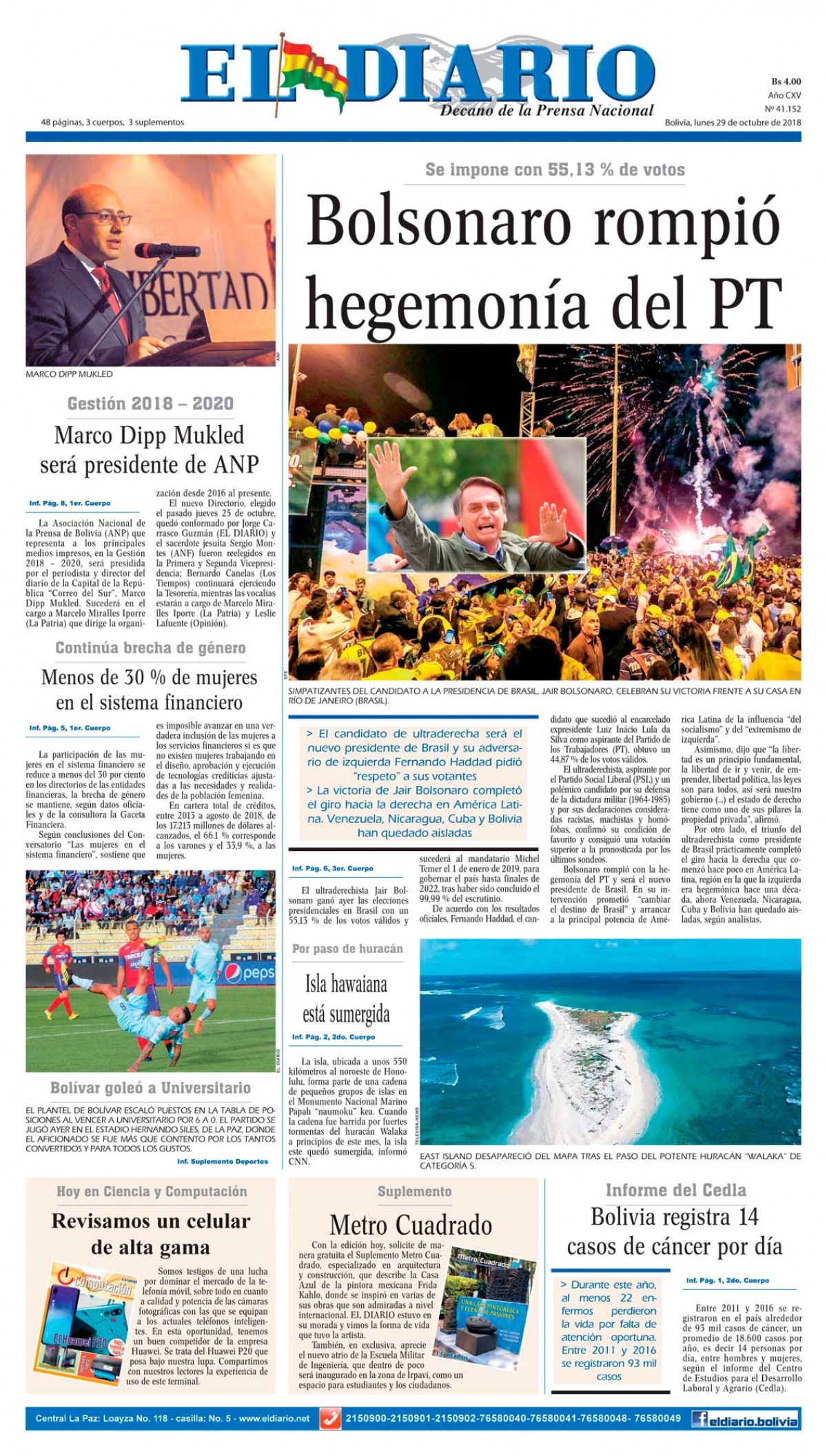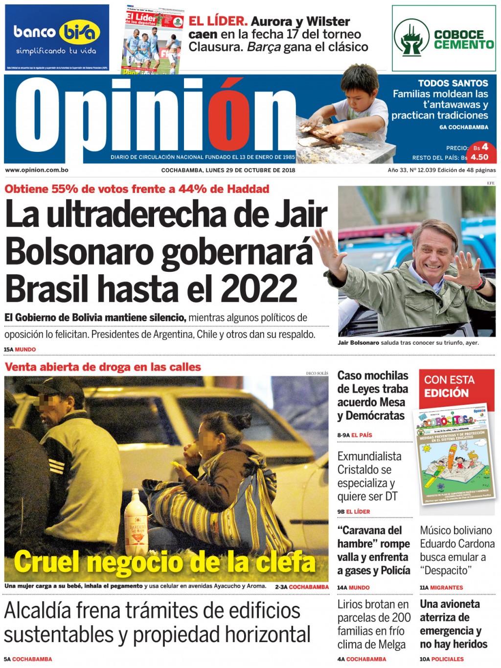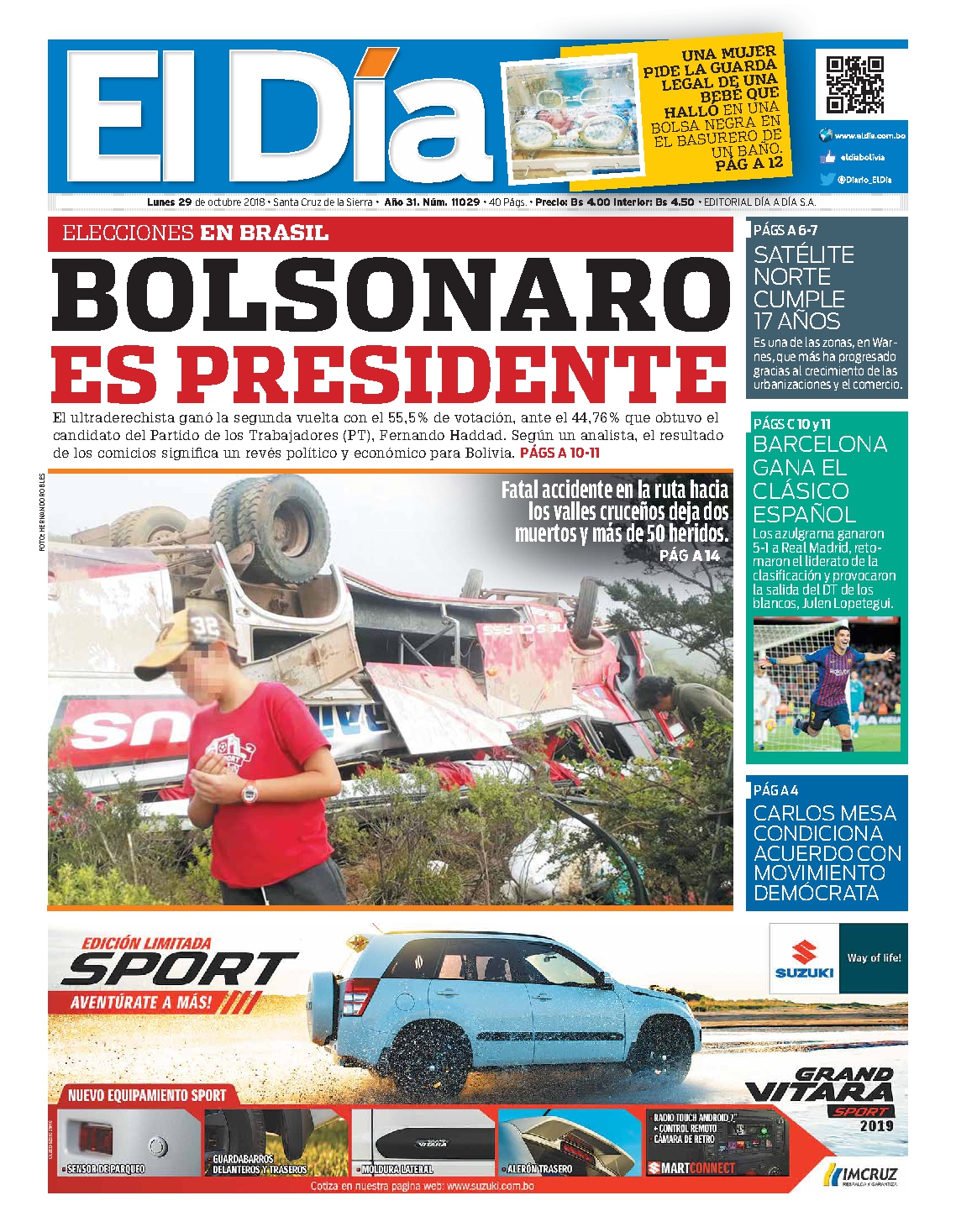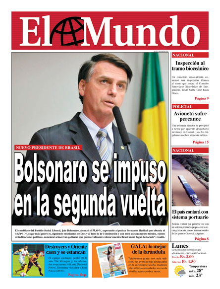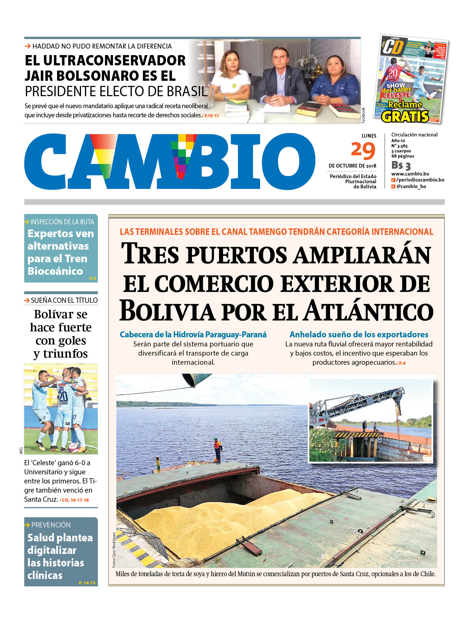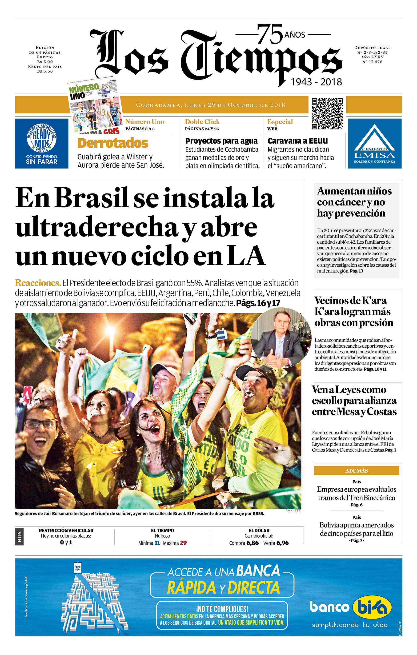 Portadas de periódicos de Bolivia del lunes 29 de octubre de 2018Categorías MonitoreoEtiquetas , Portadas de periódicos 29/10/2018 El Deber – Los Tiempos – El Día – La Razón – Cambio – El Diario – Página Siete – Opinión