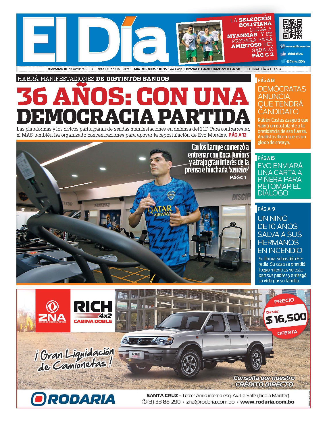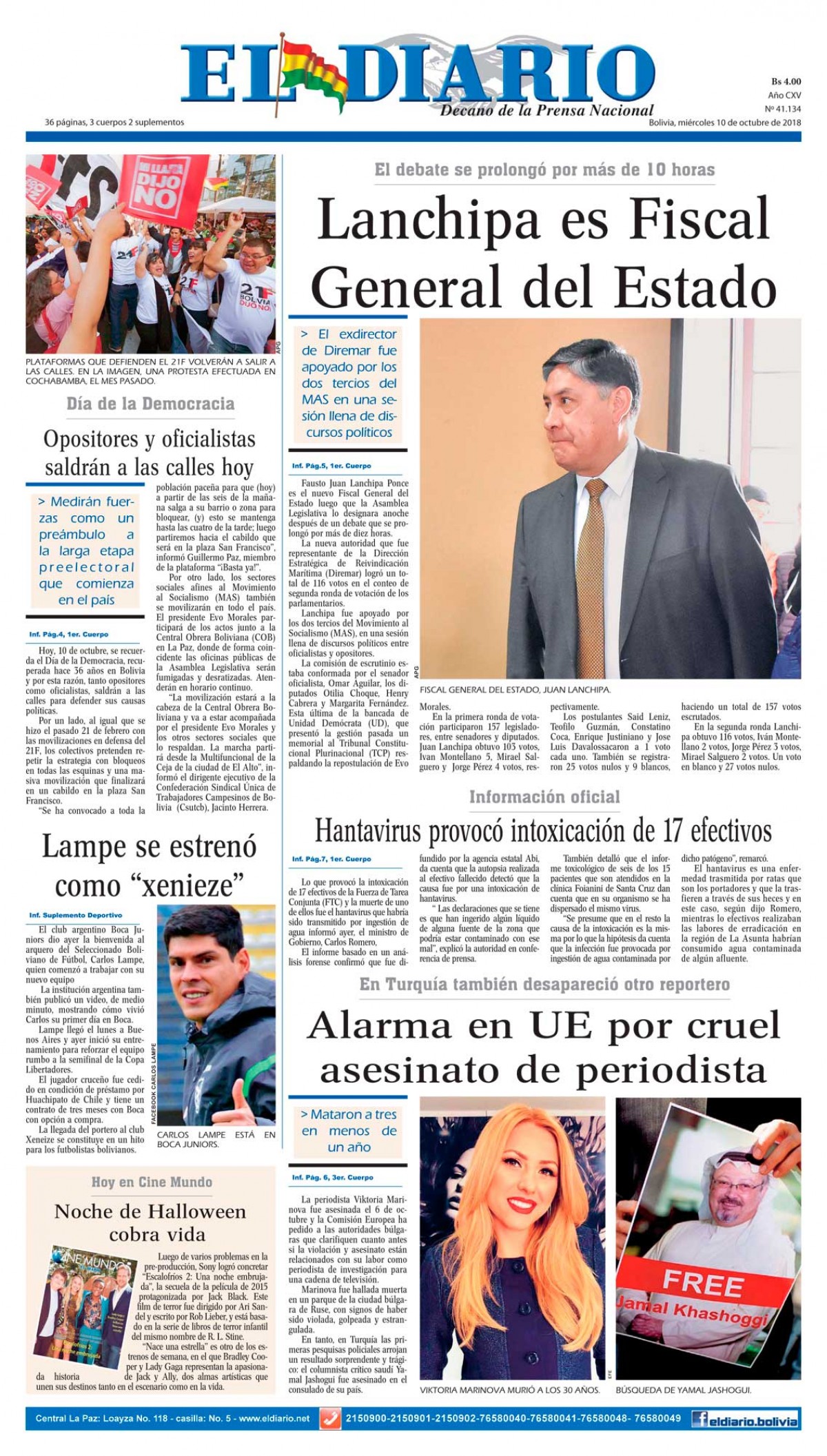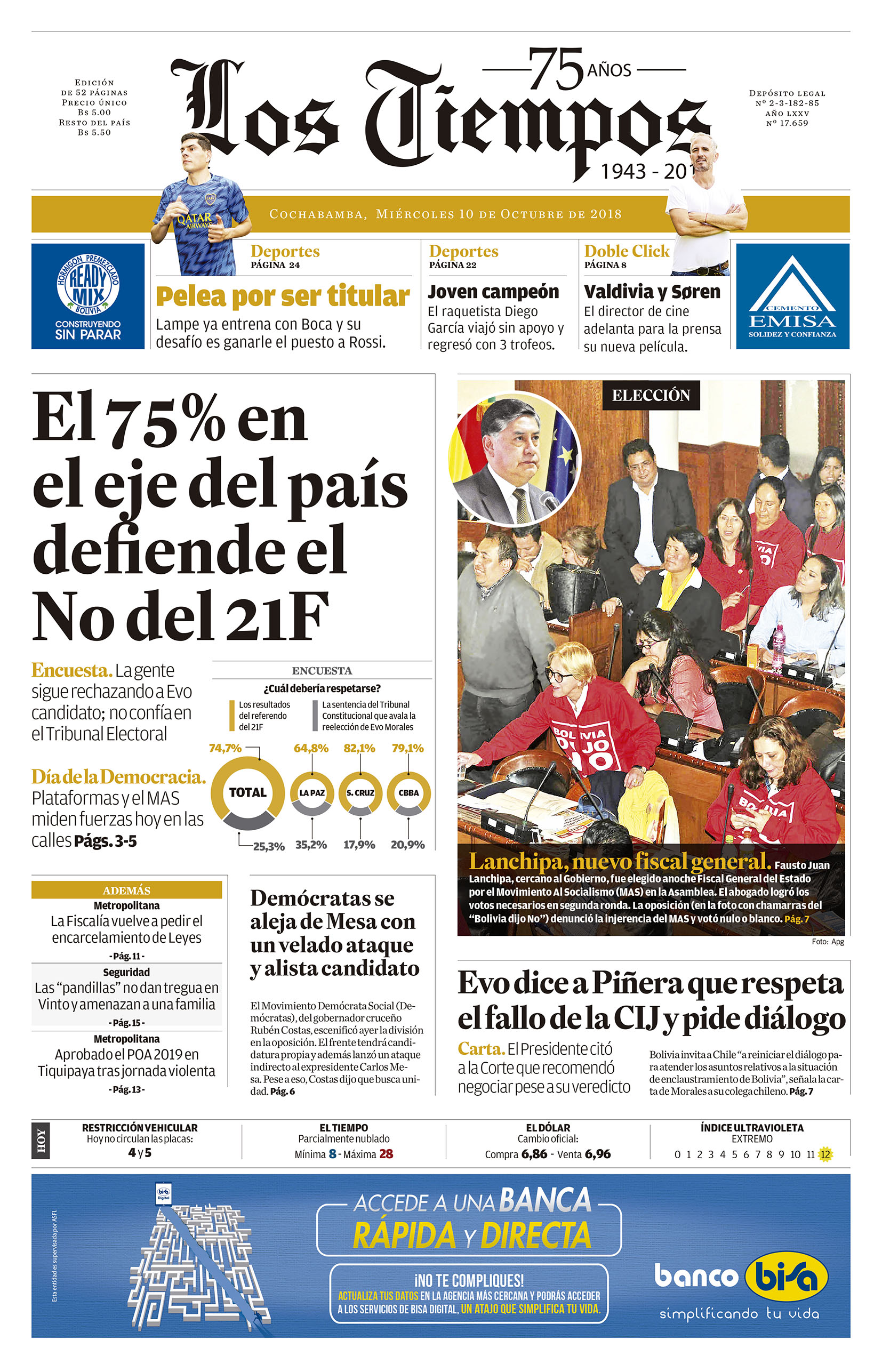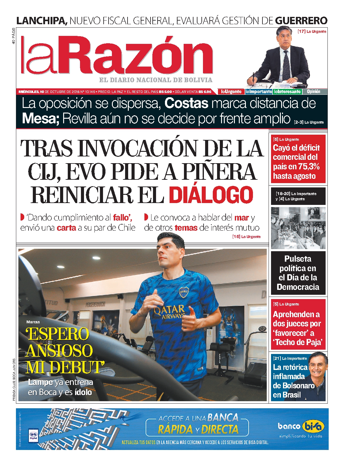 Portadas de periódicos de Bolivia del miércoles 10 de octubre de 2018
