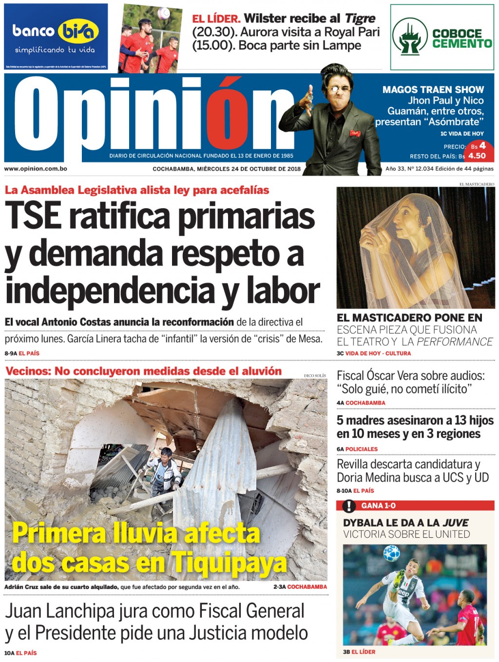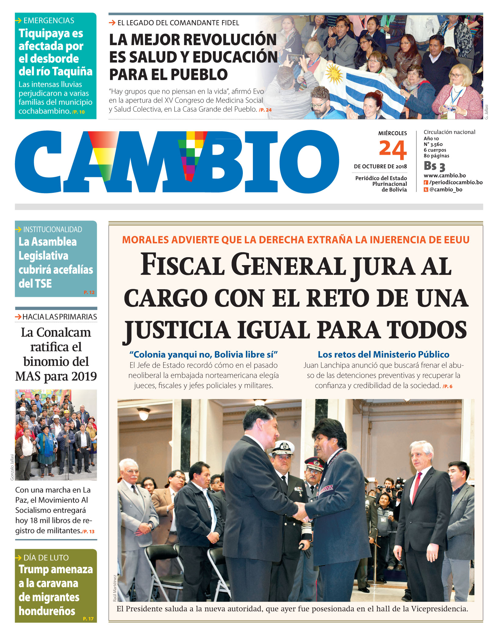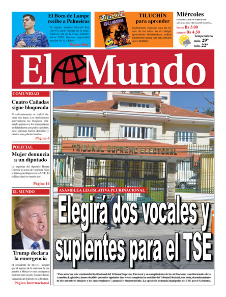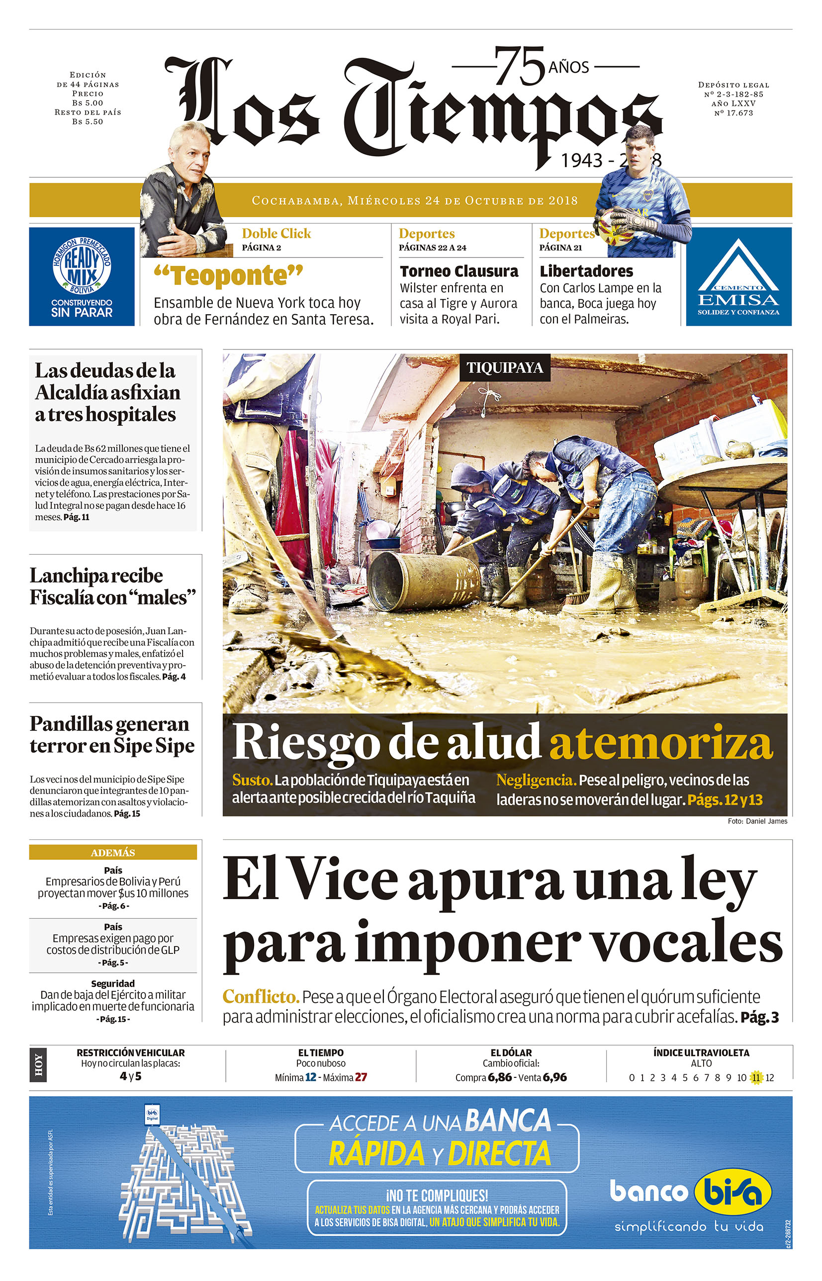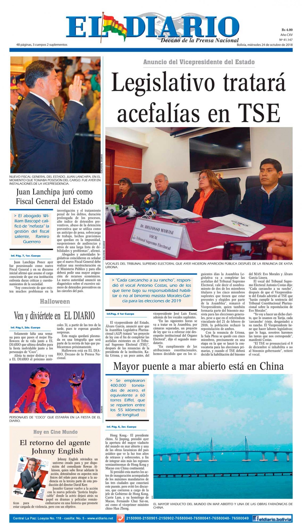 Portadas de periódicos de Bolivia del miércoles 24 de octubre de 2018Categorías MonitoreoEtiquetas , Portadas de periódicos 24/10/2018 El Deber – Los Tiempos – El Día – La Razón – Cambio – El Diario – Página Siete – Opinión