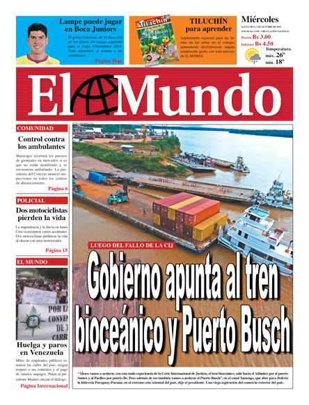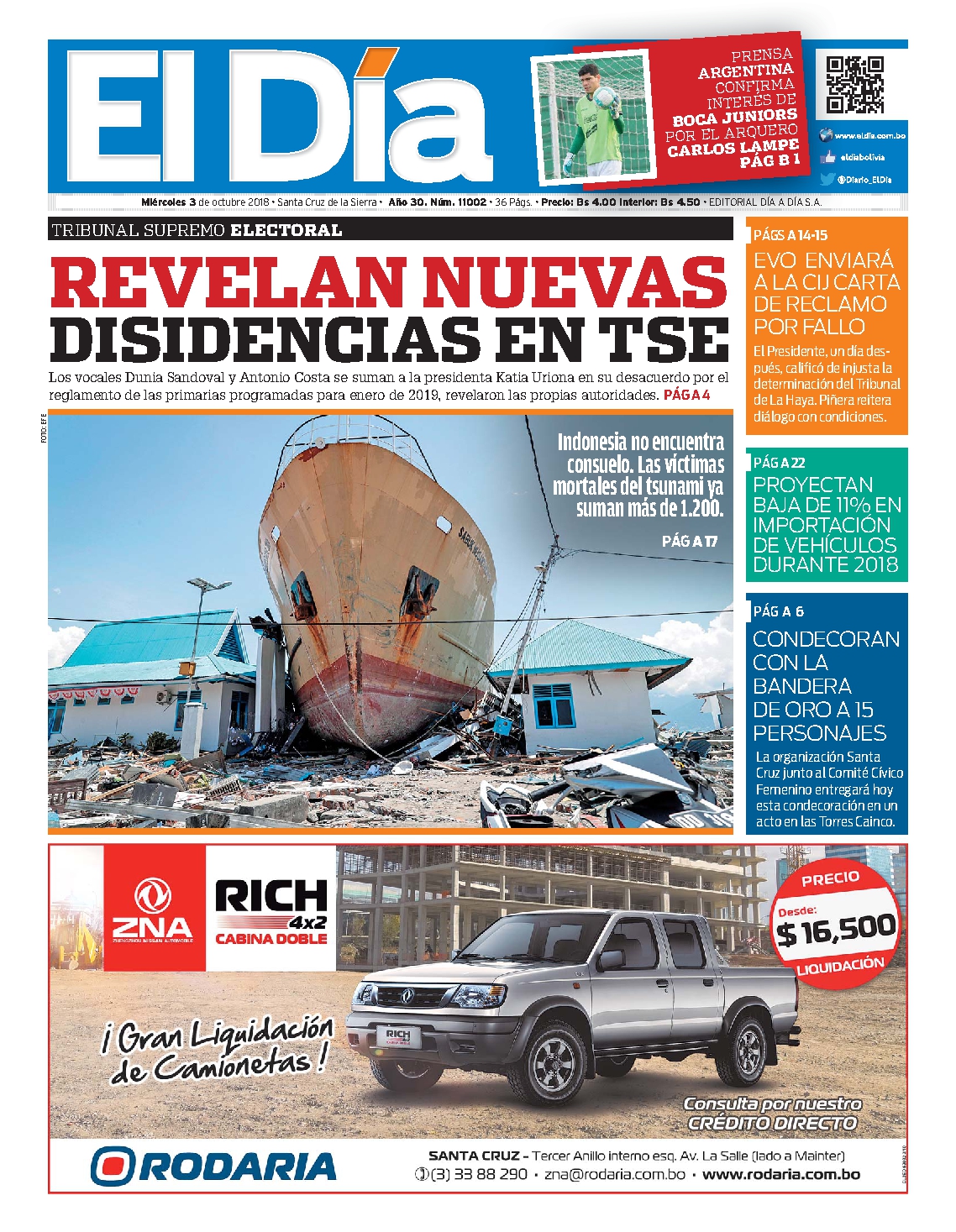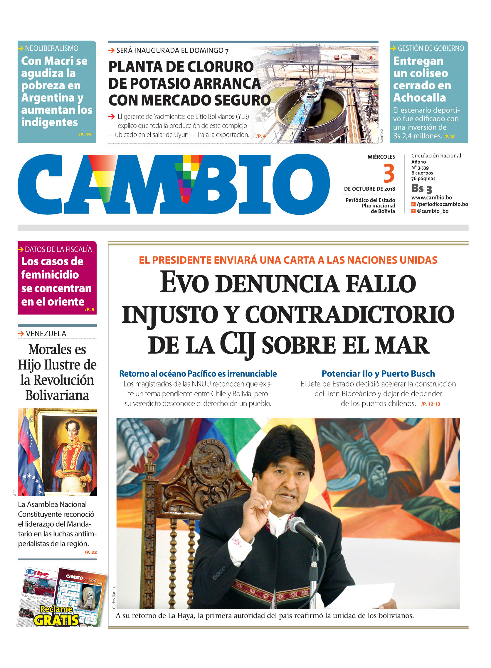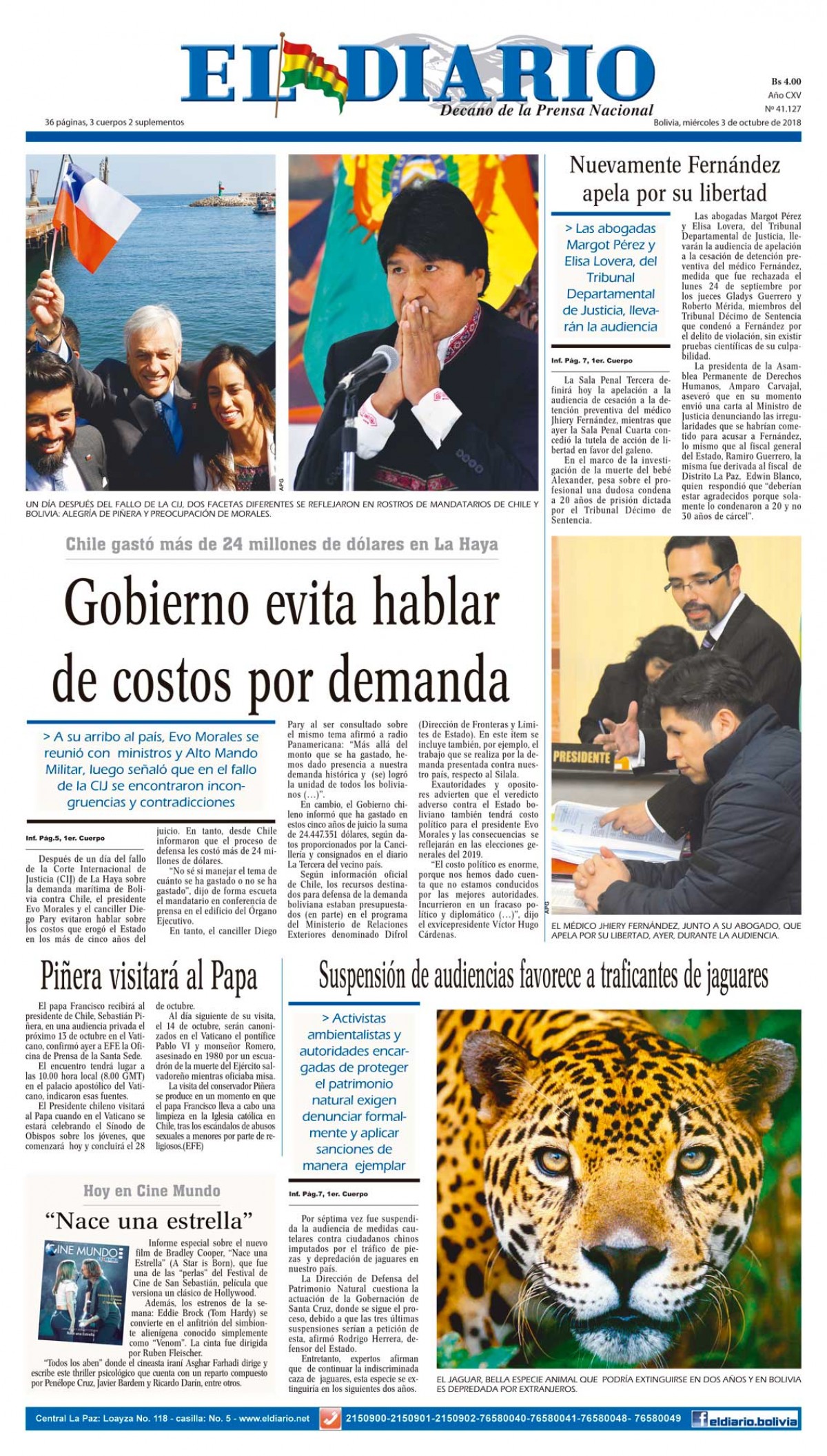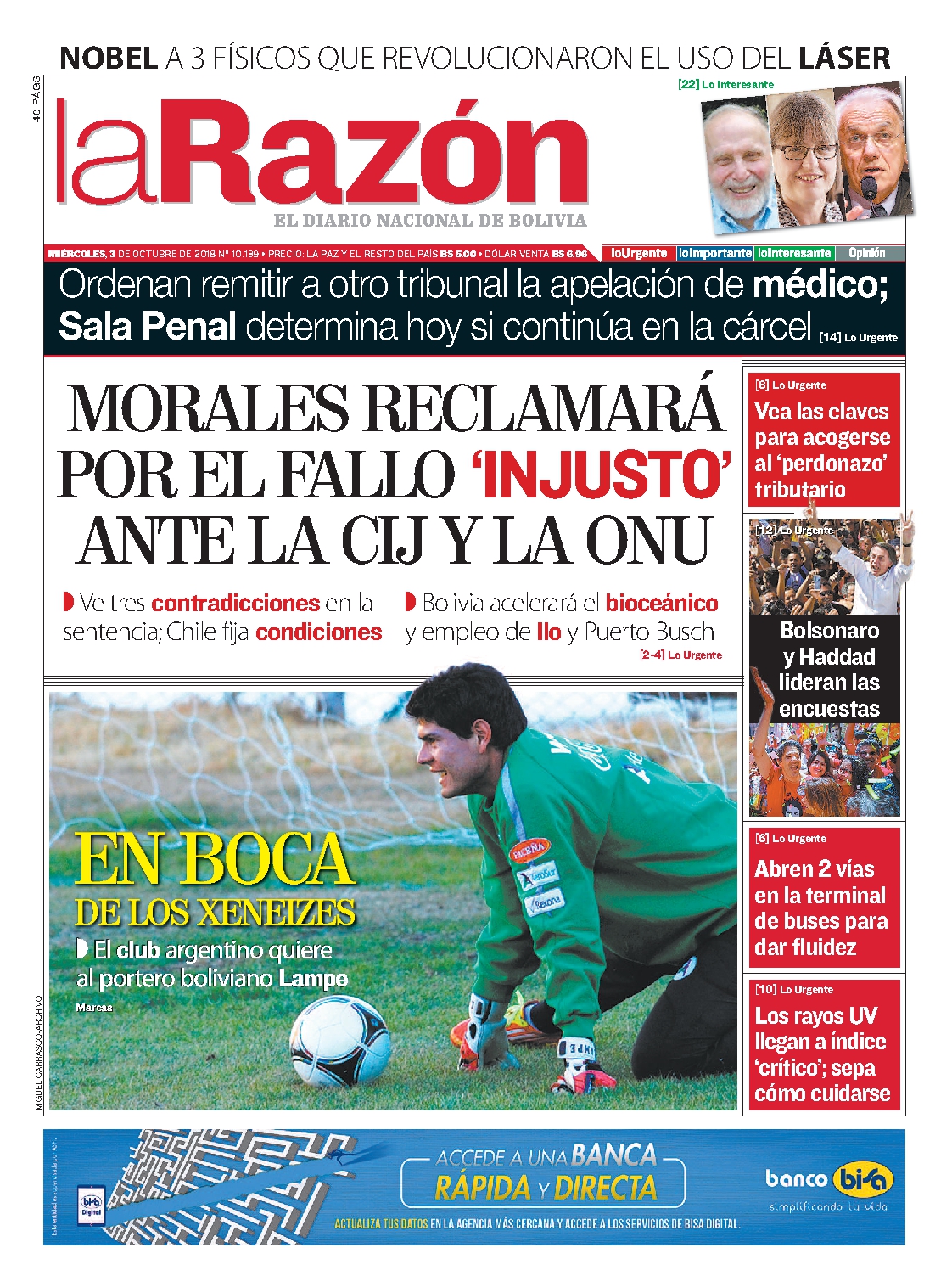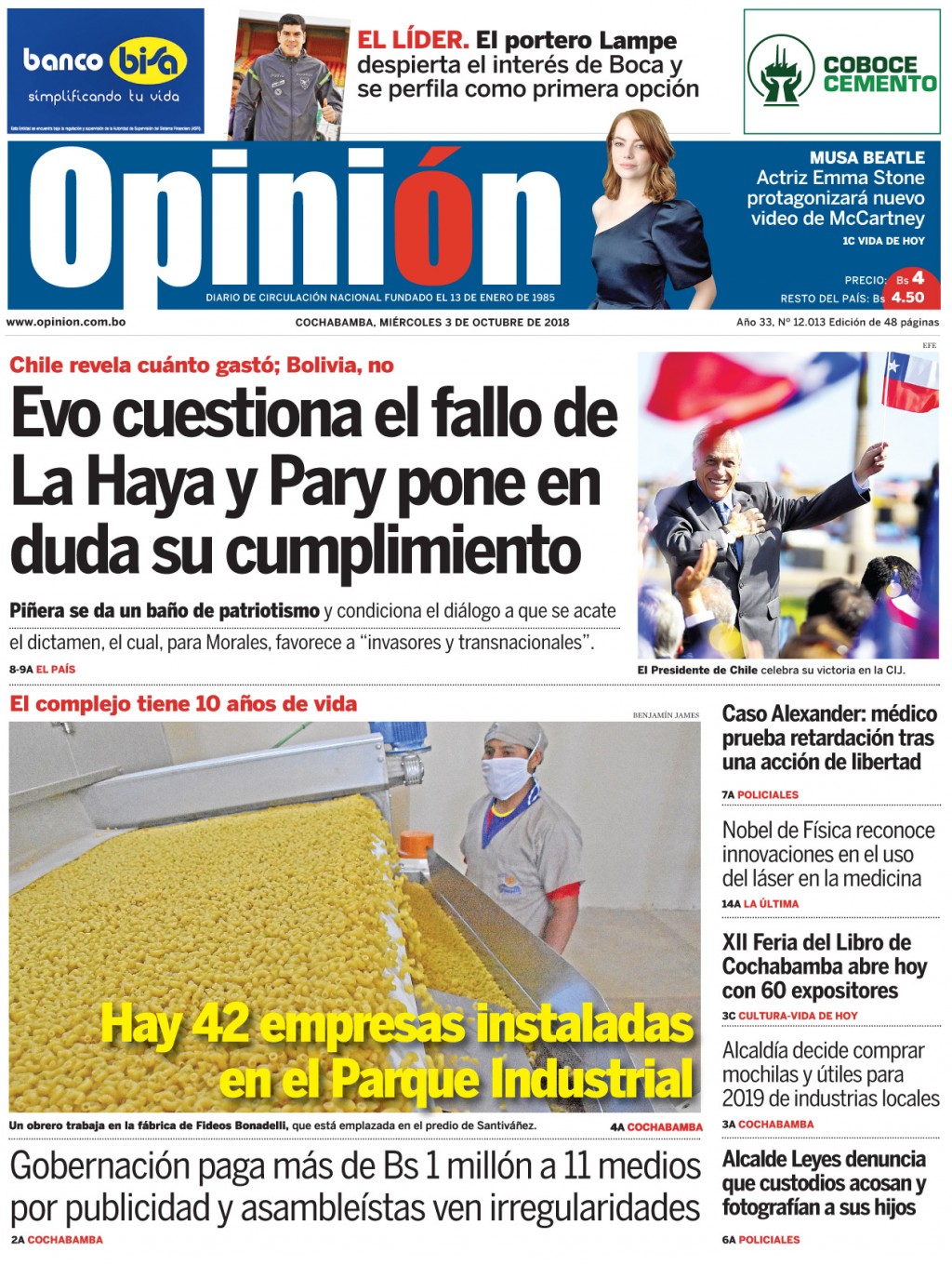 Portadas de periódicos de Bolivia del miércoles 3 de octubre de 2018Categorías MonitoreoEtiquetas , Portadas de periódicos 03/10/2018 El Deber – Los Tiempos – El Día – La Razón – Cambio – El Diario – Página Siete – Opinión