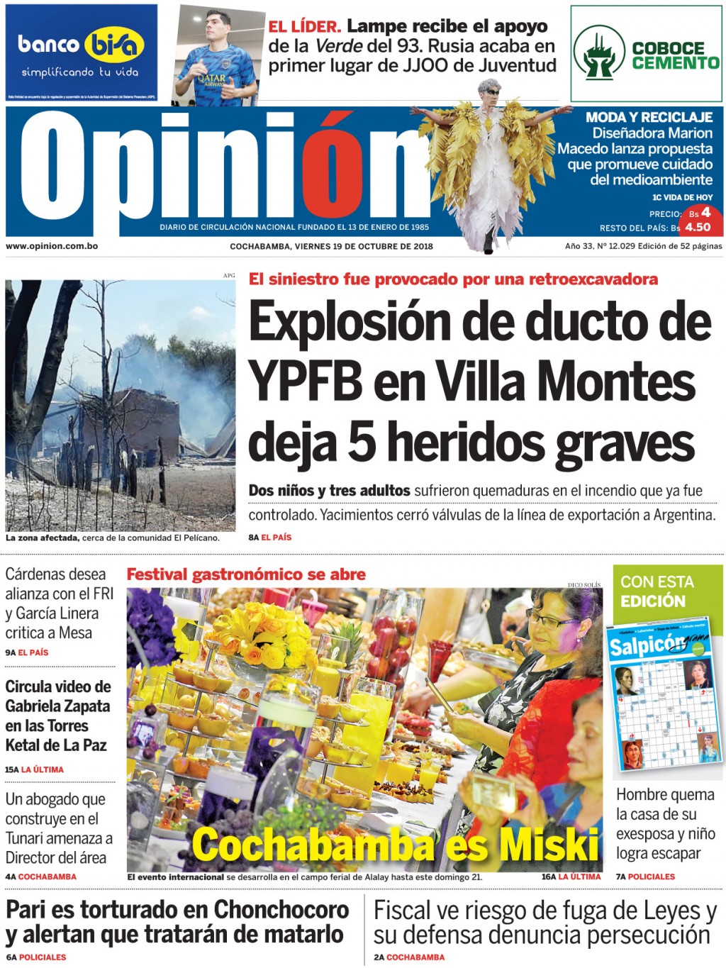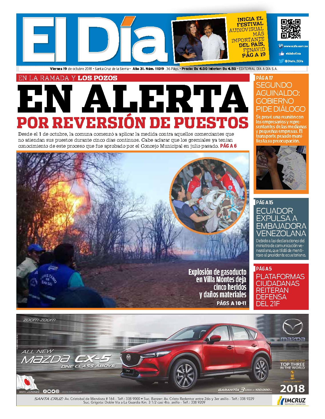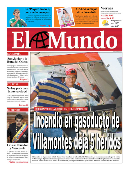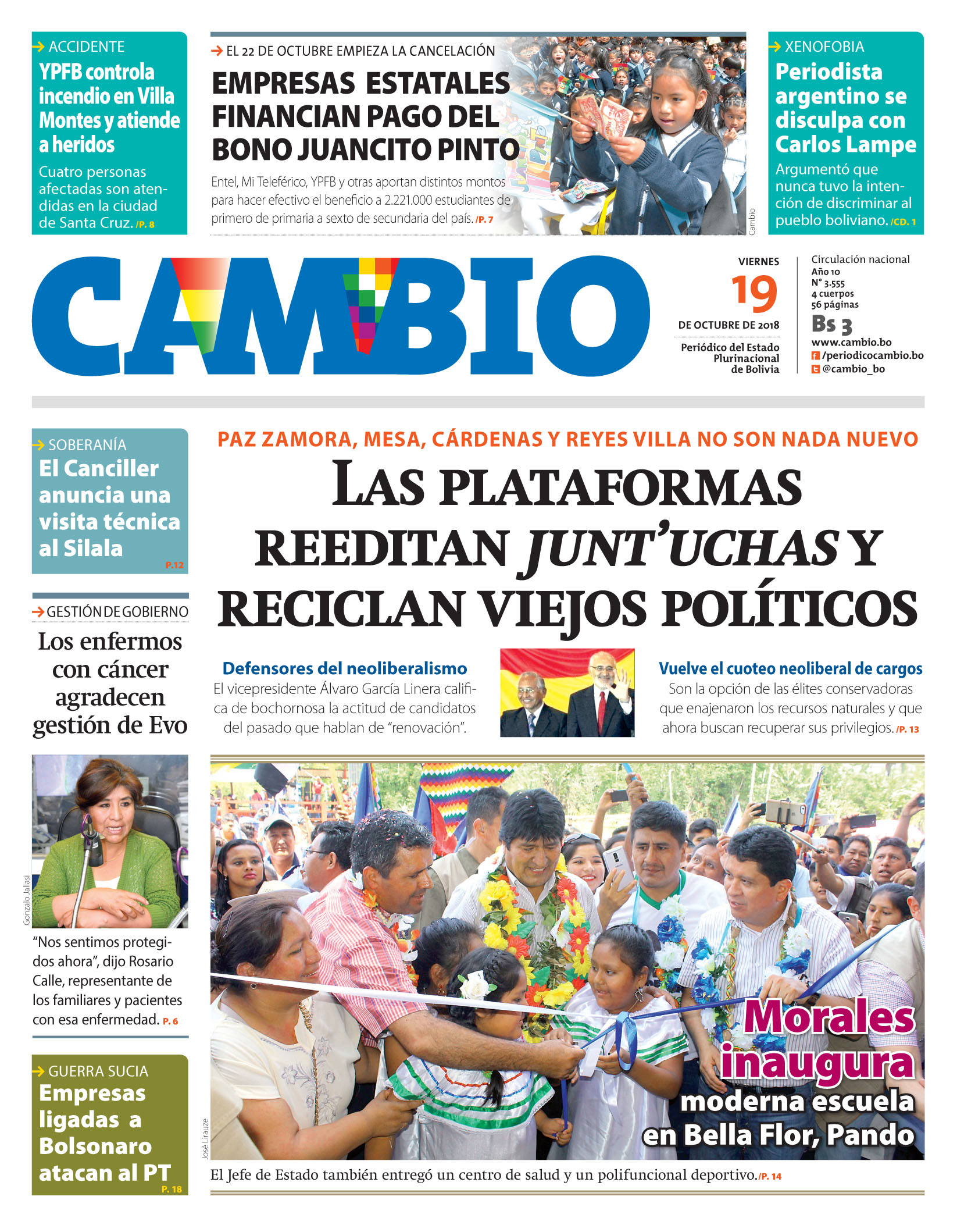 Portadas de periódicos de Bolivia del viernes 19 de octubre de 2018Categorías MonitoreoEtiquetas , Portadas de periódicos 19/10/2018 El Deber – Los Tiempos – El Día – La Razón – Cambio – El Diario – Página Siete – Opinión