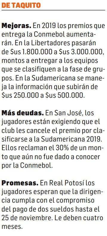 De esta manera, la única solución para sanear la deuda es que el santo logre el cupo restante para la fase de grupo de la Libertadores 2019. El primero fue para Wilstermann, y San José debe ser campeón de este Clausura para ganar ese premio, que le asegura un ingreso de $us 3.000.000 de parte de la Conmebol.