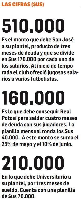 Las deudas tienen con la soga al cuello a varios clubes de la División Profesional. Real Potosí, con cuatro salarios, y San José y Universitario, con tres, son los que más deben a sus plantillas y el panorama para conseguir el dinero para saldar sus cuentas hasta antes de fin de año no es nada esperanzador.