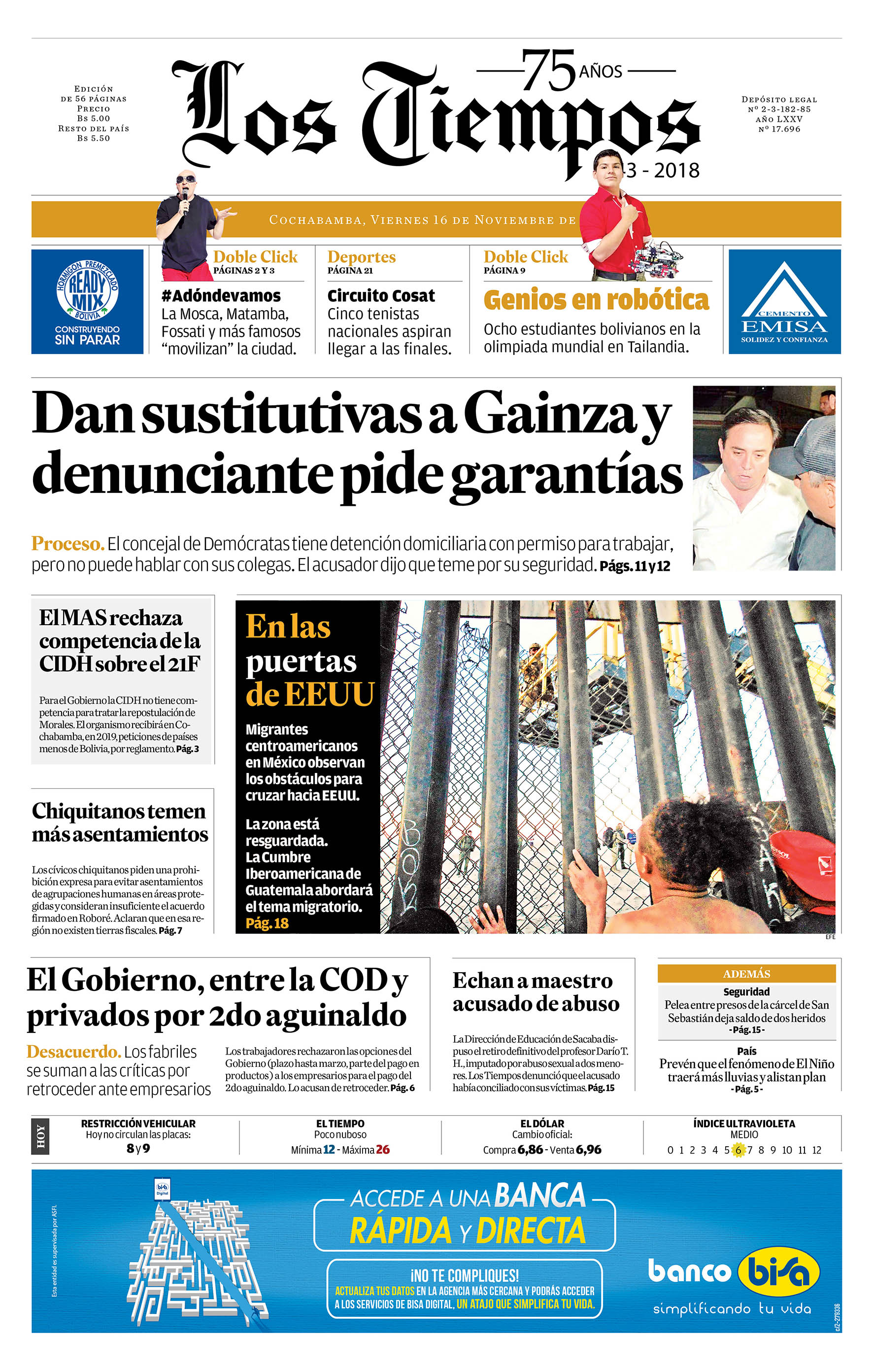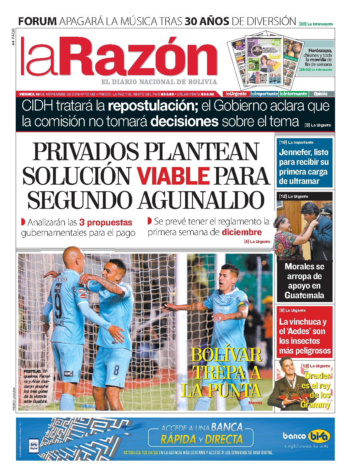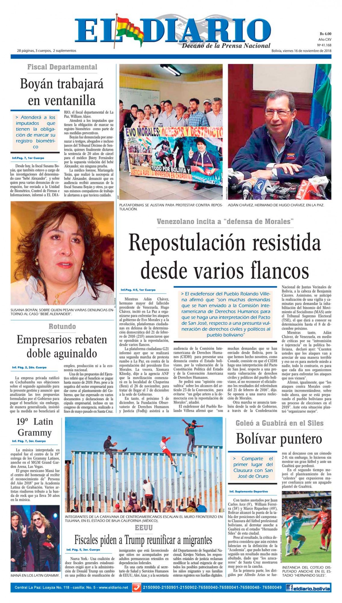 Portadas de periódicos de Bolivia del viernes 16 de noviembre de 2018