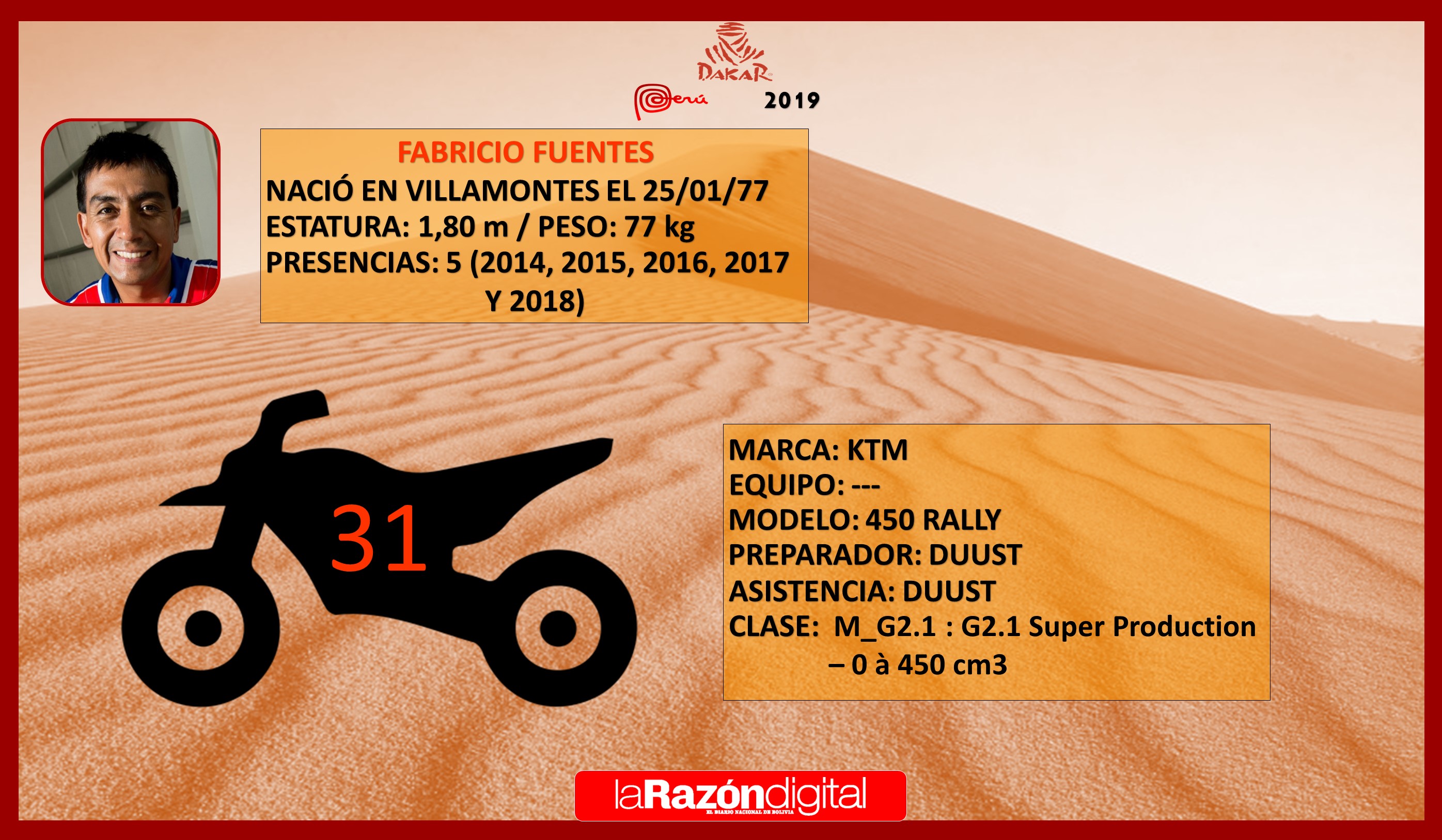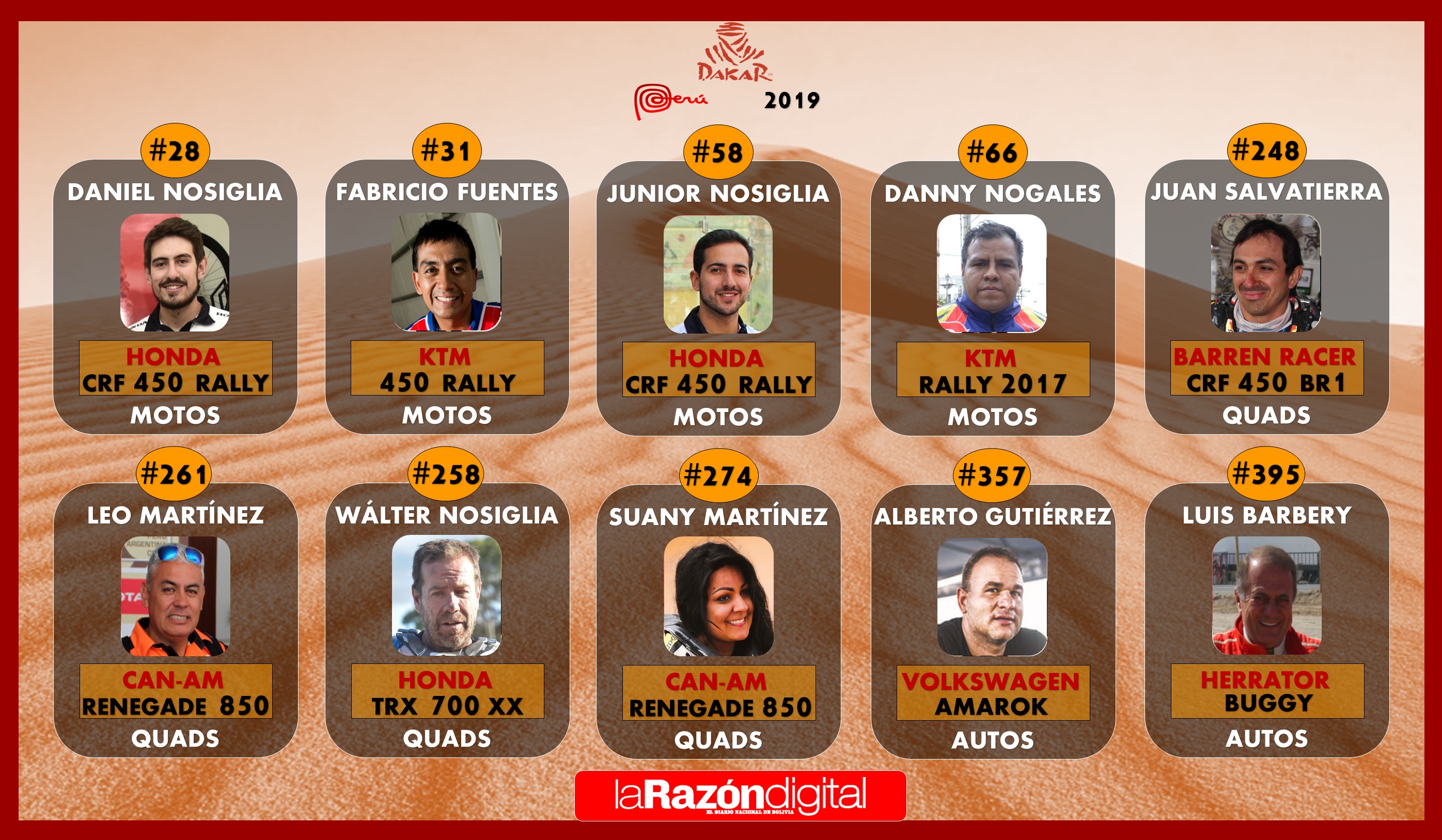 Cuatro corredores participarán en motos, cuatro en cuadriciclos y dos en coches. La gran ausencia para esta edición es la del automovilista Marco Bulacia, que el año pasado terminó en la posición 14.