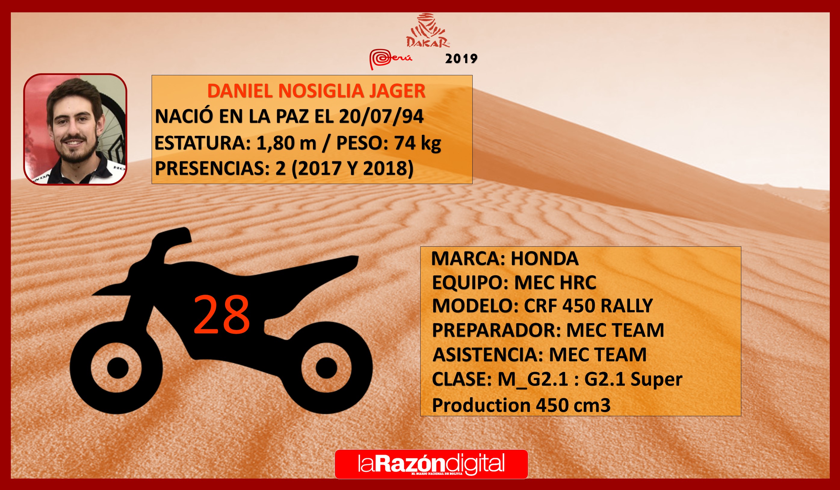 Con dos experiencias en el Dakar, Daniel y Wálter Junior apuestan por hacer podio en motos tras sus participaciones en 2017 y 2018. Ambos competidores anunciaron que integrarán el 2019 el equipo MEC HRC de Honda con asistencia profesional de la marca japonesa, un gran salto para los jóvenes corredores.