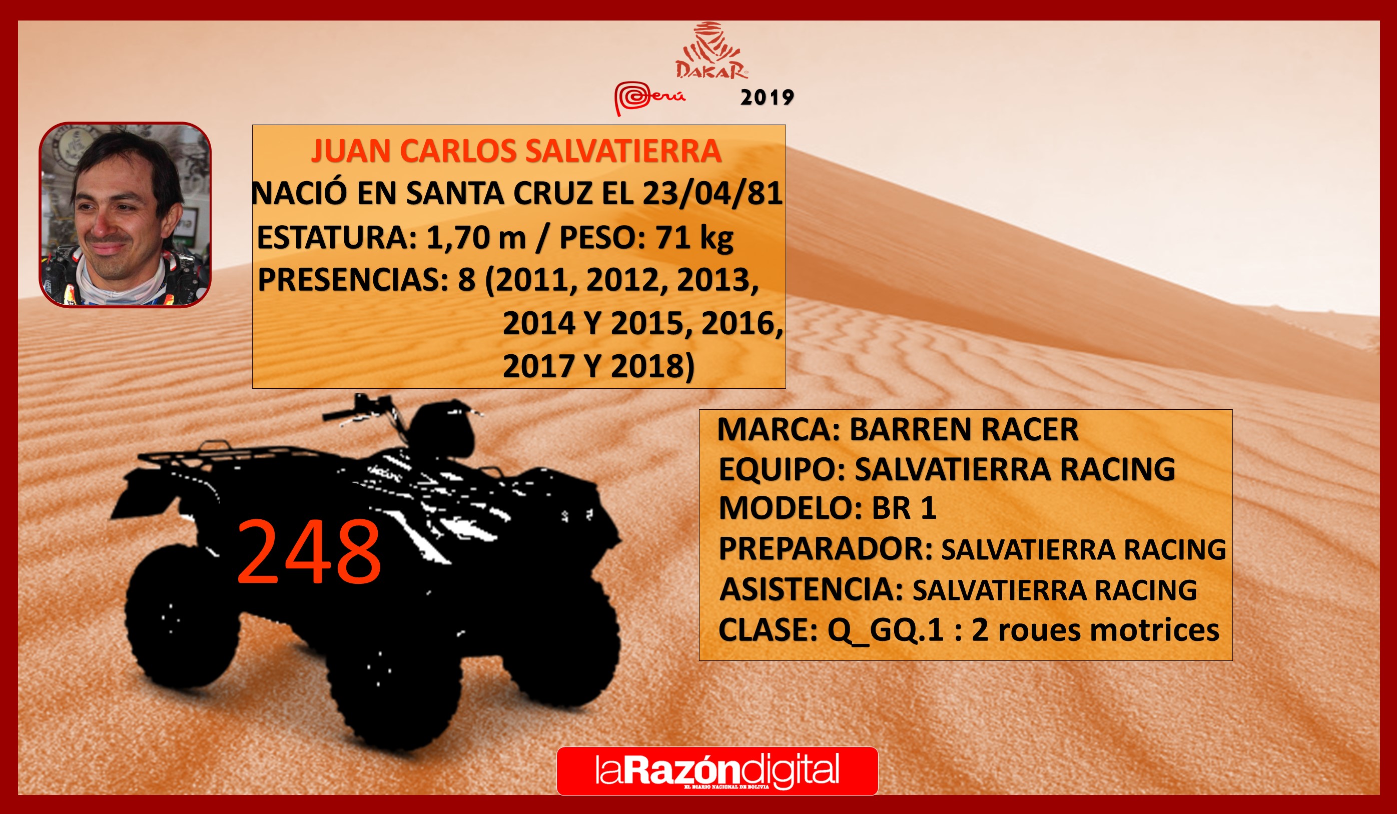 Juan Carlos Salvatierra es el piloto boliviano con más experiencia en el Dakar, participó en ocho ediciones, todas ellas en motos, y ahora cambia de categoría para correr en cuadriciclos con la meta de ser el número uno. Correrá en una Barren Racer BR1.