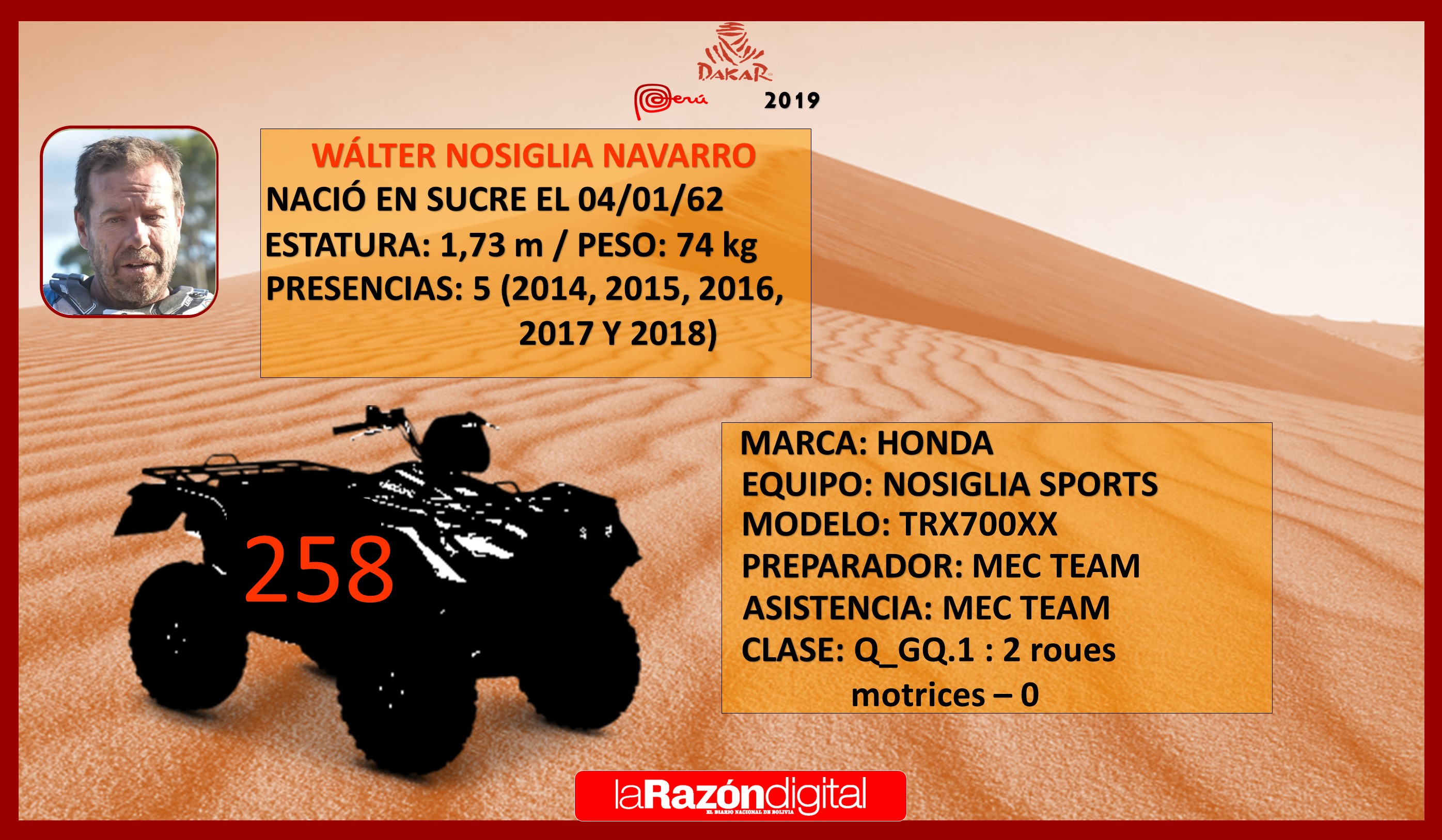 El “Lobo del desierto” vuelve a incursionar en un Dakar; será su sexta presencia motivado por volver a hacer podio como en 2015 cuando quedó en tercer lugar consiguiendo la mejor clasificación de un piloto nacional en la competencia y olvidar los abandonos de 2014 y 2017. Su bólido para esta ocasión será un quad Honda TRX700XX y estará asistido por el Team Mec de Honda.