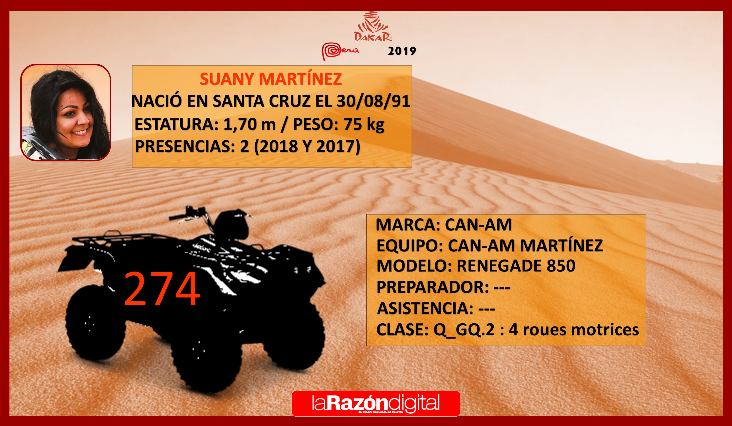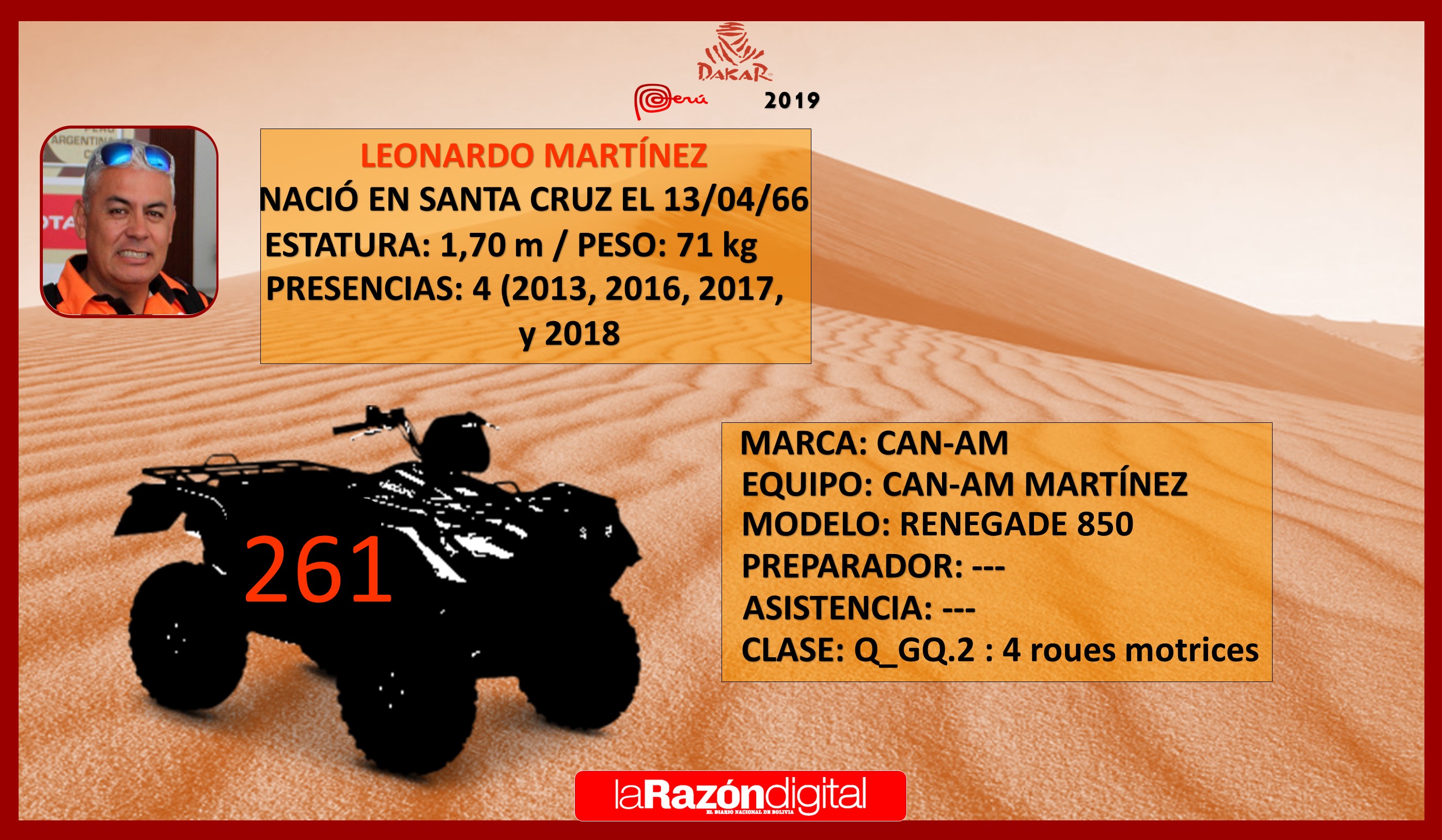 Leonardo Martínez y su hija Suany correrán nuevamente en los cuadriciclos del Rally Dakar en la que podría ser su última participación. En una entrevista con La Razón reconocieron que estudian la posibilidad de alejarse de las rutas tras el 2019. Leonardo compitió en cuatro carreras y Suany en dos. Ambos participarán en vehículos Can-Am Renegade.