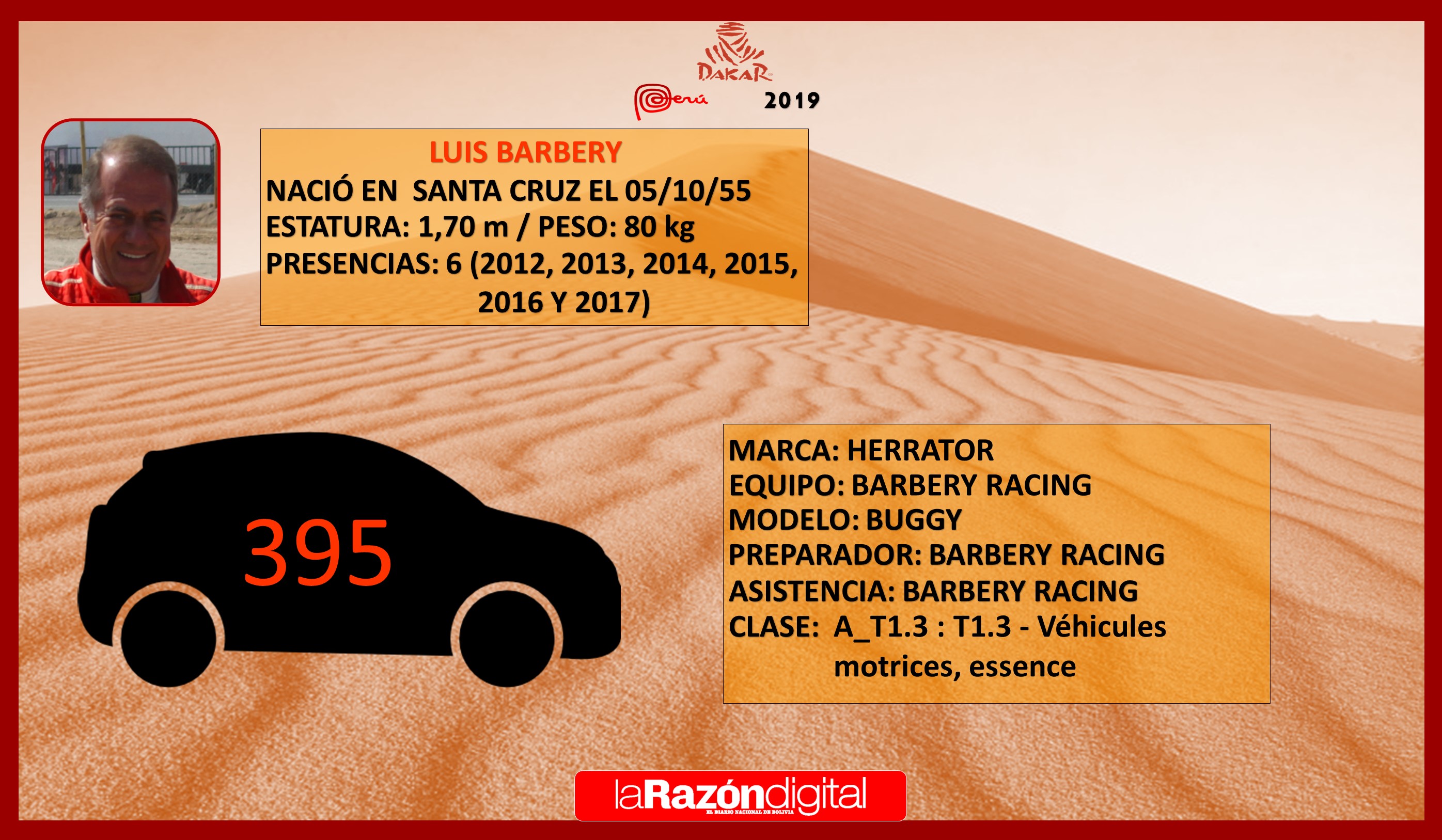 Para Luis Barbery la prueba de 2019 es una revancha, tras su ausencia en 2018. Lleva seis Dakar disputados con tres arribos a la meta. En 2016 fue protagonista de una dramática escena cuando su vehículo quedó reducido a cenizas al cabo de la segunda etapa. Tiene ganas de volver a la meta en su Herrator Buggy.