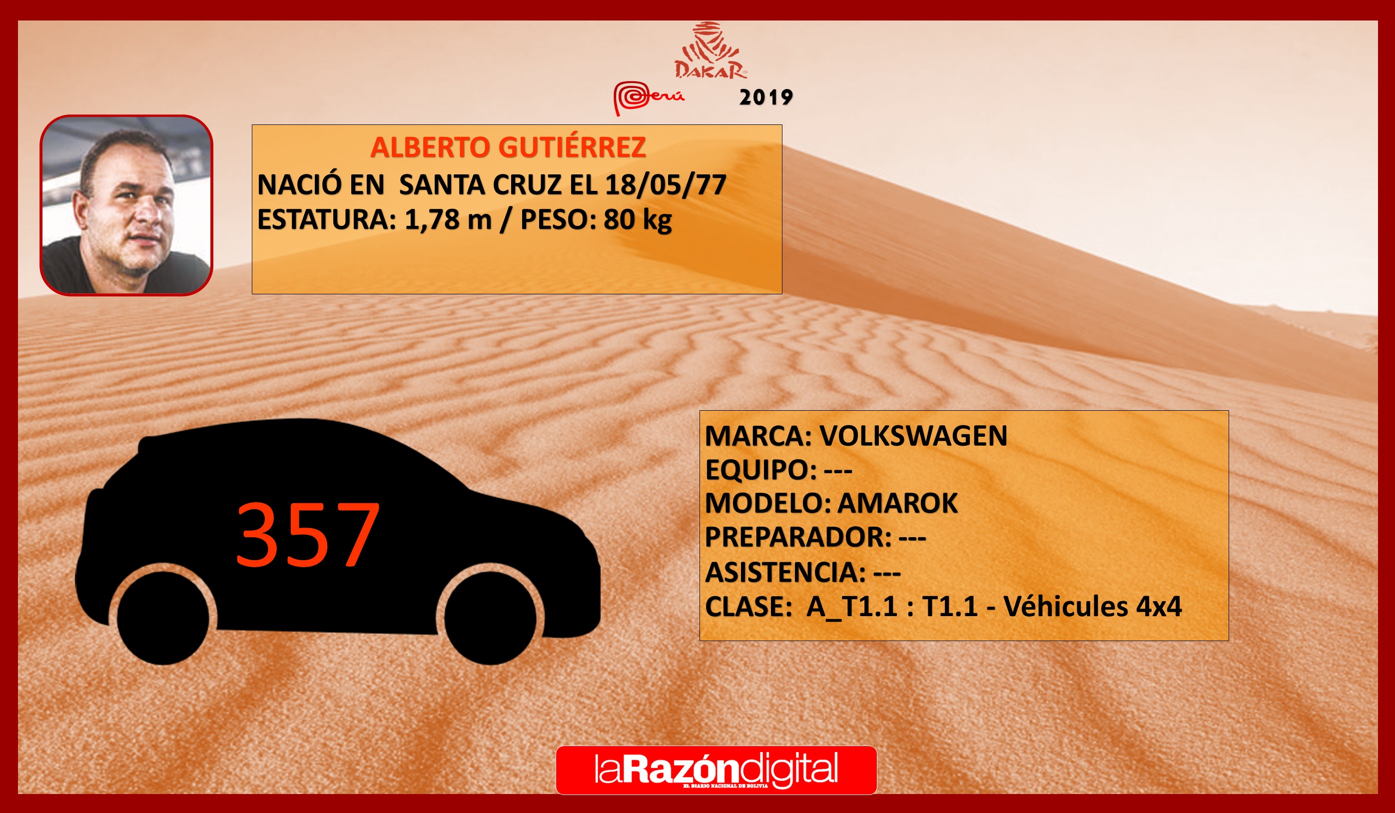 El piloto Alberto Gutiérrez, un experimentado y exitoso corredor nacional, vuelve al Dakar tras no asistir a la carrera del año pasado. Su premisa es volver a destacar como lo hizo en 2017 cuando acabó en la posición 16 de la general en autos, uno de los mejores sitiales bolivianos históricos en la categoría. Su vehículo para 2019 es un Volkswagen Amarok 4×4.