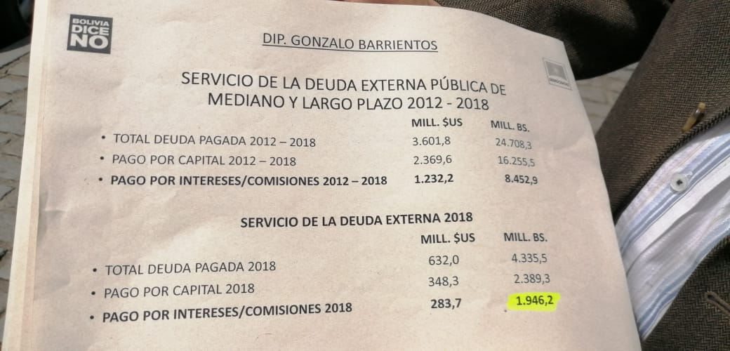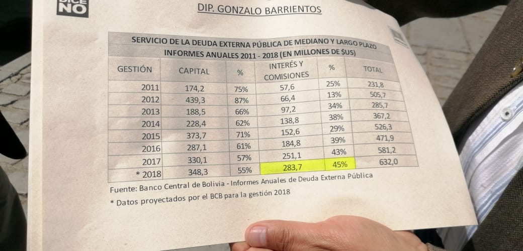 En lo que va el 2018, el pago por el servicio de la deuda externa de Bolivia fue de 632 millones de dólares, de los cuales 348,3 fue para el pago del capital y 283,7 para los intereses y comisiones, señaló Barrientos, según los datos mostrados.