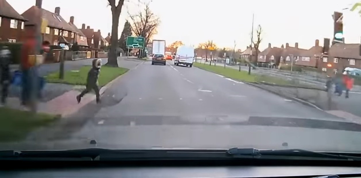 En Inglaterra. La conductora estaba aprendiendo a manejar y el chico se le cruzó adelante corriendo. El episodio fue grabado por la cámara de seguridad del coche.