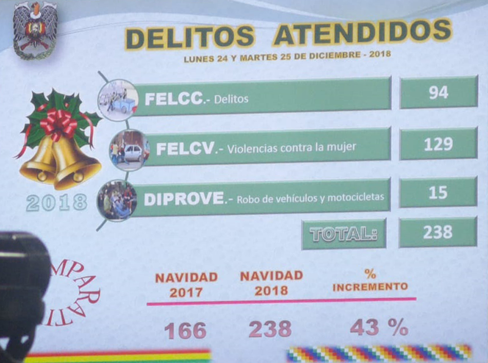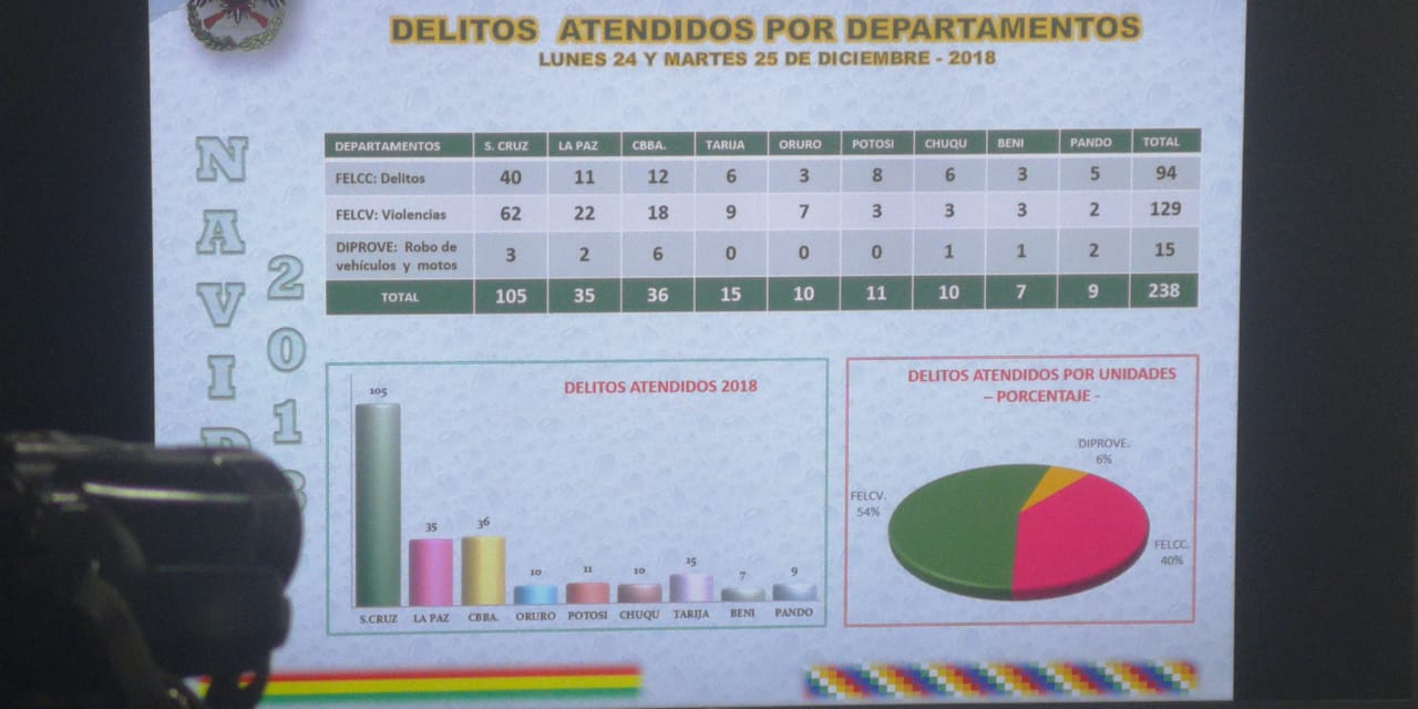 Un total de 238 denuncias sobre delitos cometidos atendió la Policía entre el 24 y 25 de diciembre por la fiesta de Navidad, un 43% más que en 2017. De ellos la mayoría sucedió en Santa Cruz y son casos de violencia contra la mujer, detalló el ministro de Gobierno, Carlos Romero.