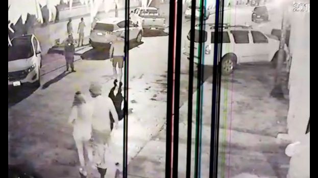 Momento en que la joven sale del local acompañado del grupo de jóvenes