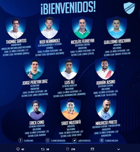 En Bolívar estaban a la expectativa de lo que Marcelo Claure, presidente de Baisa, hubiera anunciado a través del Twitter. Y este sábado, pasado el mediodía, el mandamás celeste anunció a ¡10 refuerzos para 2019!. Llaman la atención la incorporación del brasileño Thomaz Santos y de los arqueros Guillermo Viscarra y Saidt Mustafá.