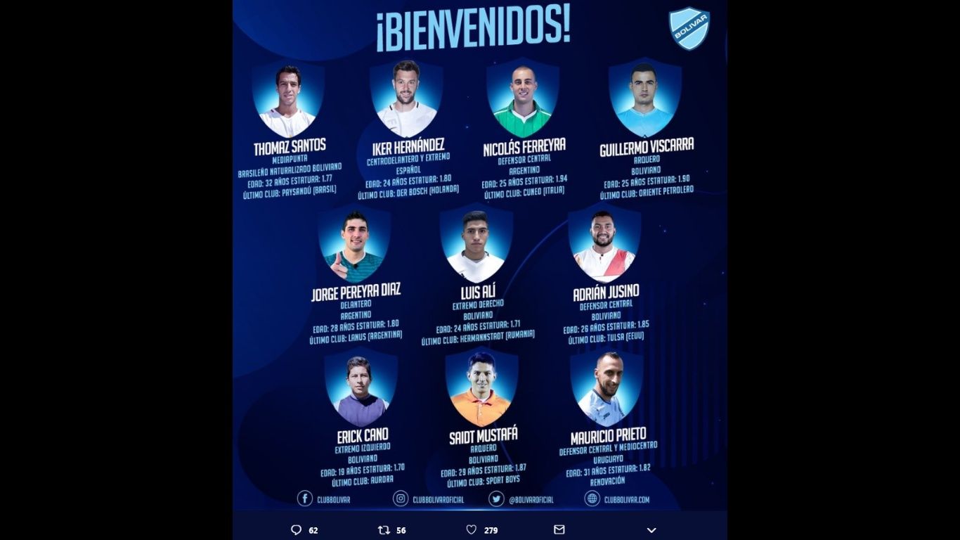 En Bolívar estaban a la expectativa de lo que Marcelo Claure, presidente de Baisa, hubiera anunciado a través del Twitter. Y este sábado, pasado el mediodía, el mandamás celeste anunció a ¡10 refuerzos para 2019!. Llaman la atención la incorporación del brasileño Thomaz Santos y de los arqueros Guillermo Viscarra y Saidt Mustafá.