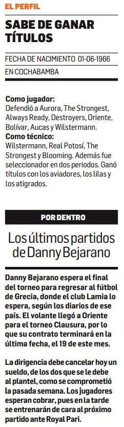 ¿Por qué se lo eligió? Los dirigentes albiverdes consideran que Soria tiene el perfil para asumir, es decir, es un técnico con carácter que impone la disciplina antes que todo y el esfuerzo físico para mostrar un equipo con mucha dinámica. Además, de lo que todos ya conocen de su currículo, ha sido campeón en tres ocasiones (con Wilstermann, Real Potosí y The Strongest) y es un técnico de selección (estuvo dos periodos con la Verde).