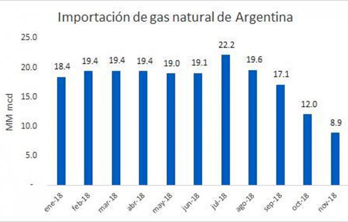De acuerdo a la estadística que presentó en su cuenta de Facebook, el volumen de envíos a la Argentina en noviembre pasado fue de 8.9 Millones de metros Cúbicos Día (MMmcd), mientras que en octubre llegó a 12 y en septiembre 17.1 MMmcd.