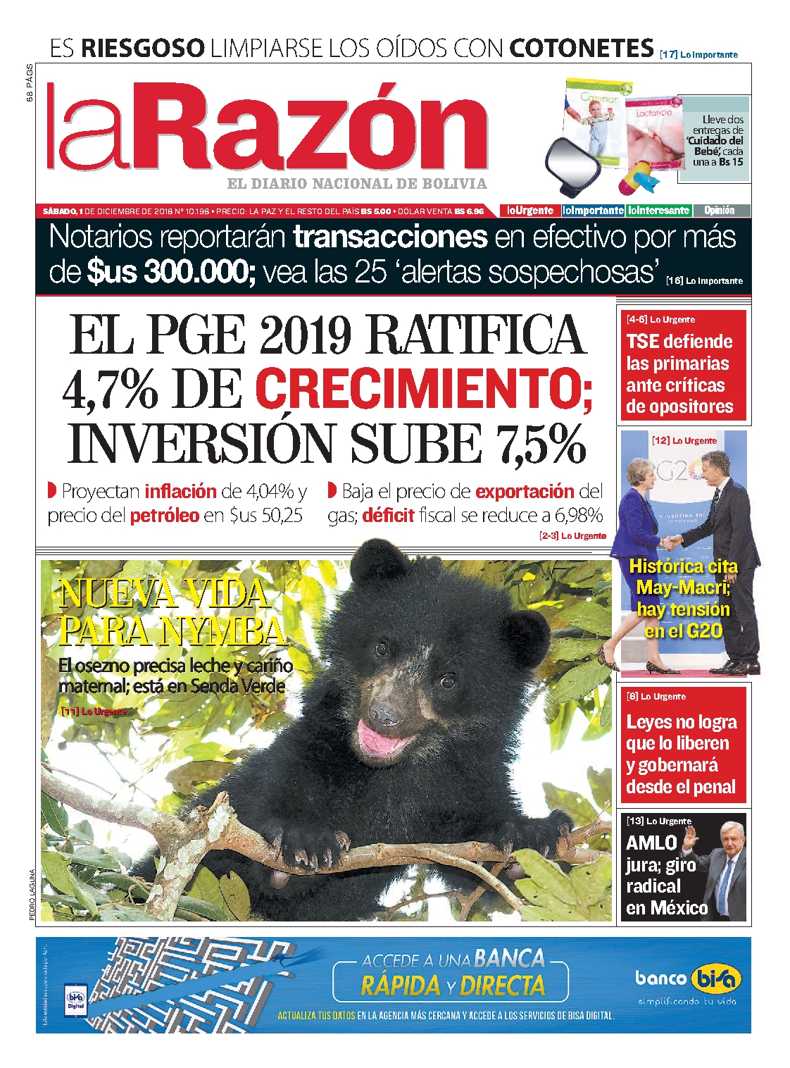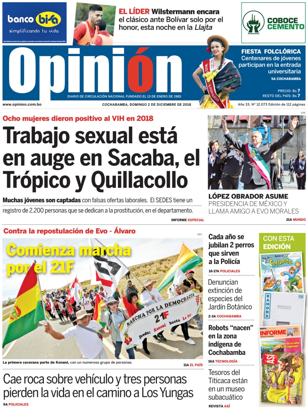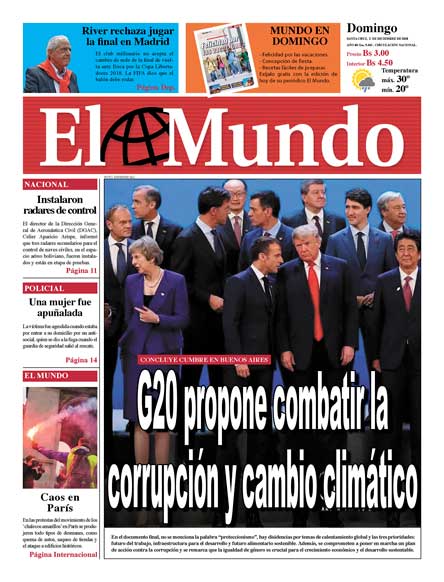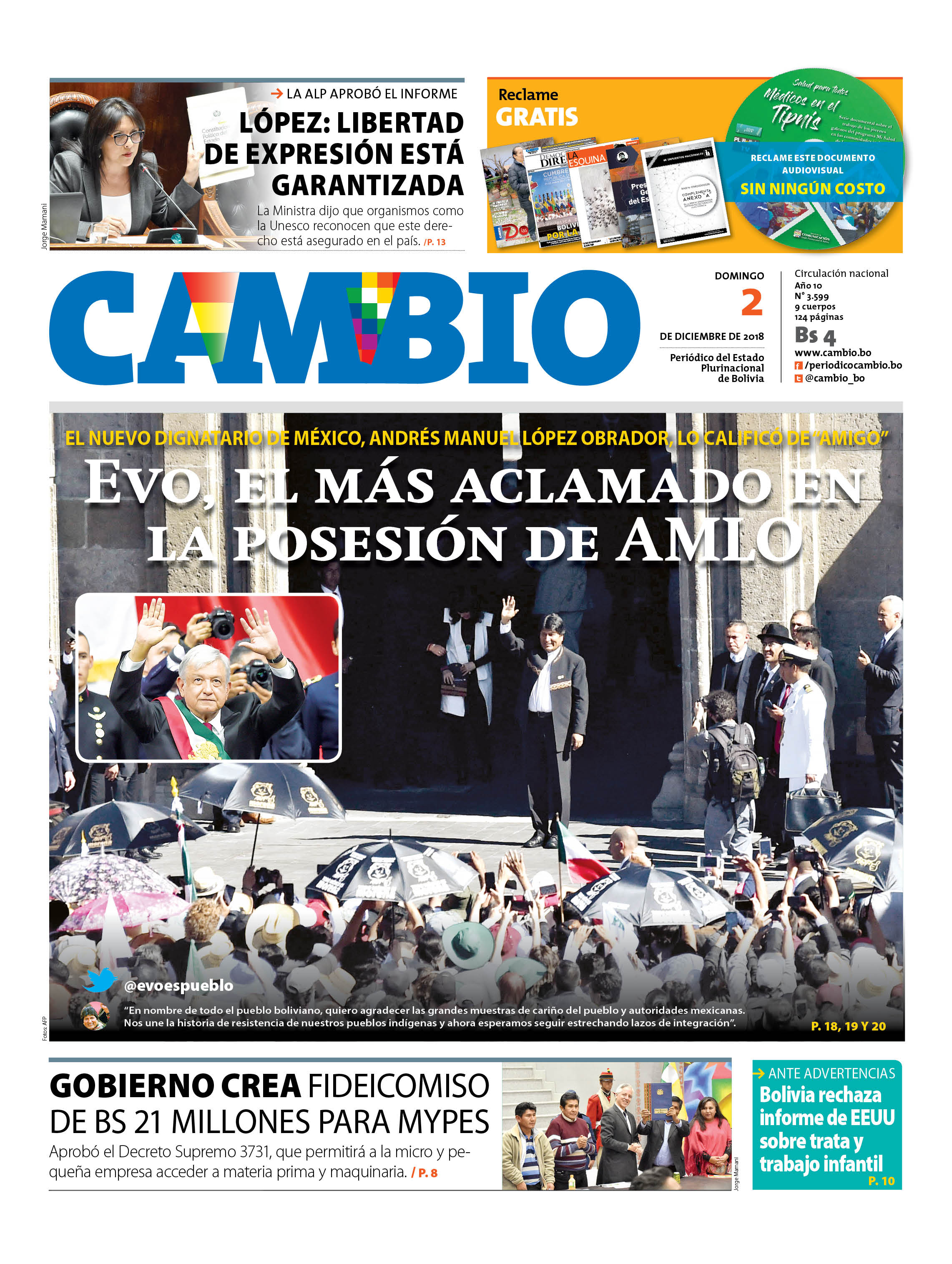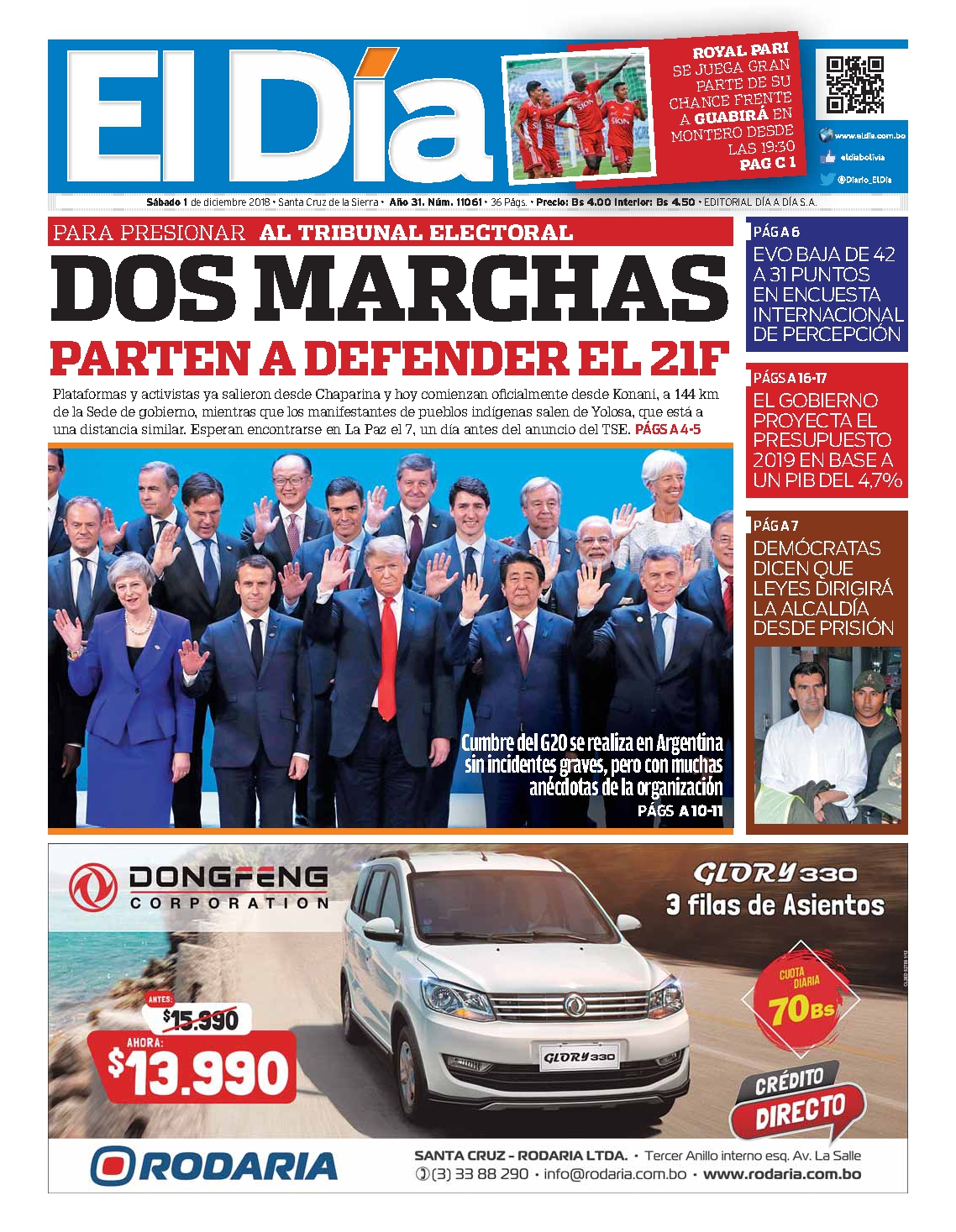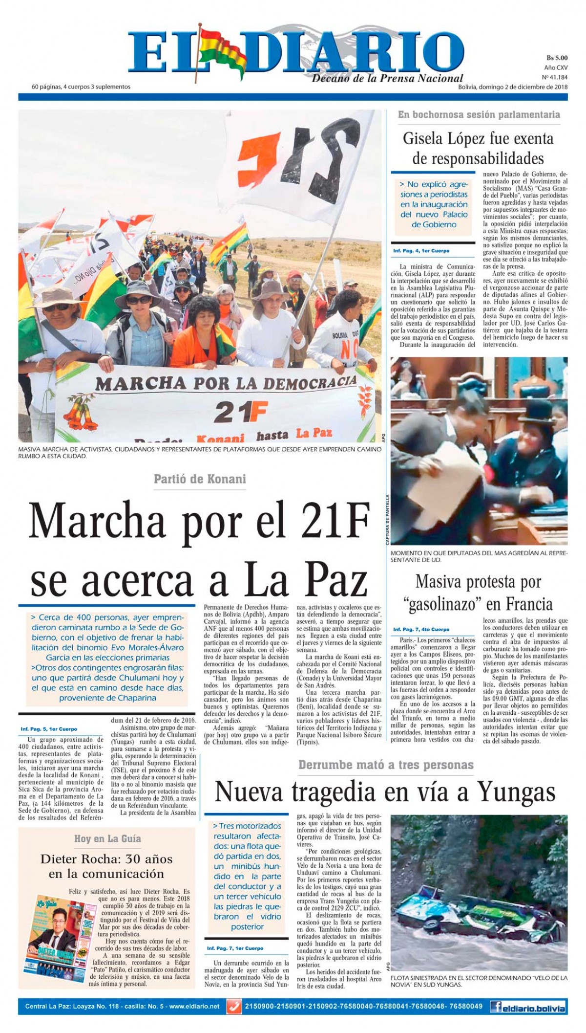 Portadas de periódicos de Bolivia del domingo 2 de diciembre de 2018Categorías MonitoreoEtiquetas , Portadas de periódicos 02/12/2018 El Deber – Los Tiempos – El Día – La Razón – Cambio – El Diario – Página Siete – Opinión