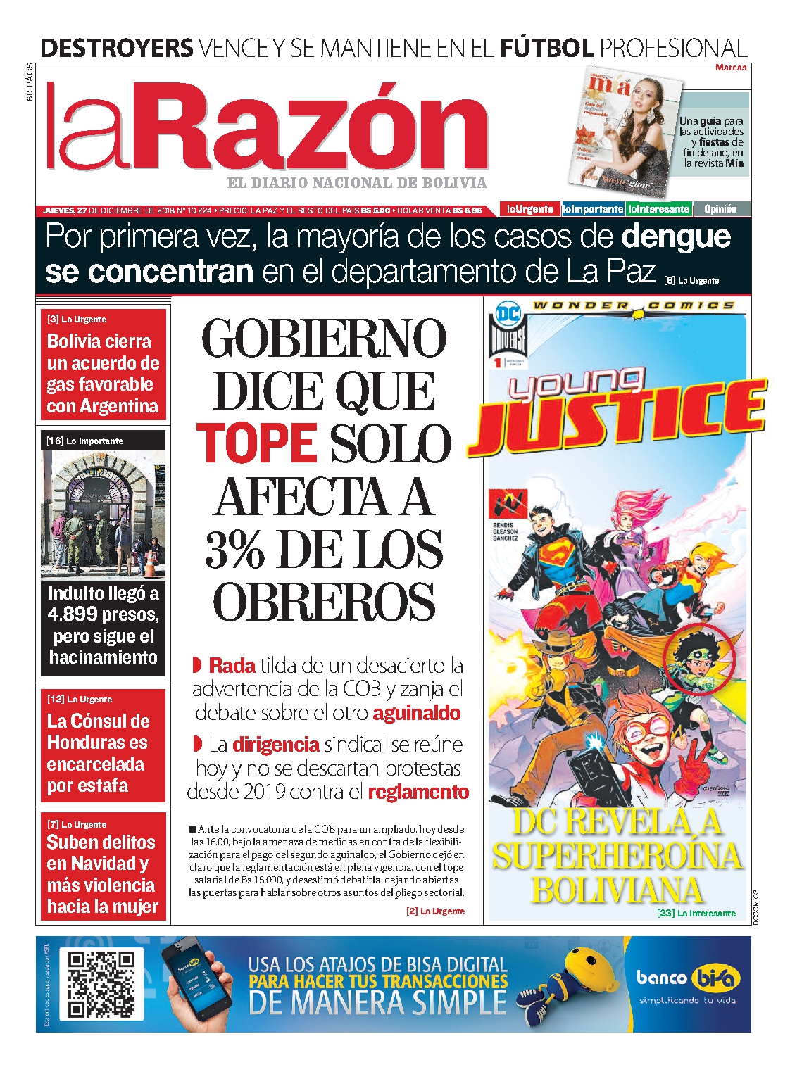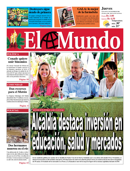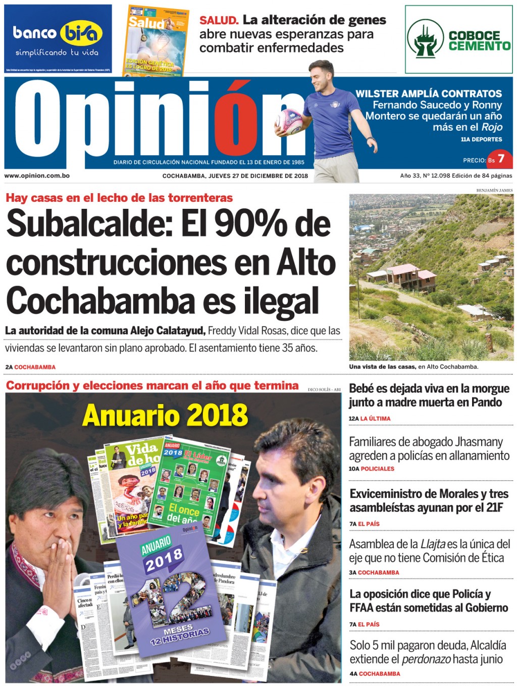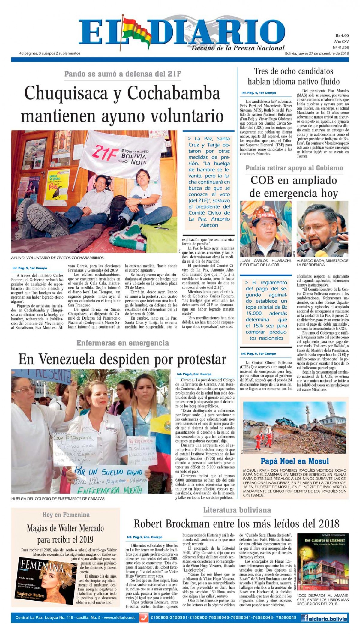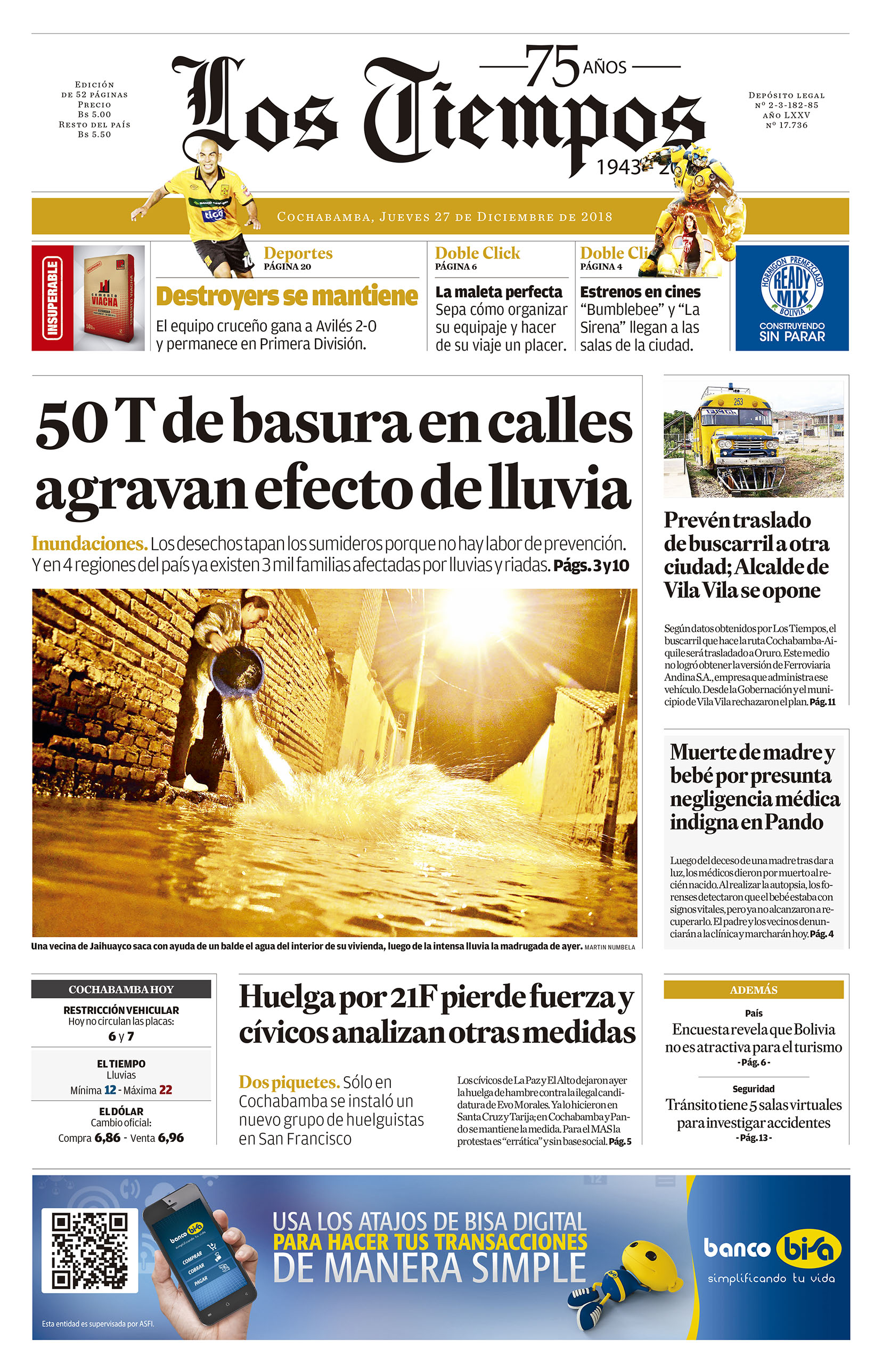 Portadas de periódicos de Bolivia del jueves 27 de diciembre de 2018Categorías MonitoreoEtiquetas , Portadas de periódicos 27/12/2018 El Deber – Los Tiempos – El Día – La Razón – Cambio – El Diario – Página Siete – Opinión