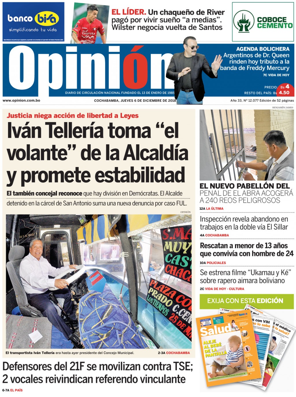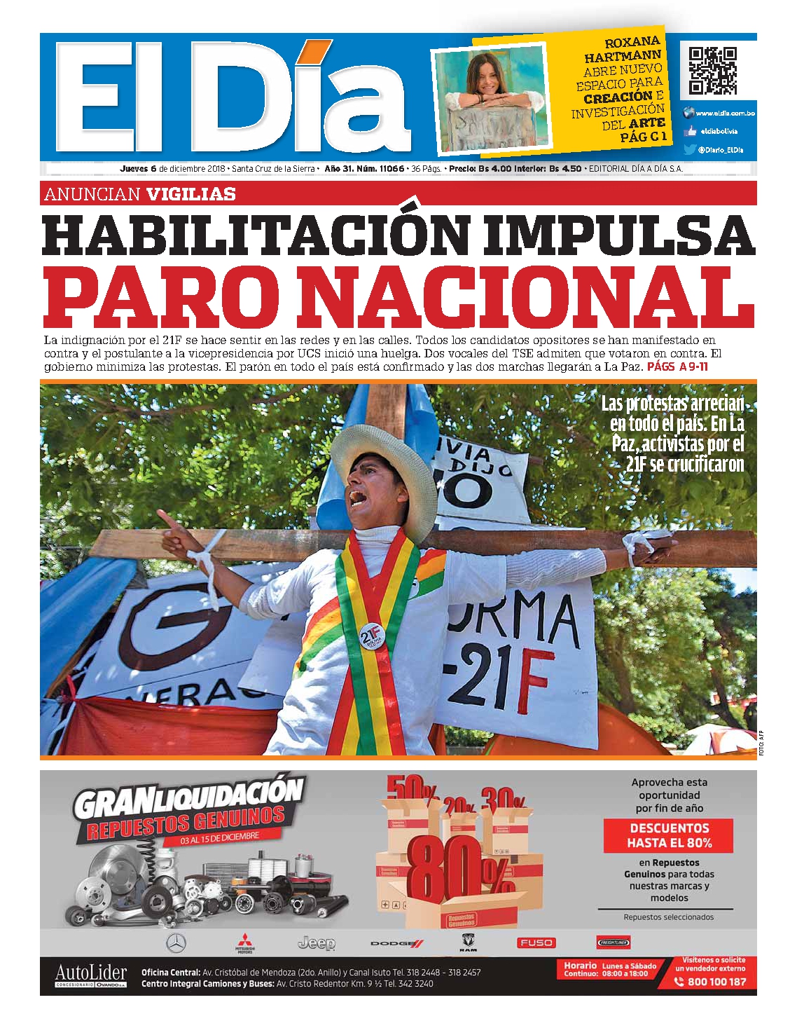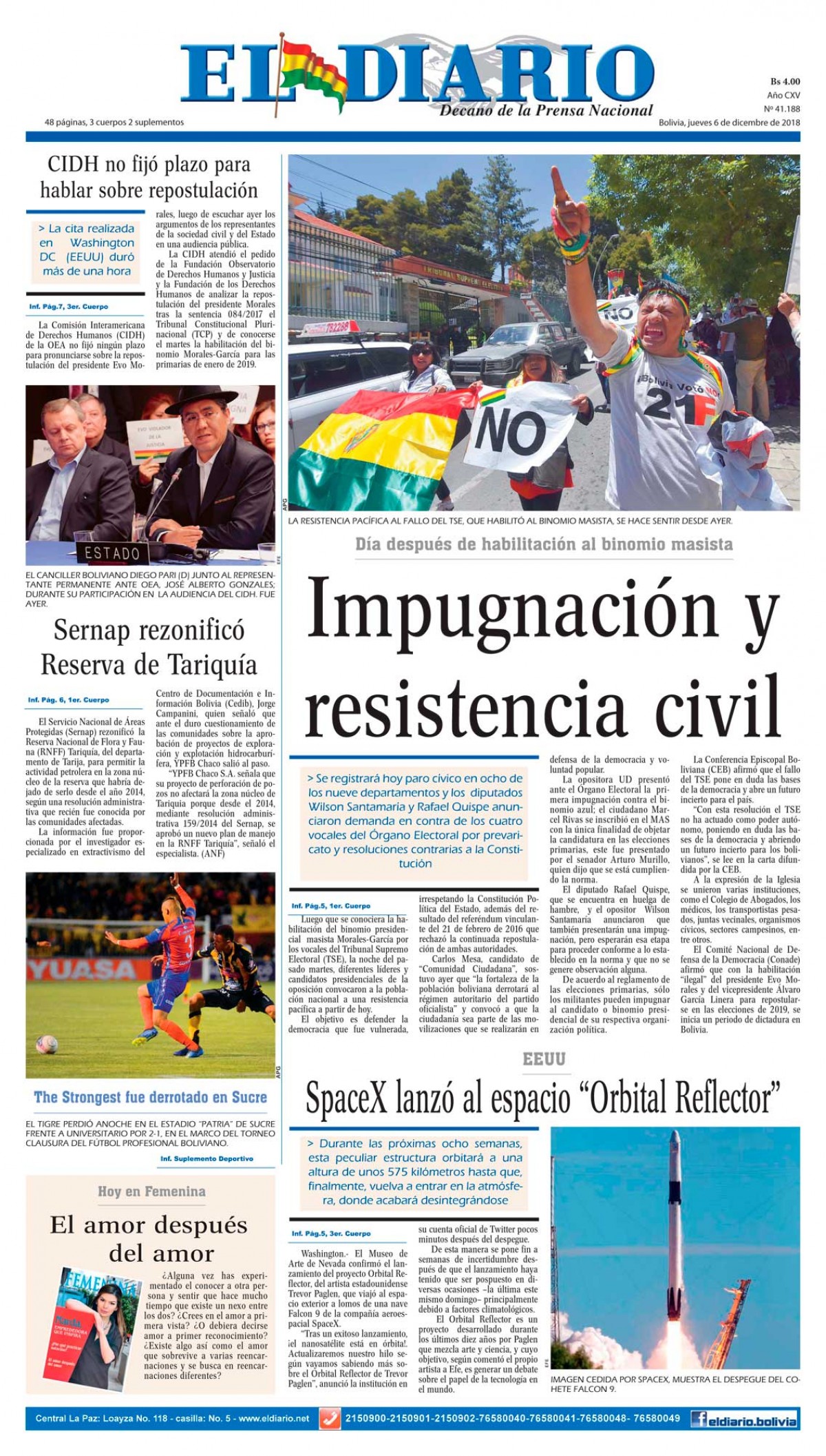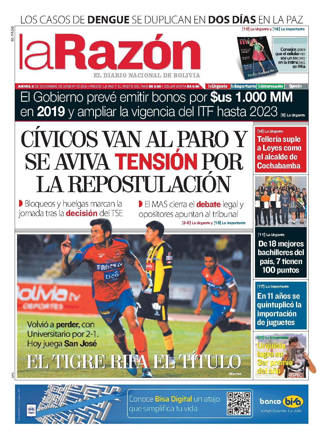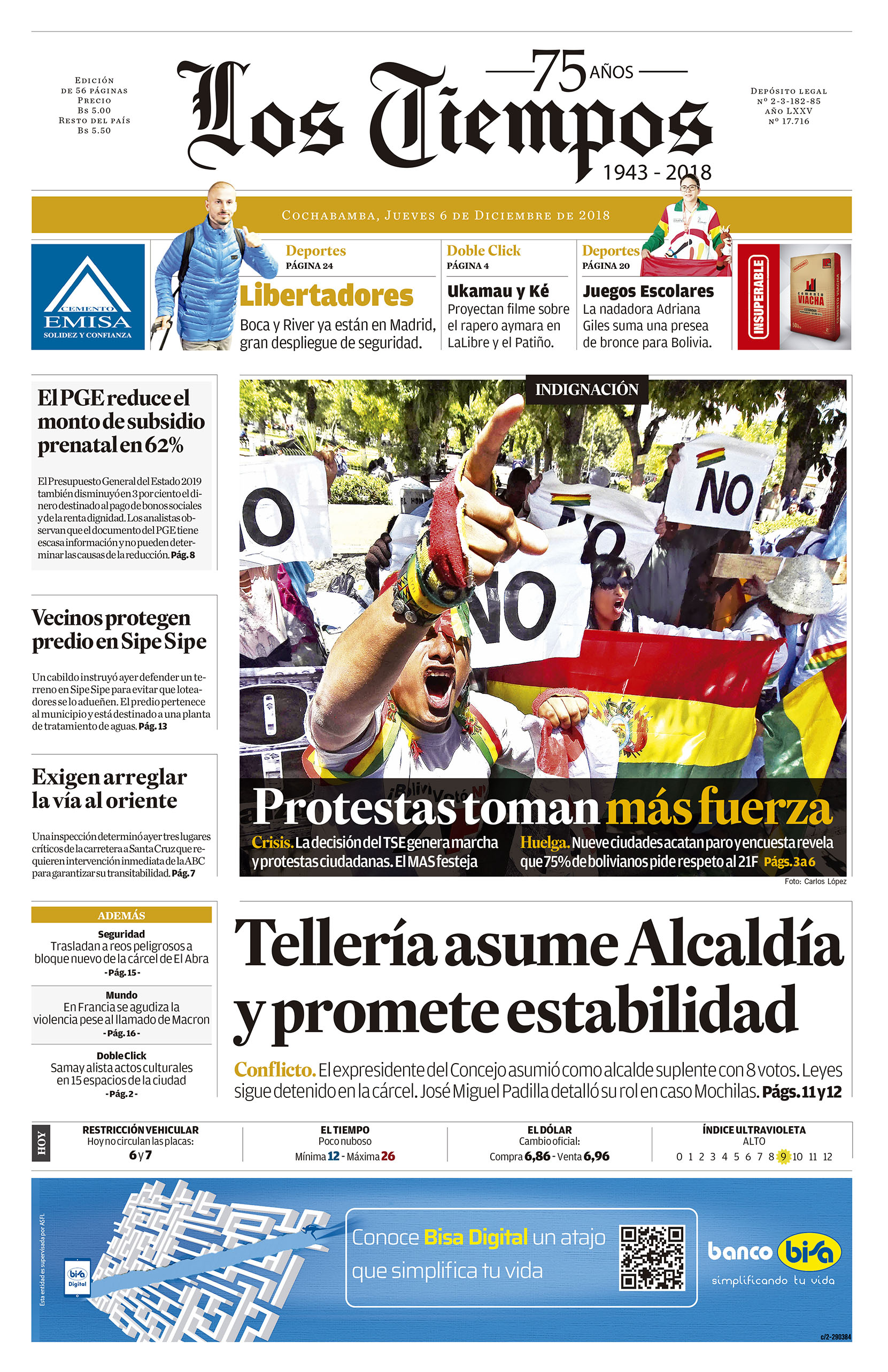 Portadas de periódicos de Bolivia del jueves 6 de diciembre de 2018Categorías MonitoreoEtiquetas , Portadas de periódicos 06/12/2018 El Deber – Los Tiempos – El Día – La Razón – Cambio – El Diario – Página Siete – Opinión
